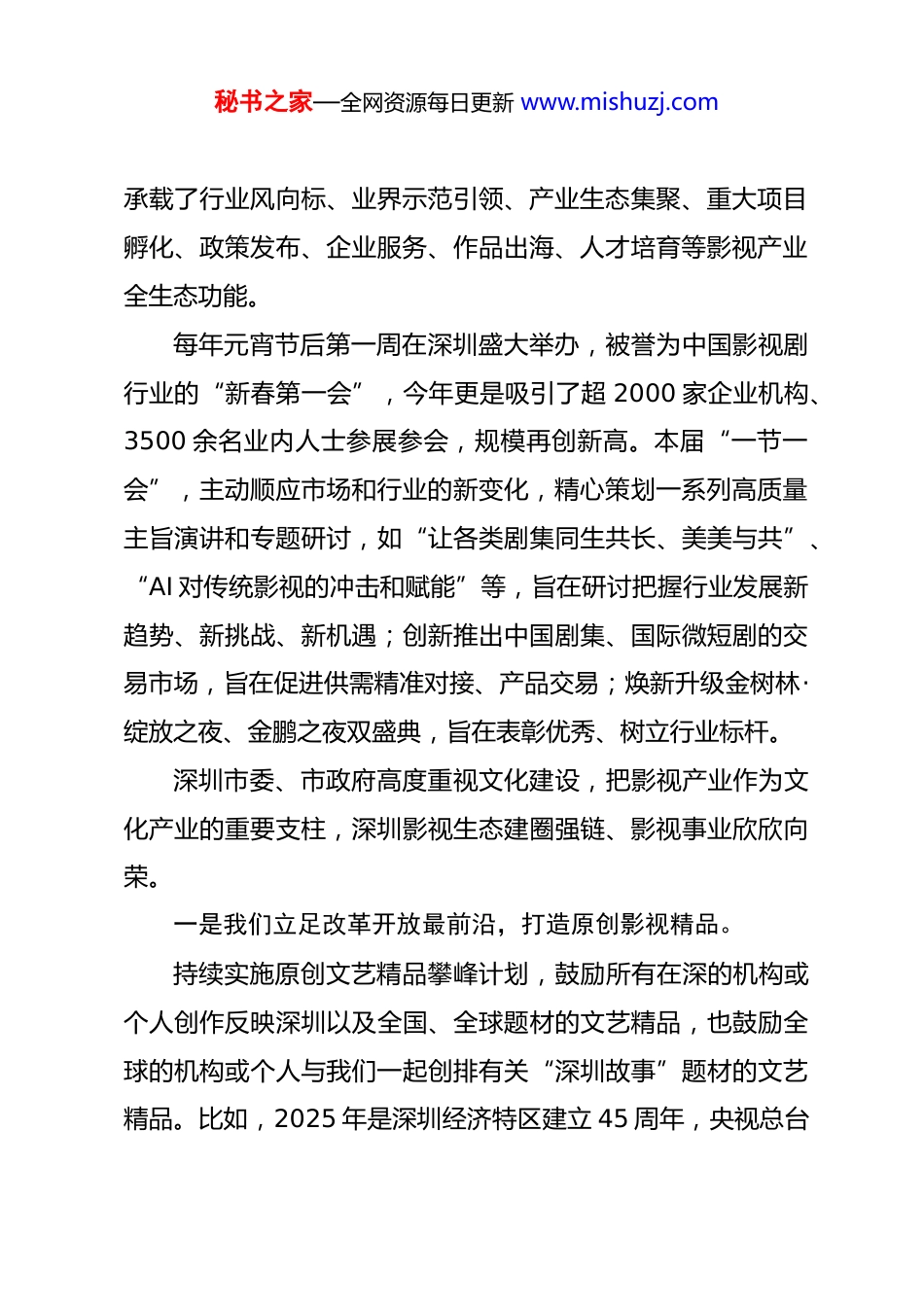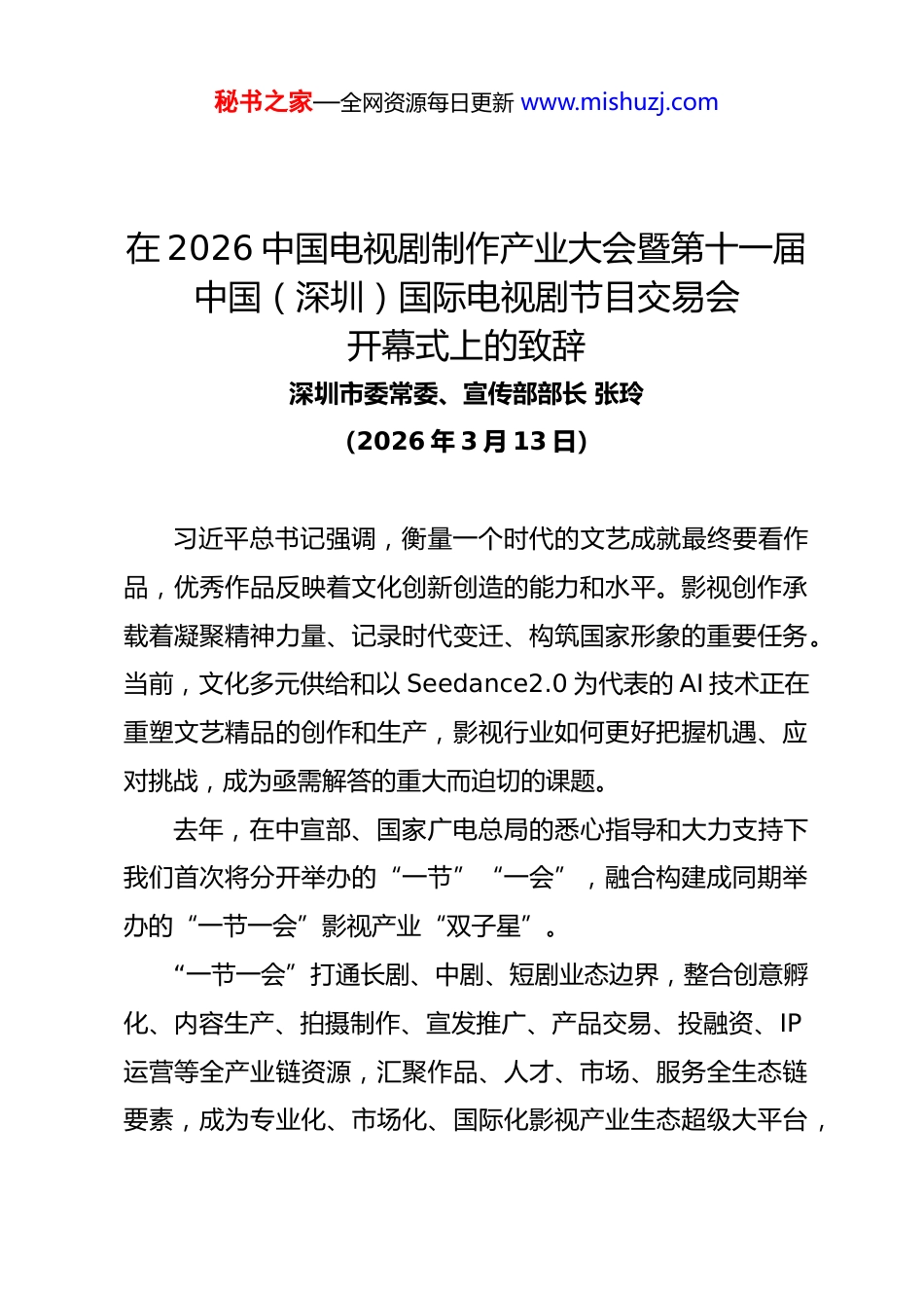 秘书之家—全网资源每日更新 www.mishuzj.com在 2026 中国电视剧制作产业大会暨第十一届中国(深圳)国际电视剧节目交易会开幕式上的致辞深圳市委常委、宣传部部长 张玲(2026 年 3 月 13 日)习近平总书记强调,衡量一个时代的文艺成就最终要看作品,优秀作品反映着文化创新创造的能力和水平。影视创作承载着凝聚精神力量、记录时代变迁、构筑国家形象的重要任务。当前,文化多元供给和以 Seedance2.0 为代表的 AI 技术正在重塑文艺精品的创作和生产,影视行业如何更好把握机遇、应对挑战,成为亟需解答的重大而迫切的课题。去年,在中宣部、国家广电总局的悉心指导和大力支持下我们首次将分开举办的“一节”“一会”,融合构建成同期举办的“一节一会”影视产业“双子星”。“一节一会”打通长剧、中剧、短剧业态边界,整合创意孵化、内容生产、拍摄制作、宣发推广、产品交易、投融资、IP 运营等全产业链资源,汇聚作品、人才、市场、服务全生态链要素,成为专业化、市场化、国际化影视产业生态超级大平台,秘书之家—全网资源每日更新 www.mishuzj.com承载了行业风向标、业界示范引领、产业生态集聚、重大项目孵化、政策发布、企业服务、作品出海、人才培育等影视产业全生态功能。每年元宵节后第一周在深圳盛大举办,被誉为中国影视剧行业的“新春第一会”,今年更是吸引了超 2000 家企业机构、3500 余名业内人士参展参会,规模再创新高。本届“一节一会”,主动顺应市场和行业的新变化,精心策划一系列高质量主旨演讲和专题研讨,如“让各类剧集同生共长、美美与共”、“AI 对传统影视的冲击和赋能”等,旨在研讨把握行业发展新趋势、新挑战、新机遇;创新推出中国剧集、国际微短剧的交易市场,旨在促进供需精准对接、产品交易;焕新升级金树林·绽放之夜、金鹏之夜双盛典,旨在表彰优秀、树立行业标杆。深圳市委、市政府高度重视文化建设,把影视产业作为文化产业的重要支柱,深圳影视生态建圈强链、影视事业欣欣向荣。一是我们立足改革开放最前沿,打造原创影视精品。持续实施原创文艺精品攀峰计划,鼓励所有在深的机构或个人创作反映深圳以及全国、全球题材的文艺精品,也鼓励全球的机构或个人与我们一起创排有关“深圳故事”题材的文艺精品。比如,2025 年是深圳经济特区建立 45 周年,央视总台秘书之家—全网资源每日更新 www.mishuzj.com与深圳市委宣传部共创原创的精品短剧集《奇迹》,是主力军进军短剧新赛道、引领精品化发展的一次有力探索和实践,以小人物、小切口,讲述深圳奇迹之城 45 年来波澜壮阔的发展历程,展现中国式现代化的万千气象。该剧登陆央视一套黄金时段跨年播出,刷新短剧大屏最高收视纪录,荣获中国电视剧年度盛典“年度特别荣誉”殊荣。比如,梁振华老师的深圳完美青春影视有限公司,已在深圳拍摄完成《有你的时光里》等 3 部电视剧。比如,郭靖宇老师的深圳长信影视传媒有限公司,在深圳拍摄、讲述深圳故事的《我的山与海》,正在央视八套热播。比如,张艺谋导演执导的春节档电影《惊蛰无声》,由深圳支持并联合出品,全程在深圳取景拍摄,全国热映,截至目前票房已接近 13 亿。比如,张国立老师在深圳落户龙马社,运营长守戏剧谷,孵化和创排文艺精品。接下来,我们将持续深耕影视精品,在 13 日晚的金树林·绽放之夜,央视再次携手深圳,启动“我就是奇迹”总台央地(深圳)共创精品中短剧创作大会,全力将深圳建设为全国精品中短剧创作高地;此外,我们紧扣香港回归 30 周年、建军100 周年、改革开放 50 周年等重大时间节点,联合头部影视秘书之家—全网资源每日更新 www.mishuzj.com机构与业内专家,正在精心策划孵化一系列重大主题精品剧目。二是我们依托“中国硅谷”硬实力,构建优质影视生态。近年来,深圳在影视政策支撑、科技赋能、市场培育、拍摄基地建设、协拍服务、装备制造、后期制作、宣传发行、人才引育、作品出海等关键领域集中发力,去年出台了《深圳市推动数字创意产业高质量发展的若干措施》,配套专项资金,对优秀影视作品给予最高 2000 万元资助;积极推动新质影像产业聚链成势,涌...