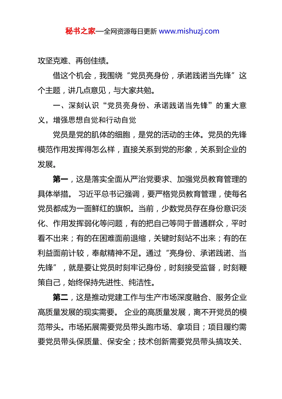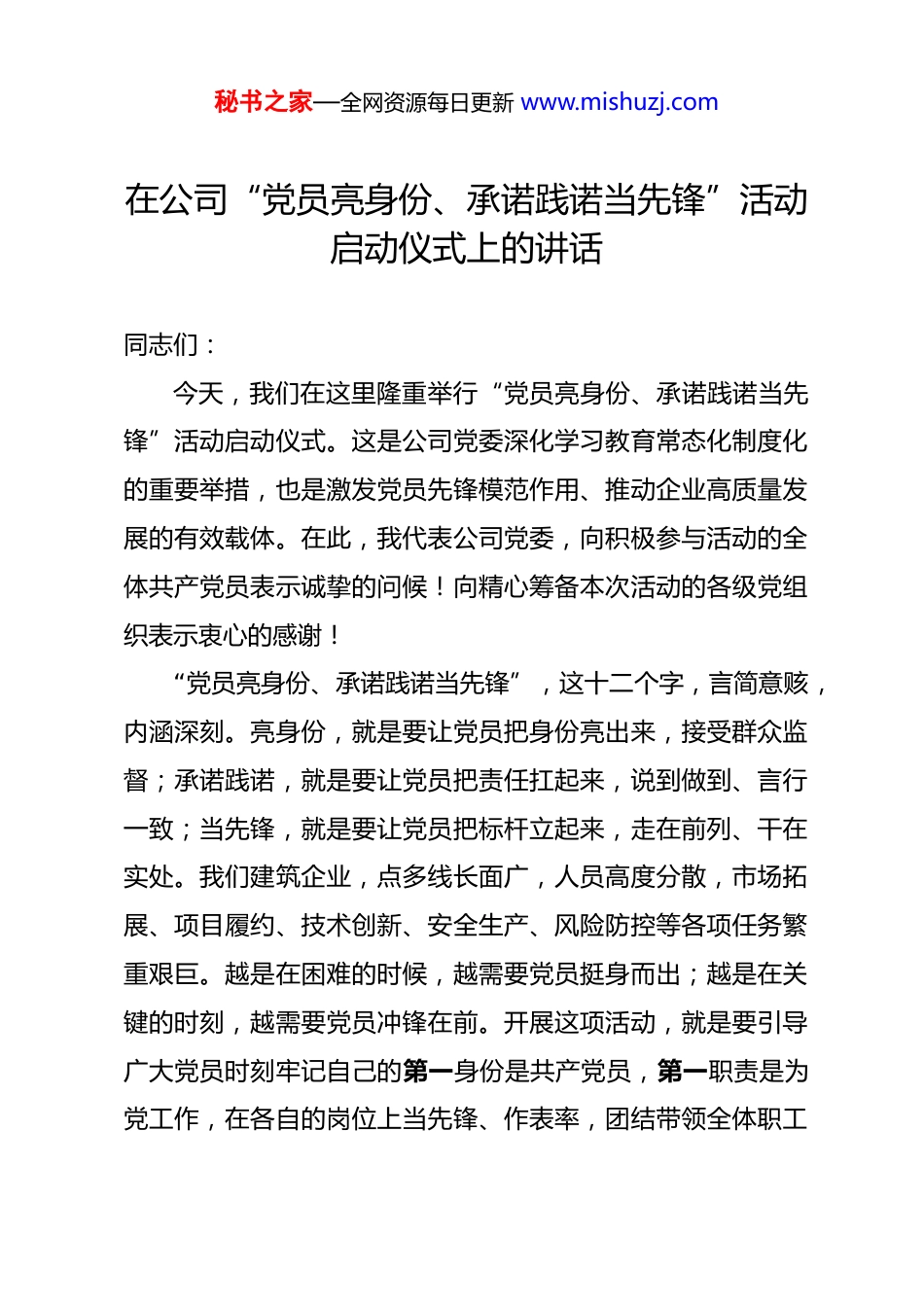 秘书之家—全网资源每日更新 www.mishuzj.com在公司“党员亮身份、承诺践诺当先锋”活动启动仪式上的讲话 同志们:今天,我们在这里隆重举行“党员亮身份、承诺践诺当先锋”活动启动仪式。这是公司党委深化学习教育常态化制度化的重要举措,也是激发党员先锋模范作用、推动企业高质量发展的有效载体。在此,我代表公司党委,向积极参与活动的全体共产党员表示诚挚的问候!向精心筹备本次活动的各级党组织表示衷心的感谢!“党员亮身份、承诺践诺当先锋”,这十二个字,言简意赅,内涵深刻。亮身份,就是要让党员把身份亮出来,接受群众监督;承诺践诺,就是要让党员把责任扛起来,说到做到、言行一致;当先锋,就是要让党员把标杆立起来,走在前列、干在实处。我们建筑企业,点多线长面广,人员高度分散,市场拓展、项目履约、技术创新、安全生产、风险防控等各项任务繁重艰巨。越是在困难的时候,越需要党员挺身而出;越是在关键的时刻,越需要党员冲锋在前。开展这项活动,就是要引导广大党员时刻牢记自己的第一身份是共产党员,第一职责是为党工作,在各自的岗位上当先锋、作表率,团结带领全体职工秘书之家—全网资源每日更新 www.mishuzj.com攻坚克难、再创佳绩。借这个机会,我围绕“党员亮身份,承诺践诺当先锋”这个主题,讲几点意见,与大家共勉。一、深刻认识“党员亮身份、承诺践诺当先锋”的重大意义,增强思想自觉和行动自觉党员是党的肌体的细胞,是党的活动的主体。党员的先锋模范作用发挥得怎么样,直接关系到党的形象,关系到企业的发展。第一,这是落实全面从严治党要求、加强党员教育管理的具体举措。 习近平总书记强调,要严格党员教育管理,使每名党员都成为一面鲜红的旗帜。当前,少数党员存在身份意识淡化、作用发挥弱化等问题,有的把自己等同于普通群众,平时看不出来;有的在困难面前退缩,关键时刻站不出来;有的在利益面前计较,奉献精神不足。通过“亮身份、承诺践诺、当先锋”,就是要让党员时刻牢记身份,时刻接受监督,时刻鞭策自己,始终保持先进性、纯洁性。第二,这是推动党建工作与生产市场深度融合、服务企业高质量发展的现实需要。 企业的高质量发展,离不开党员的模范带头。市场拓展需要党员带头跑市场、拿项目;项目履约需要党员带头保质量、保安全;技术创新需要党员带头搞攻关、秘书之家—全网资源每日更新 www.mishuzj.com破难题;风险防控需要党员带头守底线、防隐患。通过“亮身份、承诺践诺、当先锋”,可以激励党员在急难险重任务中勇挑重担,在平凡岗位上创造不平凡的业绩,把党的政治优势、组织优势转化为发展优势、竞争优势。第三,这是密切党群关系、凝聚发展合力的重要途径。 党员是党组织联系群众的桥梁和纽带。党员的一言一行,群众看在眼里、记在心里。党员形象好,党组织就有威信;党员作用好,群众就有信心。通过“亮身份、承诺践诺、当先锋”,可以让群众看到党员就在身边,感受到党的温暖和力量,从而更加自觉地团结在党组织周围,形成心往一处想、劲往一处使的强大合力。第四,这是锤炼党性、提升党员素质的有效载体。 “亮身份”是一种自我加压,“承诺践诺”是一种自我约束,“当先锋”是一种自我超越。通过公开承诺、践行承诺,党员可以时时对照、处处警醒,不断反思自己的言行,改进自己的不足,提升自己的素质。这个过程,就是党性锻炼的过程,就是自我完善、自我提高的过程。二、准确把握“党员亮身份、承诺践诺当先锋”的内涵要求,做到真亮、真诺、真做“亮身份、承诺践诺、当先锋”是一个有机整体,要环环相秘书之家—全网资源每日更新 www.mishuzj.com扣、步步深入。第一,亮身份要“亮”出底气、“亮”出责任。 亮身份不是简单地佩戴党徽,而是要在思想深处亮明党员身份。一是亮出政治身份。在参加党内活动、重要会议、志愿服务时,要自觉佩戴党徽,展示党员形象。在工作岗位上,要设置“党员岗”标识,把党员身份亮出来。二是亮出职责身份。要结合岗位职责,明确自己的责任区、示范岗,让群众知道“这个岗位是党员在负责”“这个区域是党员在包保”。三是亮出承诺身份。要将自己的承诺事项公开...