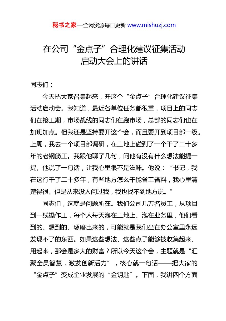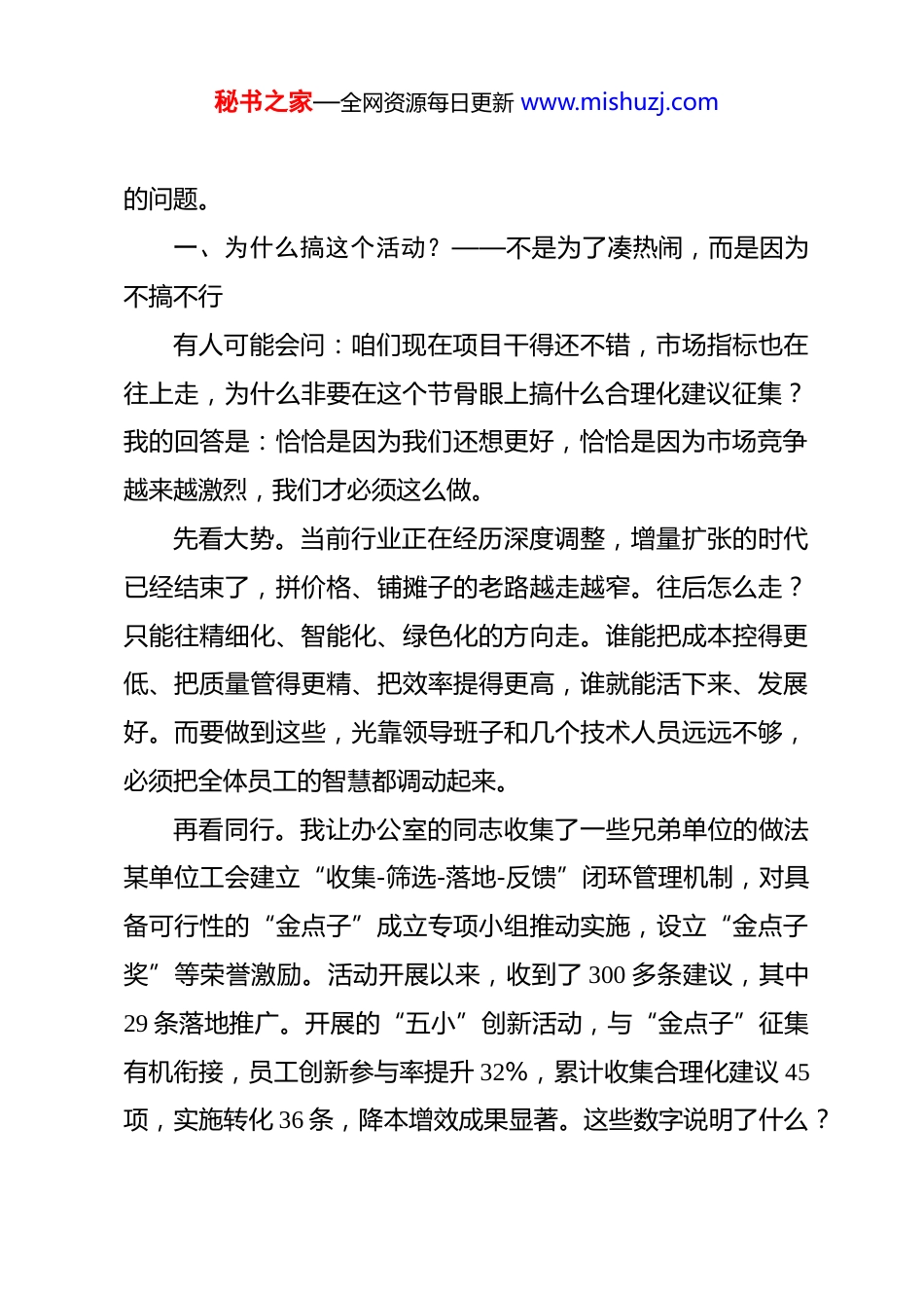 秘书之家—全网资源每日更新 www.mishuzj.com在公司“金点子”合理化建议征集活动启动大会上的讲话 同志们:今天把大家召集起来,开这个“金点子”合理化建议征集活动启动会。我知道,最近各单位任务都很重,项目上的同志们在抢工期,市场战线的同志们在跑市场,总部的同志们也在加班加点。但我还是坚持要开这个会,而且要开到项目部一级。上周,我去一个项目部调研,在工地上碰到了一个干了二十多年的老钢筋工。我跟他聊了几句,问他有没有什么想法能提一提。他说了一句话,让我心里很不是滋味。他说:“书记,我在这行干了二十多年,有些地方怎么干能省工省料,我心里清楚得很。但是从来没人问过我,我也找不到地方说。”同志们,这就是问题所在。我们公司几万名员工,从项目到一线操作工,每个人每天泡在工地上、泡在业务里,他们看到的、想到的、琢磨出来的,可能就是我们坐在办公室里永远发现不了的东西。如果这些想法、这些点子能够被收集起来、用起来,那会是多大的财富?所以今天这个会,主题就是“汇聚全员智慧,激发创新活力”,核心就一句话——把大家的“金点子”变成企业发展的“金钥匙”。下面,我讲四个方面秘书之家—全网资源每日更新 www.mishuzj.com的问题。一、为什么搞这个活动?——不是为了凑热闹,而是因为不搞不行有人可能会问:咱们现在项目干得还不错,市场指标也在往上走,为什么非要在这个节骨眼上搞什么合理化建议征集?我的回答是:恰恰是因为我们还想更好,恰恰是因为市场竞争越来越激烈,我们才必须这么做。先看大势。当前行业正在经历深度调整,增量扩张的时代已经结束了,拼价格、铺摊子的老路越走越窄。往后怎么走?只能往精细化、智能化、绿色化的方向走。谁能把成本控得更低、把质量管得更精、把效率提得更高,谁就能活下来、发展好。而要做到这些,光靠领导班子和几个技术人员远远不够,必须把全体员工的智慧都调动起来。 再看同行。我让办公室的同志收集了一些兄弟单位的做法某单位工会建立“收集-筛选-落地-反馈”闭环管理机制,对具备可行性的“金点子”成立专项小组推动实施,设立“金点子奖”等荣誉激励。活动开展以来,收到了 300 多条建议,其中29 条落地推广。开展的“五小”创新活动,与“金点子”征集有机衔接,员工创新参与率提升 32%,累计收集合理化建议 45项,实施转化 36 条,降本增效成果显著。这些数字说明了什么?秘书之家—全网资源每日更新 www.mishuzj.com说明每一家优秀的企业,都在想方设法把职工的智慧变成企业的财富。我们如果还停留在“领导拍板、下面执行”的老路子上,就要落后了。 再看我们自己。说实话,我们公司不缺人才,不缺智慧,缺的是一个让大家把智慧亮出来的平台和机制。我举个例子。去年有个项目,在混凝土浇筑过程中,一个老工长提出来,说这个浇筑顺序可以调一调,能省不少料。项目部采纳了,结果那个项目光材料费就省了几十万。但这个建议,是人家工长在食堂吃饭时随口说出来的。如果不是恰好被项目经理听到了,这个金点子可能就烂在肚子里了。 同志们想想,我们的几千个项目上,还有多少这样的“金点子”没有被听到?还有多少一线的智慧被浪费了?这不是小事。一个项目省几十万,十个项目就是几百万,一百个项目呢?所以,搞“金点子”合理化建议征集,不是凑热闹,不是搞形式,而是企业发展到这个阶段的必然要求,是我们必须补齐的一块短板。二、建议往哪儿提?——聚焦主业,对准痛点,用对地方 既然要搞,那大家的问题就来了:到底提什么?是不是什么都能提?什么都能提,但我们有重点方向。我给大家画个圈,主要围绕四个方面。秘书之家—全网资源每日更新 www.mishuzj.com第一,围绕降本增效提建议。 这是我们当前最紧迫的任务。现在的项目利润空间越来越薄,材料价格涨了、人工成本涨了。怎么办?只能靠精细管理和技术创新来挤空间。具体来说,可以从这些方面入手:材料采购和管理怎么更省?能不能多搞点集采、能不能推广“以旧代新”、能不能减少材料损耗?施工工艺怎么优化?哪些工序可以合并?哪些传统做法可以改一改?机械设备怎么用更经济?能不能提高设备利用率、...