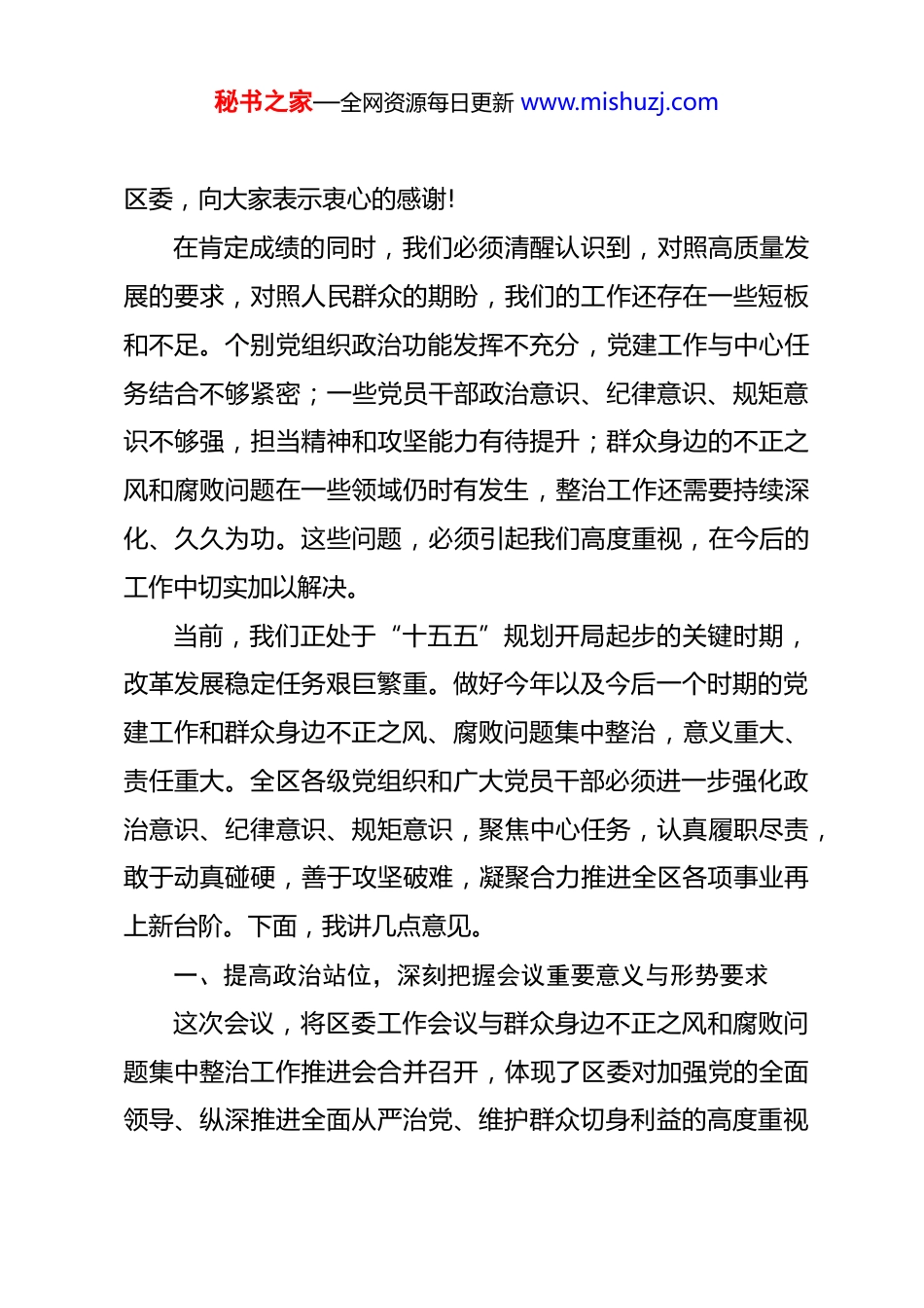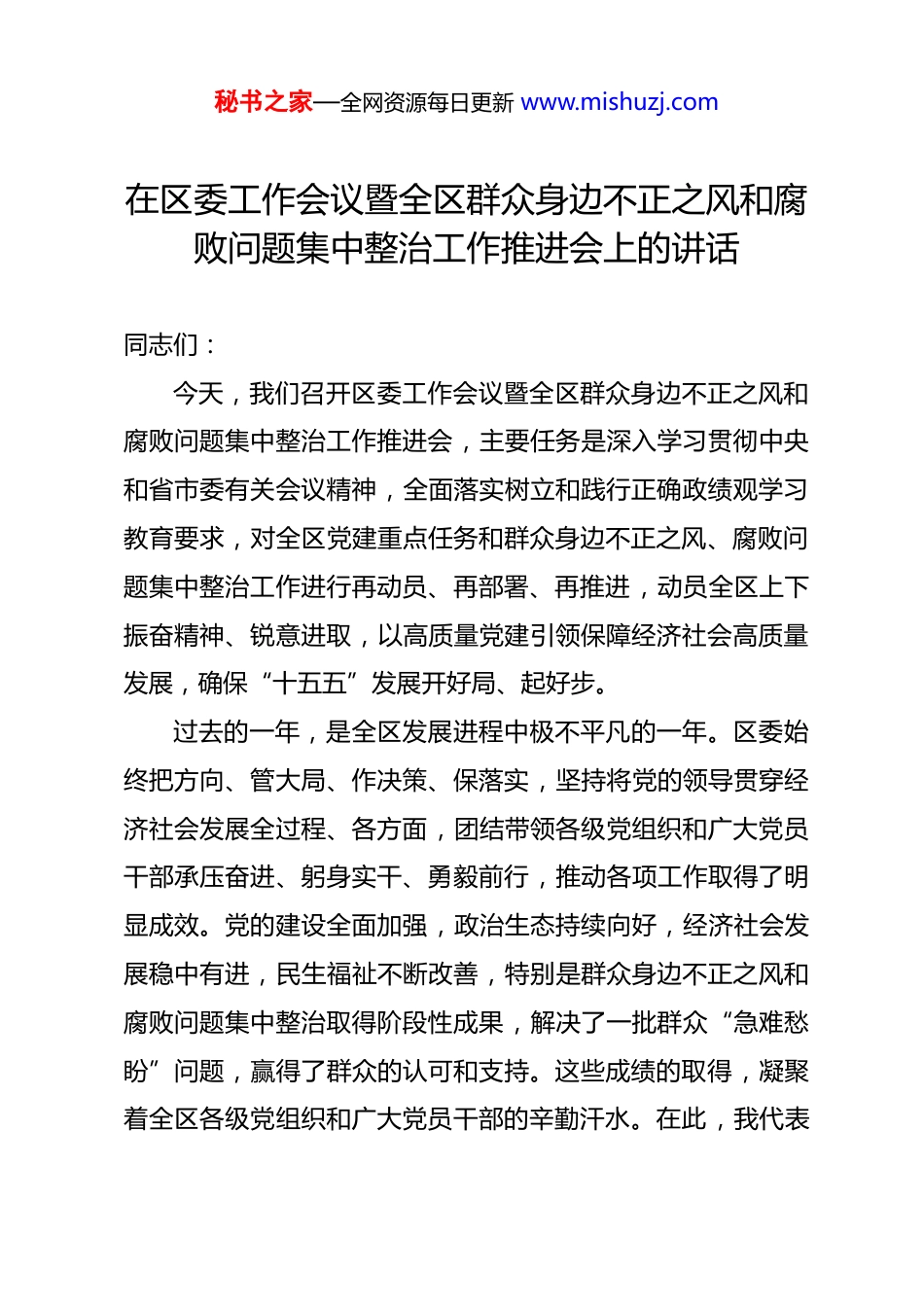 秘书之家—全网资源每日更新 www.mishuzj.com在区委工作会议暨全区群众身边不正之风和腐败问题集中整治工作推进会上的讲话 同志们:今天,我们召开区委工作会议暨全区群众身边不正之风和腐败问题集中整治工作推进会,主要任务是深入学习贯彻中央和省市委有关会议精神,全面落实树立和践行正确政绩观学习教育要求,对全区党建重点任务和群众身边不正之风、腐败问题集中整治工作进行再动员、再部署、再推进,动员全区上下振奋精神、锐意进取,以高质量党建引领保障经济社会高质量发展,确保“十五五”发展开好局、起好步。过去的一年,是全区发展进程中极不平凡的一年。区委始终把方向、管大局、作决策、保落实,坚持将党的领导贯穿经济社会发展全过程、各方面,团结带领各级党组织和广大党员干部承压奋进、躬身实干、勇毅前行,推动各项工作取得了明显成效。党的建设全面加强,政治生态持续向好,经济社会发展稳中有进,民生福祉不断改善,特别是群众身边不正之风和腐败问题集中整治取得阶段性成果,解决了一批群众“急难愁盼”问题,赢得了群众的认可和支持。这些成绩的取得,凝聚着全区各级党组织和广大党员干部的辛勤汗水。在此,我代表秘书之家—全网资源每日更新 www.mishuzj.com区委,向大家表示衷心的感谢!在肯定成绩的同时,我们必须清醒认识到,对照高质量发展的要求,对照人民群众的期盼,我们的工作还存在一些短板和不足。个别党组织政治功能发挥不充分,党建工作与中心任务结合不够紧密;一些党员干部政治意识、纪律意识、规矩意识不够强,担当精神和攻坚能力有待提升;群众身边的不正之风和腐败问题在一些领域仍时有发生,整治工作还需要持续深化、久久为功。这些问题,必须引起我们高度重视,在今后的工作中切实加以解决。当前,我们正处于“十五五”规划开局起步的关键时期,改革发展稳定任务艰巨繁重。做好今年以及今后一个时期的党建工作和群众身边不正之风、腐败问题集中整治,意义重大、责任重大。全区各级党组织和广大党员干部必须进一步强化政治意识、纪律意识、规矩意识,聚焦中心任务,认真履职尽责,敢于动真碰硬,善于攻坚破难,凝聚合力推进全区各项事业再上新台阶。下面,我讲几点意见。一、提高政治站位,深刻把握会议重要意义与形势要求这次会议,将区委工作会议与群众身边不正之风和腐败问题集中整治工作推进会合并召开,体现了区委对加强党的全面领导、纵深推进全面从严治党、维护群众切身利益的高度重视秘书之家—全网资源每日更新 www.mishuzj.com和系统部署。我们必须从政治和全局的高度,深刻认识开好这次会议、抓好工作落实的极端重要性。首先,这是贯彻中央和省市委决策部署的政治要求。党中央高度重视党的建设和反腐败斗争,特别是将整治群众身边不正之风和腐败问题作为一项重要政治任务持续推进。省市委也对相关工作进行了具体安排。我们召开这次会议,就是要对标对表上级精神,不折不扣抓好贯彻落实,确保中央和省市委的决策部署在 XX 区落地生根、开花结果。其次,这是推动“十五五”良好开局的根本保障。今年是“十五五”规划的开局之年,开局关乎全局,起步决定后势。能否实现经济社会高质量发展,关键在党,关键在人。只有把党的建设得更加坚强有力,只有营造风清气正的政治生态和干事创业的良好环境,才能凝聚起攻坚克难、砥砺奋进的强大合力,为“十五五”开好局、起好步提供坚强的政治保证和组织保障。再次,这是践行以人民为中心发展思想的实际行动。人民群众反对什么、痛恨什么,我们就要坚决防范和纠正什么。群众身边不正之风和腐败问题,直接侵害群众利益,侵蚀党的执政根基,人民群众反映强烈。持续深化集中整治,是践行党的根本宗旨、维护社会公平正义、增进民生福祉的具体举措,关秘书之家—全网资源每日更新 www.mishuzj.com乎人心向背,关乎事业兴衰。二、聚焦主责主业,以高质量党建引领保障高质量发展党的建设工作是各项事业发展的“根”和“魂”。全区各级党组织必须牢固树立抓好党建是最大政绩的理念,把党的政治建设摆在首位,不断提升党建质量,为全区追赶发展提供坚强保证。第一,旗帜鲜明讲政治,在把准方...