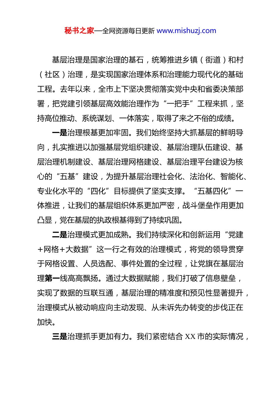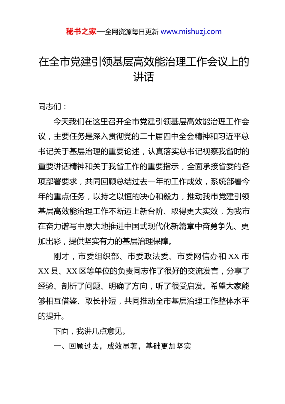 秘书之家—全网资源每日更新 www.mishuzj.com在全市党建引领基层高效能治理工作会议上的讲话同志们:今天我们在这里召开全市党建引领基层高效能治理工作会议,主要任务是深入贯彻党的二十届四中全会精神和习近平总书记关于基层治理的重要论述,认真落实总书记视察我省时的重要讲话精神和关于我省工作的重要指示,全面承接省委的各项部署要求,共同回顾总结过去一年的工作成效,系统部署今年的重点任务,以持之以恒的决心和毅力,推动我市党建引领基层高效能治理工作不断迈上新台阶、取得更大实效,为我市在奋力谱写中原大地推进中国式现代化新篇章中奋勇争先、更加出彩,提供坚实有力的基层治理保障。刚才,市委组织部、市委政法委、市委网信办和 XX 市XX 县、XX 区等单位的负责同志作了很好的交流发言,分享了经验、剖析了问题、明确了方向,听了很受启发。希望大家能够相互借鉴、取长补短,共同推动全市基层治理工作整体水平的提升。下面,我讲几点意见。一、回顾过去,成效显著,基础更加坚实秘书之家—全网资源每日更新 www.mishuzj.com基层治理是国家治理的基石,统筹推进乡镇(街道)和村(社区)治理,是实现国家治理体系和治理能力现代化的基础工程。去年以来,全市上下坚决贯彻落实党中央和省委决策部署,把党建引领基层高效能治理作为“一把手”工程来抓,坚持高位推动、系统谋划、一体落实,取得了来之不俗的成绩。一是治理根基更加牢固。我们始终坚持大抓基层的鲜明导向,扎实推进以加强基层党组织建设、基层治理队伍建设、基层治理机制建设、基层治理网格建设、基层治理平台建设为核心的“五基”建设,为提升基层治理社会化、法治化、智能化、专业化水平的“四化”目标提供了坚实支撑。“五基四化”一体推进,让我们的基层组织体系更加严密,战斗堡垒作用更加凸显,党在基层的执政根基得到了持续巩固。二是治理模式更加成熟。我们持续深化和创新运用“党建+网格+大数据”这一行之有效的治理模式,将党的领导贯穿于网格设置、人员选配、事件处置的全过程,让党旗在基层治理第一线高高飘扬。通过大数据赋能,我们打破了信息壁垒,实现了数据的互联互通,基层治理的精准度和预见性显著提升,治理模式从被动响应向主动发现、从未诉先办转变的步伐正在加快。三是治理抓手更加有力。我们紧密结合 XX 市的实际情况,秘书之家—全网资源每日更新 www.mishuzj.com精心谋划并大力开展了“八个一”重点事项专项攻坚行动。这“八个一”,即建强一支基层治理队伍、建好一个基层治理平台、优化一张基层治理网格、用好一个终端服务程序、打造一批三级综治中心、完善一批服务群众机制、健全一套风险防范体系、营造一流法治诚信环境,已经成为我们推动基层治理工作的总抓手和路线图,各项工作任务清晰、责任明确、推进有力。四是治理成效更加彰显。通过一年的不懈努力,党建引领作用在基层得到了前所未有的增强,网格治理体系在实践中持续完善,数智赋能的成效在矛盾化解、服务群众中不断提升。我们欣慰地看到,为民服务的方式更加温情暖心,群众的急难愁盼问题得到了更及时的回应和解决。去年,全市社会大局保持了长期的和谐稳定,信访总量、安全生产事故起数等关键指标持续下降,人民群众的获得感、幸福感、安全感更加充实、更有保障、也更可持续。这些成绩的取得,是全市各级党组织和广大党员干部群众团结奋斗、攻坚克难的结果。在此,我代表市委,向奋战在基层治理一线的全体同志们,表示衷心的感谢和崇高的敬意!二、认清形势,统一思想,明确前进方向在肯定成绩的同时,我们必须清醒地认识到,基层治理是秘书之家—全网资源每日更新 www.mishuzj.com一项系统性、长期性的工程,面临的挑战和考验依然严峻。我们必须深刻认识党建引领基层高效能治理的重要性、艰巨性、复杂性和长期性。从重要性看,基层是社会和谐稳定的基础。基础不牢,地动山摇。只有把基层治理搞好,才能有效防范化解各类风险挑战,为高质量发展营造安全稳定的社会环境。这项工作直接关系到党的执政根基,关系到人民群众的切身利益,是我们必须坚决扛起的政治责任。从艰巨性看,随着经济社会结构的深刻...