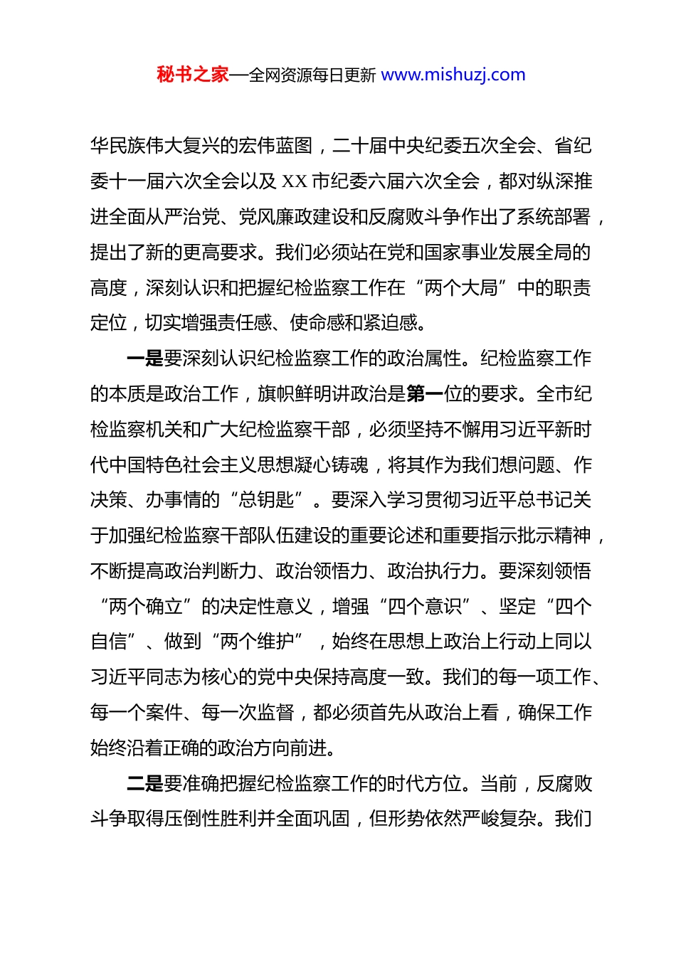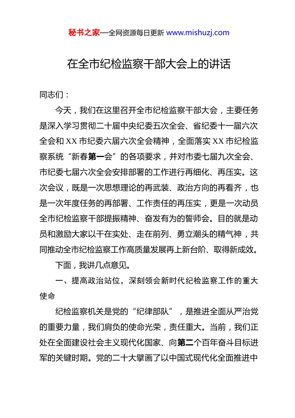 秘书之家—全网资源每日更新 www.mishuzj.com在全市纪检监察干部大会上的讲话 同志们:今天,我们在这里召开全市纪检监察干部大会,主要任务是深入学习贯彻二十届中央纪委五次全会、省纪委十一届六次全会和 XX 市纪委六届六次全会精神,全面落实 XX 市纪检监察系统“新春第一会”的各项要求,并对市委七届九次全会、市纪委七届六次全会安排部署的工作进行再细化、再压实。这次会议,既是一次思想理论的再武装、政治方向的再看齐,也是一次年度任务的再部署、工作责任的再压实,更是一次动员全市纪检监察干部提振精神、奋发有为的誓师会。目的就是动员和激励大家以干在实处、走在前列、勇立潮头的精气神,共同推动全市纪检监察工作高质量发展再上新台阶、取得新成效。下面,我讲几点意见。一、提高政治站位,深刻领会新时代纪检监察工作的重大使命纪检监察机关是党的“纪律部队”,是推进全面从严治党的重要力量,我们肩负的使命光荣,责任重大。当前,我们正处在全面建设社会主义现代化国家、向第二个百年奋斗目标进军的关键时期。党的二十大擘画了以中国式现代化全面推进中秘书之家—全网资源每日更新 www.mishuzj.com华民族伟大复兴的宏伟蓝图,二十届中央纪委五次全会、省纪委十一届六次全会以及 XX 市纪委六届六次全会,都对纵深推进全面从严治党、党风廉政建设和反腐败斗争作出了系统部署,提出了新的更高要求。我们必须站在党和国家事业发展全局的高度,深刻认识和把握纪检监察工作在“两个大局”中的职责定位,切实增强责任感、使命感和紧迫感。一是要深刻认识纪检监察工作的政治属性。纪检监察工作的本质是政治工作,旗帜鲜明讲政治是第一位的要求。全市纪检监察机关和广大纪检监察干部,必须坚持不懈用习近平新时代中国特色社会主义思想凝心铸魂,将其作为我们想问题、作决策、办事情的“总钥匙”。要深入学习贯彻习近平总书记关于加强纪检监察干部队伍建设的重要论述和重要指示批示精神,不断提高政治判断力、政治领悟力、政治执行力。要深刻领悟“两个确立”的决定性意义,增强“四个意识”、坚定“四个自信”、做到“两个维护”,始终在思想上政治上行动上同以习近平同志为核心的党中央保持高度一致。我们的每一项工作、每一个案件、每一次监督,都必须首先从政治上看,确保工作始终沿着正确的政治方向前进。二是要准确把握纪检监察工作的时代方位。当前,反腐败斗争取得压倒性胜利并全面巩固,但形势依然严峻复杂。我们秘书之家—全网资源每日更新 www.mishuzj.com必须清醒地认识到,党风廉政建设和反腐败斗争是一场输不起也决不能输的重大政治斗争。2026 年是实施“十五五”规划的开局之年,做好今年的纪检监察工作,对于保障全市经济社会发展开好局、起好步至关重要。我们必须胸怀“国之大者”,紧紧围绕市委确定的中心任务和发展大局,找准履职尽责的切入点和着力点。党中央的决策部署到哪里,省委、XX 市委和市委的要求指向哪里,我们的监督检查就必须跟进到哪里,确保政令畅通、令行禁止,为在开创中国式现代化 XX 发展新局面中谱写 XX 新篇章、推进 XX 新实践提供坚强有力的政治保障。三是要牢固树立纪检监察工作的价值追求。纪检监察工作的根本价值追求是维护党和人民的根本利益。我们的一切工作,出发点和落脚点都是为了人民。要始终站稳人民立场,把整治群众身边的不正之风和腐败问题摆在突出位置,聚焦教育、医疗、养老、社保、乡村振兴等重点民生领域,严肃查处贪污侵占、截留挪用、虚报冒领、吃拿卡要等行为,让人民群众在反腐“拍蝇”中感受到公平正义。要通过我们的不懈努力,不断厚植党执政的政治基础和群众基础,让人民群众的获得感、幸福感、安全感更加充实、更有保障、更可持续。二、激发内生动力,以“三个思考”引领纪检监察工作高秘书之家—全网资源每日更新 www.mishuzj.com质量发展面对新形势新任务,我们不仅要埋头苦干,更要抬头看路。仅仅依靠惯性思维和传统路径,已经无法适应高质量发展的要求。市纪委常委会经过深入研究,提出要以“三个思考”作为新的动力源,引领和推动全市纪检监察工作实现思维观念、工作方式和治...