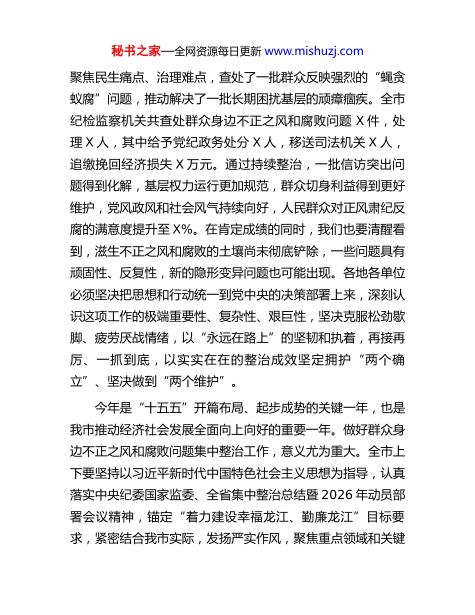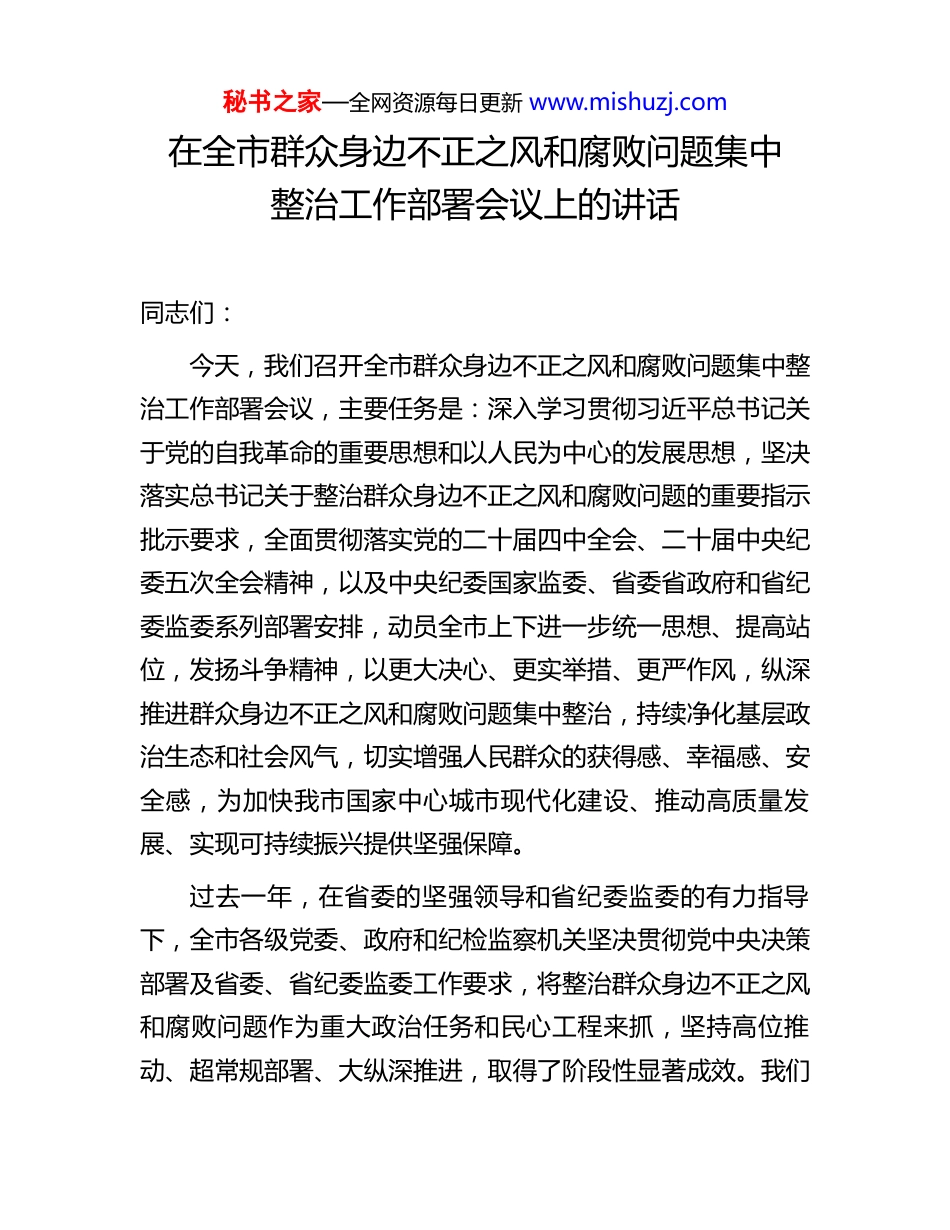 秘书之家—全网资源每日更新 www.mishuzj.com在全市群众身边不正之风和腐败问题集中整治工作部署会议上的讲话同志们:今天,我们召开全市群众身边不正之风和腐败问题集中整治工作部署会议,主要任务是:深入学习贯彻习近平总书记关于党的自我革命的重要思想和以人民为中心的发展思想,坚决落实总书记关于整治群众身边不正之风和腐败问题的重要指示批示要求,全面贯彻落实党的二十届四中全会、二十届中央纪委五次全会精神,以及中央纪委国家监委、省委省政府和省纪委监委系列部署安排,动员全市上下进一步统一思想、提高站位,发扬斗争精神,以更大决心、更实举措、更严作风,纵深推进群众身边不正之风和腐败问题集中整治,持续净化基层政治生态和社会风气,切实增强人民群众的获得感、幸福感、安全感,为加快我市国家中心城市现代化建设、推动高质量发展、实现可持续振兴提供坚强保障。过去一年,在省委的坚强领导和省纪委监委的有力指导下,全市各级党委、政府和纪检监察机关坚决贯彻党中央决策部署及省委、省纪委监委工作要求,将整治群众身边不正之风和腐败问题作为重大政治任务和民心工程来抓,坚持高位推动、超常规部署、大纵深推进,取得了阶段性显著成效。我们秘书之家—全网资源每日更新 www.mishuzj.com聚焦民生痛点、治理难点,查处了一批群众反映强烈的“蝇贪蚁腐”问题,推动解决了一批长期困扰基层的顽瘴痼疾。全市纪检监察机关共查处群众身边不正之风和腐败问题 X 件,处理 X 人,其中给予党纪政务处分 X 人,移送司法机关 X 人,追缴挽回经济损失 X 万元。通过持续整治,一批信访突出问题得到化解,基层权力运行更加规范,群众切身利益得到更好维护,党风政风和社会风气持续向好,人民群众对正风肃纪反腐的满意度提升至 X%。在肯定成绩的同时,我们也要清醒看到,滋生不正之风和腐败的土壤尚未彻底铲除,一些问题具有顽固性、反复性,新的隐形变异问题也可能出现。各地各单位必须坚决把思想和行动统一到党中央的决策部署上来,深刻认识这项工作的极端重要性、复杂性、艰巨性,坚决克服松劲歇脚、疲劳厌战情绪,以“永远在路上”的坚韧和执着,再接再厉、一抓到底,以实实在在的整治成效坚定拥护“两个确立”、坚决做到“两个维护”。今年是“十五五”开篇布局、起步成势的关键一年,也是我市推动经济社会发展全面向上向好的重要一年。做好群众身边不正之风和腐败问题集中整治工作,意义尤为重大。全市上下要坚持以习近平新时代中国特色社会主义思想为指导,认真落实中央纪委国家监委、全省集中整治总结暨 2026 年动员部署会议精神,锚定“着力建设幸福龙江、勤廉龙江”目标要求,紧密结合我市实际,发扬严实作风,聚焦重点领域和关键秘书之家—全网资源每日更新 www.mishuzj.com环节,以刮骨疗毒的勇气和久久为功的韧劲,坚决打好打赢这场群腐集中整治的总体战、攻坚战。一、提高政治站位,深刻把握整治群众身边不正之风和腐败问题的极端重要性和现实紧迫性群众身边不正之风和腐败问题,直接侵害群众切身利益,严重损害党群干群关系,动摇党的执政根基,是党和人民的大敌。我们必须从政治和全局的高度深化认识,切实增强抓好集中整治的责任感使命感。(一)这是践行党的根本宗旨、巩固党执政群众基础的必然要求。我们党来自人民、植根人民、服务人民。发生在群众身边的不正之风和腐败问题,啃食的是群众的获得感,挥霍的是基层群众对党的信任。必须坚持以人民为中心的发展思想,把整治群众身边腐败和作风问题作为密切党同人民群众血肉联系的重要抓手,下大气力解决好群众急难愁盼问题,让群众感受到全面从严治党就在身边、公平正义就在身边,不断夯实党长期执政的政治基础和群众基础。(二)这是推进党的自我革命、深化全面从严治党向基层延伸的重要举措。基层是全面从严治党的“最后一公里”,也是薄弱环节。群众身边腐败问题不解决,全面从严治党就难以真正落地生根。必须发扬彻底的自我革命精神,推动全面从严治党向基层延伸、向群众身边延伸,着力清除侵蚀党的健康肌秘书之家—全网资源每日更新 www.mishuzj.com体的病毒,补齐基层监督短板,...