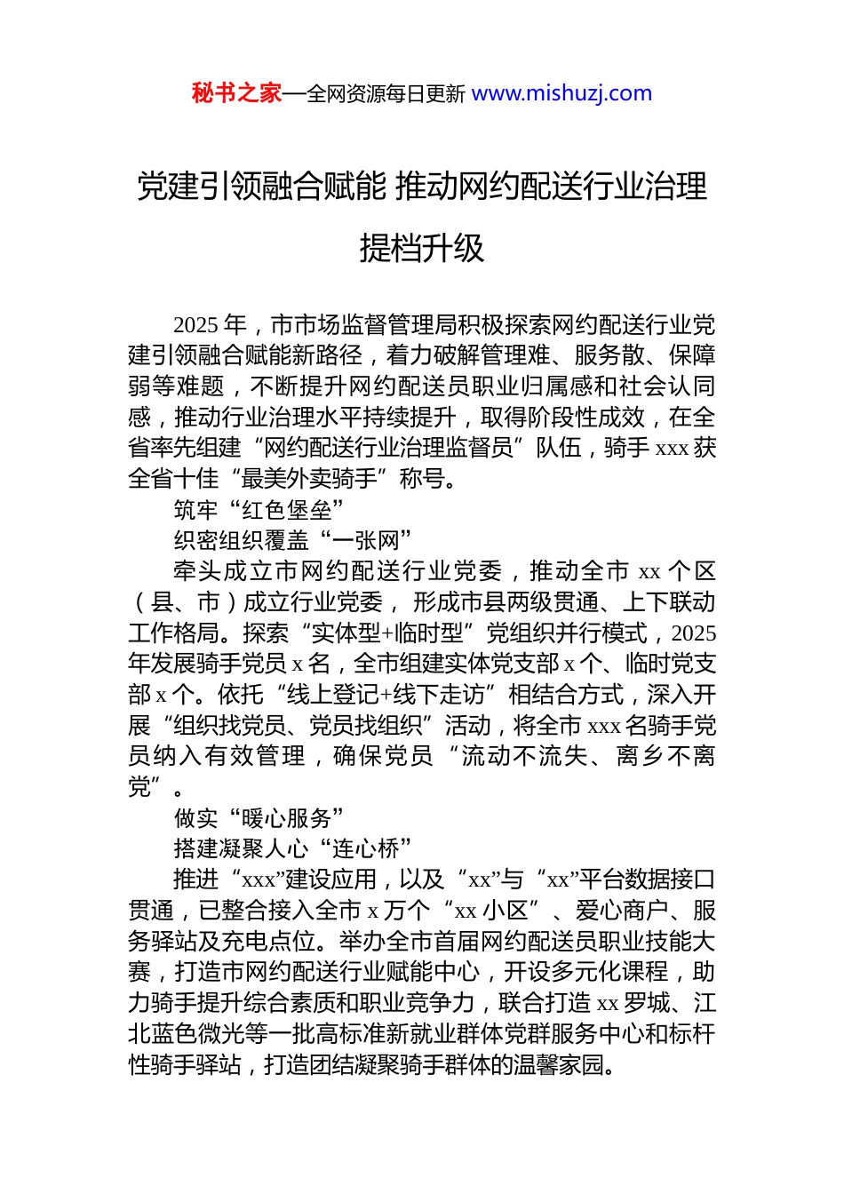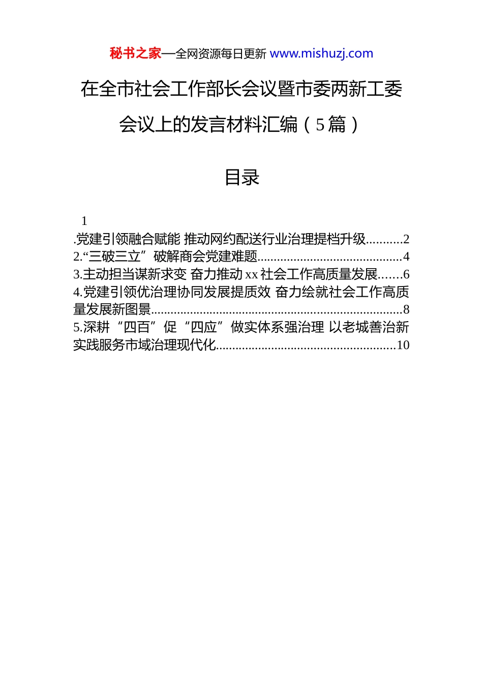 秘书之家—全网资源每日更新 www.mishuzj.com在全市社会工作部长会议暨市委两新工委会议上的发言材料汇编(5 篇)目录1.党建引领融合赋能 推动网约配送行业治理提档升级...........22.“三破三立”破解商会党建难题............................................43.主动担当谋新求变 奋力推动 xx 社会工作高质量发展.......64.党建引领优治理协同发展提质效 奋力绘就社会工作高质量发展新图景.............................................................................85.深耕“四百”促“四应”做实体系强治理 以老城善治新实践服务市域治理现代化.......................................................10秘书之家—全网资源每日更新 www.mishuzj.com党建引领融合赋能 推动网约配送行业治理提档升级2025 年,市市场监督管理局积极探索网约配送行业党建引领融合赋能新路径,着力破解管理难、服务散、保障弱等难题,不断提升网约配送员职业归属感和社会认同感,推动行业治理水平持续提升,取得阶段性成效,在全省率先组建“网约配送行业治理监督员”队伍,骑手 xxx 获全省十佳“最美外卖骑手”称号。筑牢“红色堡垒”织密组织覆盖“一张网”牵头成立市网约配送行业党委,推动全市 xx 个区(县、市)成立行业党委, 形成市县两级贯通、上下联动工作格局。探索“实体型+临时型”党组织并行模式,2025年发展骑手党员 x 名,全市组建实体党支部 x 个、临时党支部 x 个。依托“线上登记+线下走访”相结合方式,深入开展“组织找党员、党员找组织”活动,将全市 xxx 名骑手党员纳入有效管理,确保党员“流动不流失、离乡不离党”。做实“暖心服务”搭建凝聚人心“连心桥”推进“xxx”建设应用,以及“xx”与“xx”平台数据接口贯通,已整合接入全市 x 万个“xx 小区”、爱心商户、服务驿站及充电点位。举办全市首届网约配送员职业技能大赛,打造市网约配送行业赋能中心,开设多元化课程,助力骑手提升综合素质和职业竞争力,联合打造 xx 罗城、江北蓝色微光等一批高标准新就业群体党群服务中心和标杆性骑手驿站,打造团结凝聚骑手群体的温馨家园。秘书之家—全网资源每日更新 www.mishuzj.com提升治理效能绘就共建共治“同心圆”建立外卖骑手“一站点两负责三联系”工作体系,制定《即时配送平台安全生产责任承诺书》,组织 xxx 家相关平台企业签订,压实安全和权益保障责任。定期联动多部门会商研判,形成党委领导、部门协同、企业主责、站点落实的良性互动格局。在全省率先组建“网约配送行业治理监督员”队伍,制定《外卖骑手网络餐饮食品安全社会监督员管理制度》,选聘 xxx 名骑手担任“移动哨兵”,激发群体参与基层治理的内生动力。秘书之家—全网资源每日更新 www.mishuzj.com“三破三立”破解商会党建难题xx 市工商联坚持以“xx”商会党建品牌为引领,通过机制创新、融合联动与“党建+”模式,有效破解商会党建“组建难、运转难、作用难”问题。破“组建难” 立全域覆盖机制出台《xx 市工商联所属商会党建示范建设标准》,建立商会与党组织“同步筹备、上报、审批、成立、授牌”机制,推动 xx 家新成立商会全部实现“建会即建党”。分类施策,根据会员结构与党员分布特点灵活组建党组织,针对历史遗留问题,采取“一会一策”方式集中攻坚。建立“三年一轮审”动态管理机制,投入补助资金 xxx 万元,选派 xx 名党建指导员下沉赋能,推动 xx%的商会实现“党建强、发展强”,新发展新生代企业家党员 xx 名。破“运转难” 立融合联动格局构建商会联商会、机关带商会、龙头牵中小、区域大协同的“大商会”党建格局,通过党建联建实现资源共享、活动共办,覆盖企业达 x.x 万家。建立“党委抓总、片组联动、示范引领”机制,投入 xx 万元建设党建示范点,形成以点带面的辐射效应。实施“一会一品”工程,结合行业、地域特色培育“x”等特色党建品牌,激发党组织内生动力。整合实体阵地与“数字商会”线上平台,提升党务工作效率和会员参与度。破“作用难” 立赋能发展路径党组织牵头打造“商会+展会”“链主+会员”等产...
