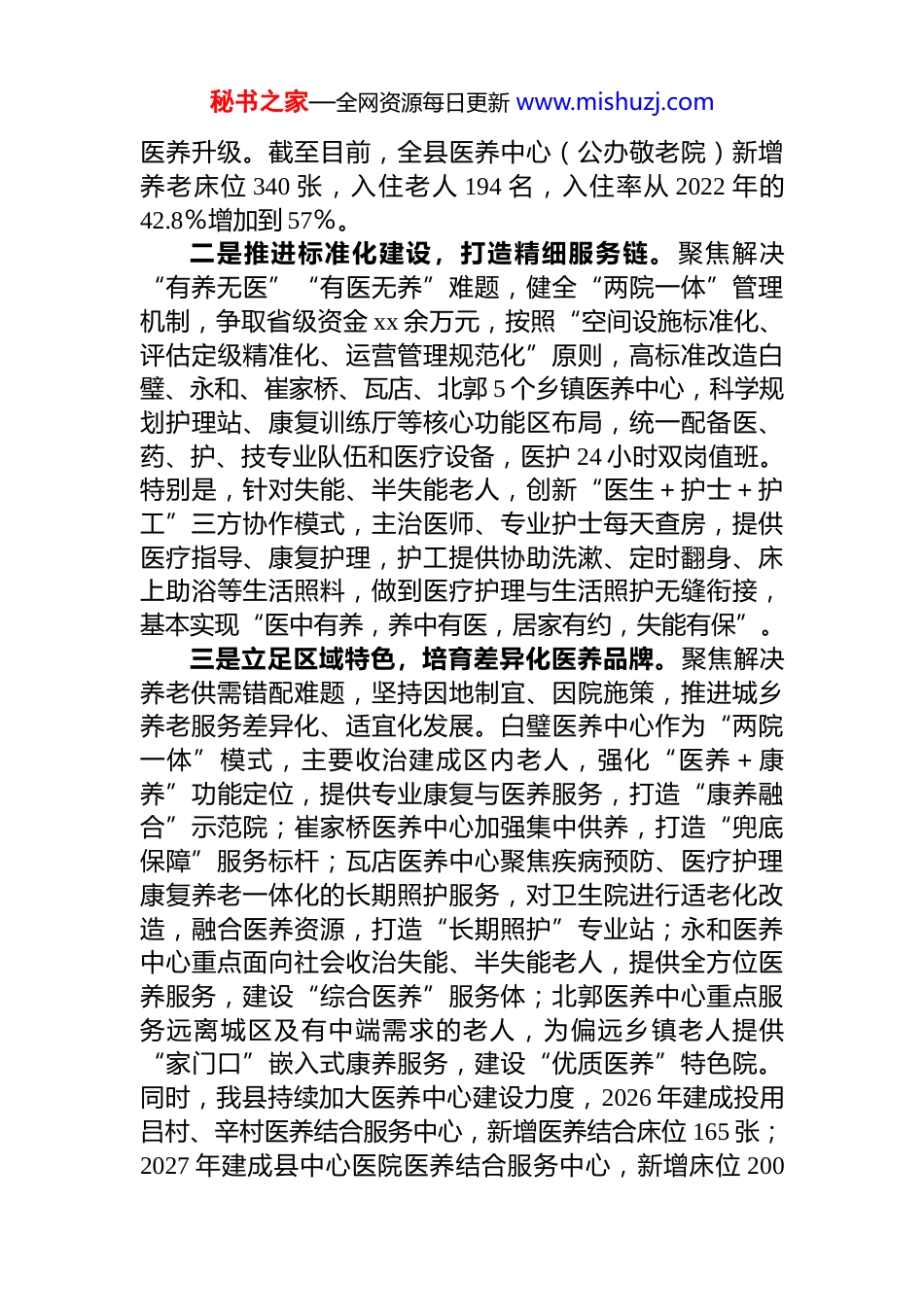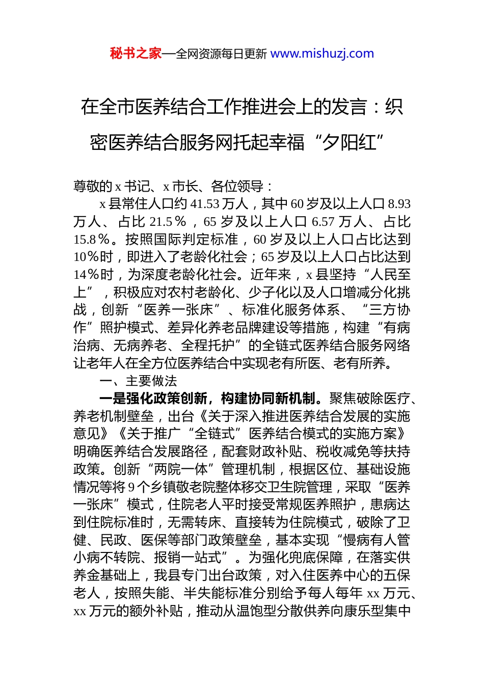 秘书之家—全网资源每日更新 www.mishuzj.com在全市医养结合工作推进会上的发言:织密医养结合服务网托起幸福“夕阳红”尊敬的 x 书记、x 市长、各位领导:x 县常住人口约 41.53 万人,其中 60 岁及以上人口 8.93万人、占比 21.5%,65 岁及以上人口 6.57 万人、占比15.8%。按照国际判定标准,60 岁及以上人口占比达到10%时,即进入了老龄化社会;65 岁及以上人口占比达到14%时,为深度老龄化社会。近年来,x 县坚持“人民至上”,积极应对农村老龄化、少子化以及人口增减分化挑战,创新“医养一张床”、标准化服务体系、“三方协作”照护模式、差异化养老品牌建设等措施,构建“有病治病、无病养老、全程托护”的全链式医养结合服务网络让老年人在全方位医养结合中实现老有所医、老有所养。一、主要做法一是强化政策创新,构建协同新机制。聚焦破除医疗、养老机制壁垒,出台《关于深入推进医养结合发展的实施意见》《关于推广“全链式”医养结合模式的实施方案》明确医养结合发展路径,配套财政补贴、税收减免等扶持政策。创新“两院一体”管理机制,根据区位、基础设施情况等将 9 个乡镇敬老院整体移交卫生院管理,采取“医养一张床”模式,住院老人平时接受常规医养照护,患病达到住院标准时,无需转床、直接转为住院模式,破除了卫健、民政、医保等部门政策壁垒,基本实现“慢病有人管小病不转院、报销一站式”。为强化兜底保障,在落实供养金基础上,我县专门出台政策,对入住医养中心的五保老人,按照失能、半失能标准分别给予每人每年 xx 万元、xx 万元的额外补贴,推动从温饱型分散供养向康乐型集中秘书之家—全网资源每日更新 www.mishuzj.com医养升级。截至目前,全县医养中心(公办敬老院)新增养老床位 340 张,入住老人 194 名,入住率从 2022 年的42.8%增加到 57%。二是推进标准化建设,打造精细服务链。聚焦解决“有养无医”“有医无养”难题,健全“两院一体”管理机制,争取省级资金 xx 余万元,按照“空间设施标准化、评估定级精准化、运营管理规范化”原则,高标准改造白璧、永和、崔家桥、瓦店、北郭 5 个乡镇医养中心,科学规划护理站、康复训练厅等核心功能区布局,统一配备医、药、护、技专业队伍和医疗设备,医护 24 小时双岗值班。特别是,针对失能、半失能老人,创新“医生+护士+护工”三方协作模式,主治医师、专业护士每天查房,提供医疗指导、康复护理,护工提供协助洗漱、定时翻身、床上助浴等生活照料,做到医疗护理与生活照护无缝衔接,基本实现“医中有养,养中有医,居家有约,失能有保”。三是立足区域特色,培育差异化医养品牌。聚焦解决养老供需错配难题,坚持因地制宜、因院施策,推进城乡养老服务差异化、适宜化发展。白璧医养中心作为“两院一体”模式,主要收治建成区内老人,强化“医养+康养”功能定位,提供专业康复与医养服务,打造“康养融合”示范院;崔家桥医养中心加强集中供养,打造“兜底保障”服务标杆;瓦店医养中心聚焦疾病预防、医疗护理康复养老一体化的长期照护服务,对卫生院进行适老化改造,融合医养资源,打造“长期照护”专业站;永和医养中心重点面向社会收治失能、半失能老人,提供全方位医养服务,建设“综合医养”服务体;北郭医养中心重点服务远离城区及有中端需求的老人,为偏远乡镇老人提供“家门口”嵌入式康养服务,建设“优质医养”特色院。同时,我县持续加大医养中心建设力度,2026 年建成投用吕村、辛村医养结合服务中心,新增医养结合床位 165 张;2027 年建成县中心医院医养结合服务中心,新增床位 200秘书之家—全网资源每日更新 www.mishuzj.com张,增设远程问诊系统、智慧监控系统、智能穿戴护理等探索“医、养、康、护”智慧型医养结合新模式,建设集医疗、康复、颐养为一体的康养产业集群。二、取得成效一是充分激活卫生院资源。医养结合改革前,我县 9 个乡镇卫生院共有病床 675 张,病床平均使用率仅 15%左右。通过深化医养结合改革,把养老服务“搬进”卫生院,实现乡镇卫生院从单纯医疗服务向医养结合拓展、延伸,有效解决了卫生院...
