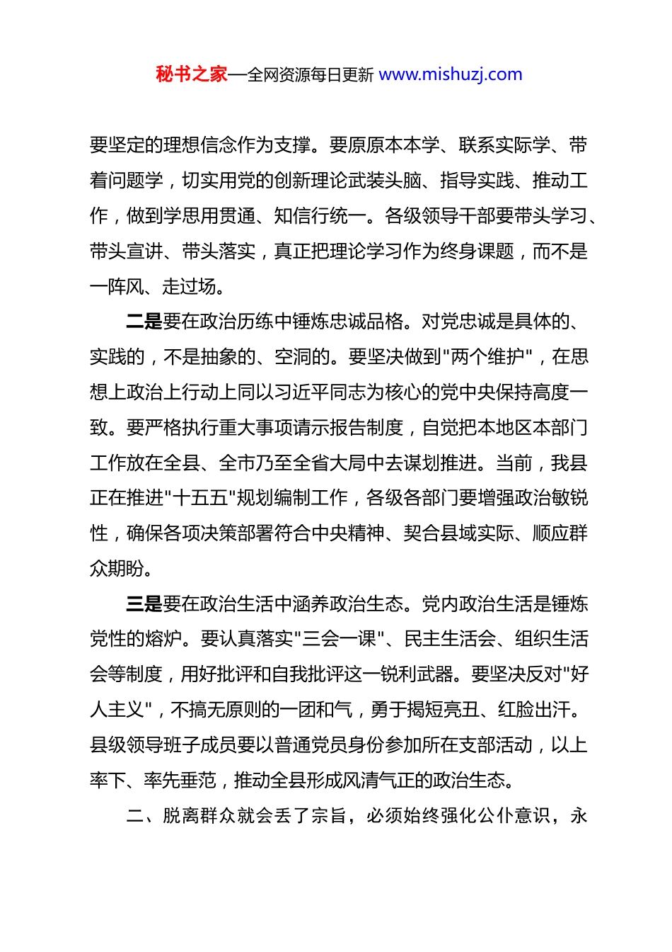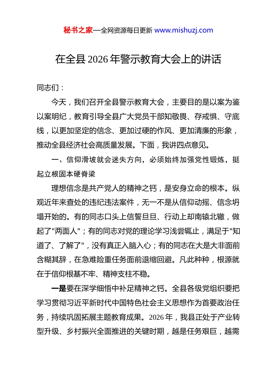 秘书之家—全网资源每日更新 www.mishuzj.com在全县 2026 年警示教育大会上的讲话 同志们:今天,我们召开全县警示教育大会,主要目的是以案为鉴以案明纪,教育引导全县广大党员干部知敬畏、存戒惧、守底线,以更加坚定的信念、更加过硬的作风、更加清廉的形象,推动全县经济社会高质量发展。下面,我讲四点意见。一、信仰滑坡就会迷失方向,必须始终加强党性锻炼,挺起立根固本硬脊梁理想信念是共产党人的精神之钙,是安身立命的根本。纵观近年来查处的违纪违法案件,无一不是从信仰动摇、信念坍塌开始的。有的同志口头上信誓旦旦、行动上却南辕北辙,做起了"两面人";有的同志对党的理论学习浅尝辄止,满足于"知道了、了解了",没有真正入脑入心;有的同志在大是大非面前含糊其辞,在急难险重任务面前退缩回避。凡此种种,根源就在于信仰根基不牢、精神支柱不稳。一是要在深学细悟中补足精神之钙。全县各级党组织要把学习贯彻习近平新时代中国特色社会主义思想作为首要政治任务,持续巩固拓展主题教育成果。2026 年,我县正处于产业转型升级、乡村振兴全面推进的关键时期,越是任务艰巨,越需秘书之家—全网资源每日更新 www.mishuzj.com要坚定的理想信念作为支撑。要原原本本学、联系实际学、带着问题学,切实用党的创新理论武装头脑、指导实践、推动工作,做到学思用贯通、知信行统一。各级领导干部要带头学习、带头宣讲、带头落实,真正把理论学习作为终身课题,而不是一阵风、走过场。二是要在政治历练中锤炼忠诚品格。对党忠诚是具体的、实践的,不是抽象的、空洞的。要坚决做到"两个维护",在思想上政治上行动上同以习近平同志为核心的党中央保持高度一致。要严格执行重大事项请示报告制度,自觉把本地区本部门工作放在全县、全市乃至全省大局中去谋划推进。当前,我县正在推进"十五五"规划编制工作,各级各部门要增强政治敏锐性,确保各项决策部署符合中央精神、契合县域实际、顺应群众期盼。三是要在政治生活中涵养政治生态。党内政治生活是锤炼党性的熔炉。要认真落实"三会一课"、民主生活会、组织生活会等制度,用好批评和自我批评这一锐利武器。要坚决反对"好人主义",不搞无原则的一团和气,勇于揭短亮丑、红脸出汗。县级领导班子成员要以普通党员身份参加所在支部活动,以上率下、率先垂范,推动全县形成风清气正的政治生态。二、脱离群众就会丢了宗旨,必须始终强化公仆意识,永秘书之家—全网资源每日更新 www.mishuzj.com葆为民服务赤子心人民立场是我们党的根本政治立场,群众路线是我们党的生命线和根本工作路线。从近年来我县通报的典型案例看,有的干部习惯于坐在办公室里拍脑袋决策,对群众的急难愁盼视而不见;有的干部在服务群众中态度冷漠、推诿扯皮,让群众跑了冤枉路、寒了心;有的干部搞"形象工程""面子工程",重显绩轻潜绩,忽视群众的真实需求。这些问题的本质,就是忘了自己的权力是谁赋予的、忘了发展的成果应该由谁共享。一是要坚持人民至上,把群众呼声作为第一信号。2026 年,我县将深入实施"民生提质"行动,聚焦教育、医疗、住房、养老等群众最关心最直接最现实的利益问题,集中力量办好十件民生实事。各级干部要经常深入基层一线,走进田间地头、车间厂房、社区楼栋,面对面倾听群众心声,实打实解决群众困难。要建立健全民情收集、分析研判、跟踪督办、反馈评价的闭环机制,确保群众反映的问题件件有着落、事事有回音。二是要改进工作作风,把群众满意作为第一标准。作风建设永远在路上。要持续深化"放管服"改革,推进政务服务标准化、规范化、便利化,让数据多跑路、群众少跑腿。要大力整治形式主义、官僚主义,坚决纠正以文件落实文件、以会议落实会议的不良风气。当前,我县部分乡镇仍存在"指尖上的形式秘书之家—全网资源每日更新 www.mishuzj.com主义"问题,各类 APP 打卡、数据填报让基层干部疲于应付,必须下大力气清理规范,切实为基层减负松绑。三是要密切联系群众,把群众支持作为最大底气。群众路线是我们的传家宝,任何时候都不能丢。要认真落实领导干部接访下访制度,畅通群众诉求表达渠道。要深入推进"万名干部进...