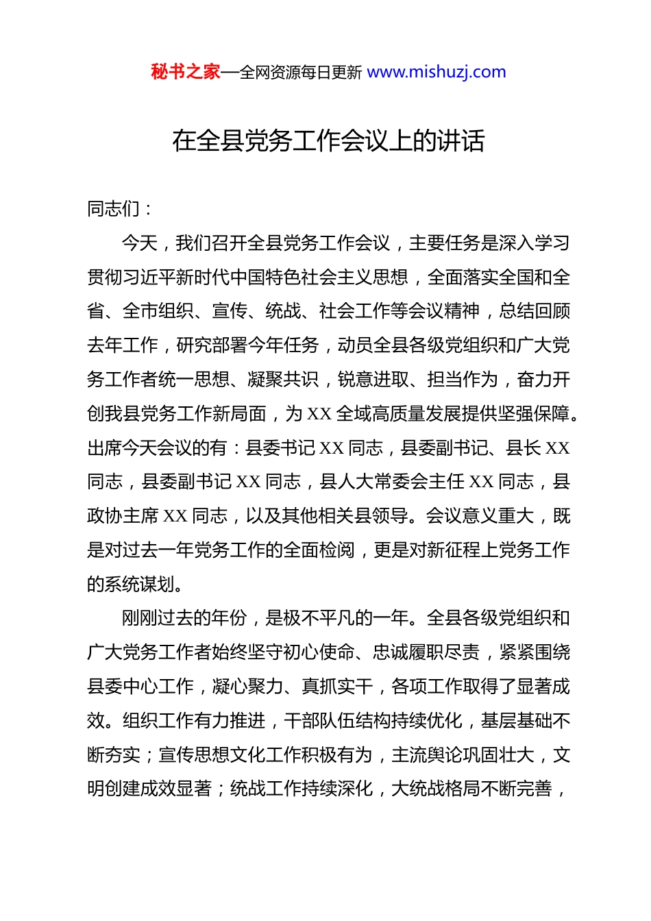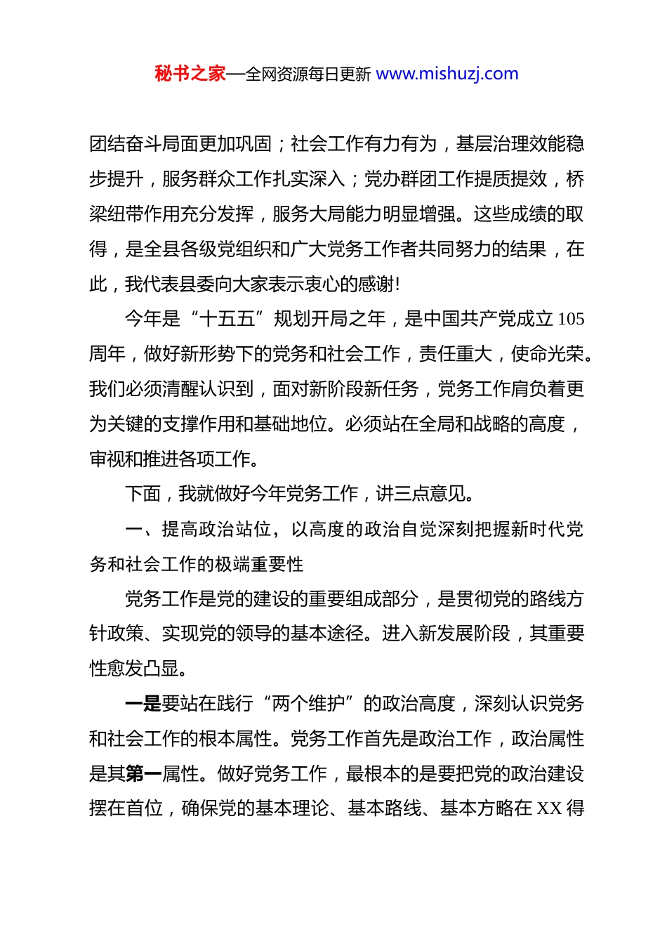 秘书之家—全网资源每日更新 www.mishuzj.com在全县党务工作会议上的讲话同志们:今天,我们召开全县党务工作会议,主要任务是深入学习贯彻习近平新时代中国特色社会主义思想,全面落实全国和全省、全市组织、宣传、统战、社会工作等会议精神,总结回顾去年工作,研究部署今年任务,动员全县各级党组织和广大党务工作者统一思想、凝聚共识,锐意进取、担当作为,奋力开创我县党务工作新局面,为 XX 全域高质量发展提供坚强保障。出席今天会议的有:县委书记 XX 同志,县委副书记、县长 XX同志,县委副书记 XX 同志,县人大常委会主任 XX 同志,县政协主席 XX 同志,以及其他相关县领导。会议意义重大,既是对过去一年党务工作的全面检阅,更是对新征程上党务工作的系统谋划。刚刚过去的年份,是极不平凡的一年。全县各级党组织和广大党务工作者始终坚守初心使命、忠诚履职尽责,紧紧围绕县委中心工作,凝心聚力、真抓实干,各项工作取得了显著成效。组织工作有力推进,干部队伍结构持续优化,基层基础不断夯实;宣传思想文化工作积极有为,主流舆论巩固壮大,文明创建成效显著;统战工作持续深化,大统战格局不断完善,秘书之家—全网资源每日更新 www.mishuzj.com团结奋斗局面更加巩固;社会工作有力有为,基层治理效能稳步提升,服务群众工作扎实深入;党办群团工作提质提效,桥梁纽带作用充分发挥,服务大局能力明显增强。这些成绩的取得,是全县各级党组织和广大党务工作者共同努力的结果,在此,我代表县委向大家表示衷心的感谢!今年是“十五五”规划开局之年,是中国共产党成立 105周年,做好新形势下的党务和社会工作,责任重大,使命光荣。我们必须清醒认识到,面对新阶段新任务,党务工作肩负着更为关键的支撑作用和基础地位。必须站在全局和战略的高度,审视和推进各项工作。下面,我就做好今年党务工作,讲三点意见。一、提高政治站位,以高度的政治自觉深刻把握新时代党务和社会工作的极端重要性党务工作是党的建设的重要组成部分,是贯彻党的路线方针政策、实现党的领导的基本途径。进入新发展阶段,其重要性愈发凸显。一是要站在践行“两个维护”的政治高度,深刻认识党务和社会工作的根本属性。党务工作首先是政治工作,政治属性是其第一属性。做好党务工作,最根本的是要把党的政治建设摆在首位,确保党的基本理论、基本路线、基本方略在 XX 得秘书之家—全网资源每日更新 www.mishuzj.com到不折不扣的贯彻落实。全县各级党组织和党务工作者必须不断提高政治判断力、政治领悟力、政治执行力,自觉在思想上政治上行动上同党中央保持高度一致,把讲政治的要求贯穿于组织、宣传、统战、社会工作等各领域、全过程,确保党中央决策部署和省委、市委工作要求在 XX 落地生根、开花结果。这是检验我们是否忠诚核心、维护核心的实践标准。二是要站在服务高质量发展的全局高度,深刻认识党务和社会工作的支撑作用。发展是第一要务,党建是第一责任,两者相辅相成、互为促进。当前,XX 正处于全域高质量发展的关键时期,无论是产业转型升级、城乡融合发展,还是民生改善、社会治理,都需要坚强的组织保证、思想引领、力量凝聚和稳定环境。党务工作决不能搞成“两张皮”,必须自觉置于全县发展大局中去谋划和推进。要围绕发展选干部、配班子、聚人才,围绕发展强宣传、鼓干劲、聚民心,围绕发展促团结、汇力量、保稳定,推动党建工作与经济社会发展深度融合、同频共振,以高质量党建引领保障高质量发展。三是要站在全面从严治党的战略高度,深刻认识党务和社会工作的基础地位。全面从严治党永远在路上,党的自我革命永远在路上。党务工作是落实全面从严治党要求的基础性工程。从严格党的组织生活、加强党员教育管理,到严肃党内政治生秘书之家—全网资源每日更新 www.mishuzj.com活、净化党内政治生态;从树立正确选人用人导向、匡正选人用人风气,到加强党风廉政建设、密切党群干群关系,每一项工作都关系到党的肌体健康和执政根基。必须持之以恒抓基层、打基础,不断提升党务工作的规范化、制度化、科学化水平,把每个基层党组织都建设成为坚强战斗堡垒...