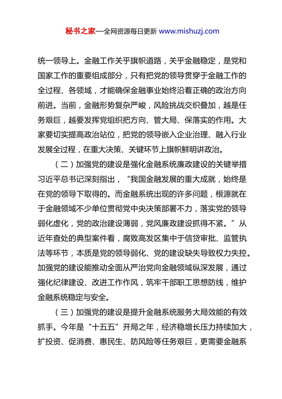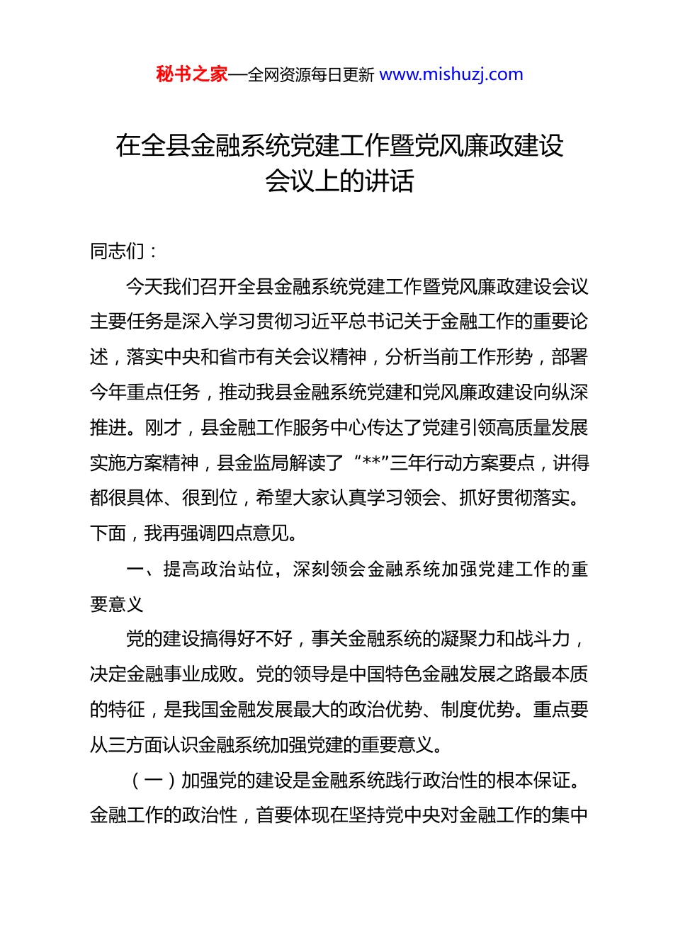 秘书之家—全网资源每日更新 www.mishuzj.com在全县金融系统党建工作暨党风廉政建设会议上的讲话 同志们:今天我们召开全县金融系统党建工作暨党风廉政建设会议主要任务是深入学习贯彻习近平总书记关于金融工作的重要论述,落实中央和省市有关会议精神,分析当前工作形势,部署今年重点任务,推动我县金融系统党建和党风廉政建设向纵深推进。刚才,县金融工作服务中心传达了党建引领高质量发展实施方案精神,县金监局解读了“**”三年行动方案要点,讲得都很具体、很到位,希望大家认真学习领会、抓好贯彻落实。下面,我再强调四点意见。一、提高政治站位,深刻领会金融系统加强党建工作的重要意义党的建设搞得好不好,事关金融系统的凝聚力和战斗力,决定金融事业成败。党的领导是中国特色金融发展之路最本质的特征,是我国金融发展最大的政治优势、制度优势。重点要从三方面认识金融系统加强党建的重要意义。(一)加强党的建设是金融系统践行政治性的根本保证。金融工作的政治性,首要体现在坚持党中央对金融工作的集中秘书之家—全网资源每日更新 www.mishuzj.com统一领导上。金融工作关乎旗帜道路,关乎金融稳定,是党和国家工作的重要组成部分,只有把党的领导贯穿于金融工作的全过程、各领域,才能确保金融事业始终沿着正确的政治方向前进。当前,金融形势复杂严峻,风险挑战交织叠加,越是任务艰巨,越要发挥党组织把方向、管大局、保落实的作用。大家要切实提高政治站位,把党的领导嵌入企业治理、融入行业发展全过程,在重大决策、关键环节上旗帜鲜明讲政治。(二)加强党的建设是强化金融系统廉政建设的关键举措习近平总书记深刻指出,“我国金融发展的重大成就,始终是在党的领导下取得的。而金融系统出现的许多问题,根源就在于金融领域不少单位贯彻党中央决策部署不力,落实党的领导弱化虚化,党的政治建设薄弱,党风廉政建设抓得不紧。”从近年查处的典型案件看,腐败高发区集中于信贷审批、监管执法等环节,本质是党的领导弱化、党的建设缺失导致权力失控。加强党的建设能推动全面从严治党向金融领域纵深发展,通过强化纪律建设、改进工作作风,筑牢干部职工思想防线,维护金融系统稳定与安全。(三)加强党的建设是提升金融系统服务大局效能的有效抓手。今年是“十五五”开局之年,经济稳增长压力持续加大,扩投资、促消费、惠民生、防风险等任务艰巨,更需要金融系秘书之家—全网资源每日更新 www.mishuzj.com统的主动担当和精准赋能,更迫切需要党组织的政治引领和组织动员作用。当前,有的同志认为业务是“硬指标”,党建是“软任务”,这种想法必须纠正。我们要深刻认识到,抓好党建是最大的政绩,也是最有效的风险防控。只有把党的全面领导落实到金融工作的全过程,树牢正确的政绩观,才能确保我们服务地方发展的每一步都走得更稳、更实、更合规。二、坚持党管金融,充分强化金融系统高质量发展的组织保障(一)充分发挥行业党委牵头作用。我县金融行业党委于2025 年 6 月正式成立,标志着我县金融系统党建工作迈出系统化、规范化的重要一步。下一步请县金融行业党委办公室(设在县金融工作服务中心)牵头推进县金融业联合会筹建,充分发挥金融业联合会桥梁纽带作用,推动落实政策传达、培训交流、配合监管等任务,及时传达上级关于金融工作决策部署和金融管理部门政策要求。(二)加强金融系统党建基础保障。加强金融业联合会和行业党委的联动作用,加强行业党委和联合会的人、财、物保障工作,重点要加快配齐党建工作力量,加快形成协同联动、互为支撑的工作格局,为统筹推进金融党建、业务发展和党风廉政建设提供坚实组织保障。秘书之家—全网资源每日更新 www.mishuzj.com(三)持续提升基层党建覆盖面。行业党委要加强和组织部、社工部等部门联动,全力推动金融系统党的组织和工作有效覆盖。目前全县**家金融机构和组织中,共有从业人员**人,党员**人,党员人数占比达**%,成立党委**个、党总支**个、党支部**个。行业党委要加强对“7+4”金融组织(“7”是指小额贷款公司、融资担保公司、区域性股权市场、典当行、融资租赁公司、商业保理公司...