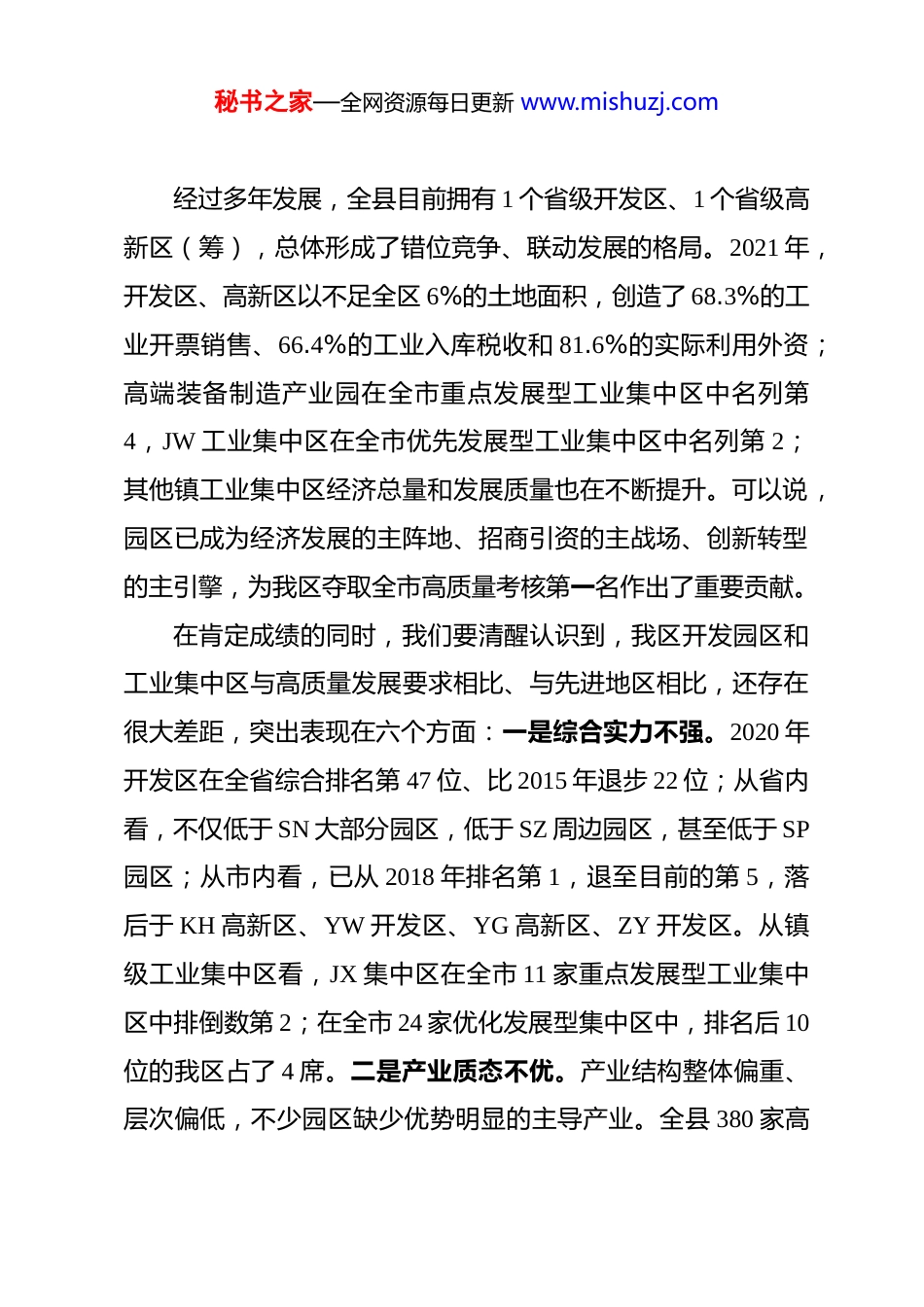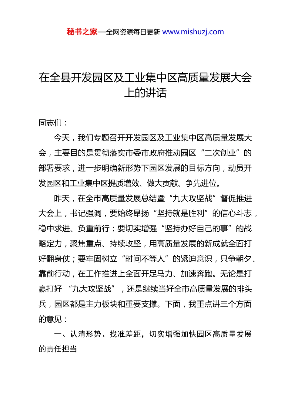 秘书之家—全网资源每日更新 www.mishuzj.com在全县开发园区及工业集中区高质量发展大会上的讲话同志们:今天,我们专题召开开发园区及工业集中区高质量发展大会,主要目的是贯彻落实市委市政府推动园区“二次创业”的部署要求,进一步明确新形势下园区发展的目标方向,动员开发园区和工业集中区提质增效、做大贡献、争先进位。昨天,在全市高质量发展总结暨“九大攻坚战”督促推进大会上,书记强调,要始终昂扬“坚持就是胜利”的信心斗志,稳中求进、负重前行;要切实增强“坚持办好自己的事”的战略定力,聚焦重点、持续攻坚,用高质量发展的新成就全面打好翻身仗;要牢固树立“时间不等人”的紧迫意识,只争朝夕、靠前行动,在工作推进上全面开足马力、加速奔跑。无论是打赢打好 “九大攻坚战”,还是继续当好全市高质量发展的排头兵,园区都是主力板块和重要支撑。下面,我重点讲三个方面的意见: 一、认清形势、找准差距,切实增强加快园区高质量发展的责任担当秘书之家—全网资源每日更新 www.mishuzj.com经过多年发展,全县目前拥有 1 个省级开发区、1 个省级高新区(筹),总体形成了错位竞争、联动发展的格局。2021 年,开发区、高新区以不足全区 6%的土地面积,创造了 68.3%的工业开票销售、66.4%的工业入库税收和 81.6%的实际利用外资;高端装备制造产业园在全市重点发展型工业集中区中名列第4,JW 工业集中区在全市优先发展型工业集中区中名列第 2;其他镇工业集中区经济总量和发展质量也在不断提升。可以说,园区已成为经济发展的主阵地、招商引资的主战场、创新转型的主引擎,为我区夺取全市高质量考核第一名作出了重要贡献。在肯定成绩的同时,我们要清醒认识到,我区开发园区和工业集中区与高质量发展要求相比、与先进地区相比,还存在很大差距,突出表现在六个方面:一是综合实力不强。2020 年开发区在全省综合排名第 47 位、比 2015 年退步 22 位;从省内看,不仅低于 SN 大部分园区,低于 SZ 周边园区,甚至低于 SP园区;从市内看,已从 2018 年排名第 1,退至目前的第 5,落后于 KH 高新区、YW 开发区、YG 高新区、ZY 开发区。从镇级工业集中区看,JX 集中区在全市 11 家重点发展型工业集中区中排倒数第 2;在全市 24 家优化发展型集中区中,排名后 10位的我区占了 4 席。二是产业质态不优。产业结构整体偏重、层次偏低,不少园区缺少优势明显的主导产业。全县 380 家高秘书之家—全网资源每日更新 www.mishuzj.com新技术企业,TP 仅有 4 家、占比 1.05%。全县高新技术产业产值占规上工业比重 42.9%,开发区仅为 9.6%,而周边的 JJ 开发区 2019 年就超过了 45%,YD 高新区目前已达 50%以上。三是增长后劲不足。尤其缺少科技含量高、投资规模大、支撑带动强的龙头旗舰型项目,百亿级的制造业项目一直未能突破。今年以来,开发区、高新区新签约 10 亿元以上重大产业项目各 2个,JW、CG 一季度未有重大项目开工建设,其他镇项目储备也明显不足。在全县 753 家规上工业企业中,QW 仅 28 家、TP仅 21 家,分别占 3.7%、2.8%。从列省重大项目看,1-4 月份我县列省重大项目投资进度仅为 13.3%,而 YG、LG、开发区的项目投资进度已超 30%;从列市重大项目看,我县投资进度仅为 20%,YG、JH、开发区项目投资进度均超 30%。四是产出效益不高。园区普遍面临发展空间不足、土地集约度不高、资金紧缺,以及碳达峰、碳中和背景下的能耗指标、污染排放物指标紧缺等方面的制约。就用地质态而言,亩均工业开票、税收仅为 183 万元、5 万元,分别低于市均 123 万元、4.6 万元,低于省均 227 万元、14 万元,各镇工业集中区还有 2 万多亩的存量资源没有得到充分利用。五是体制机制不活。市场化的手段还不够丰富,在政务服务、商务环境、精准政策支持等方面存在不少短板。讲这些问题,不是否定我们已经取得的成绩,秘书之家—全网资源每日更新 www.mishuzj.com而是要让大家有危机意识,从而增强进一步抓好园区发展的责任感和紧迫感,努力在新一轮比学赶超中再创新业绩、再上新台阶。二...