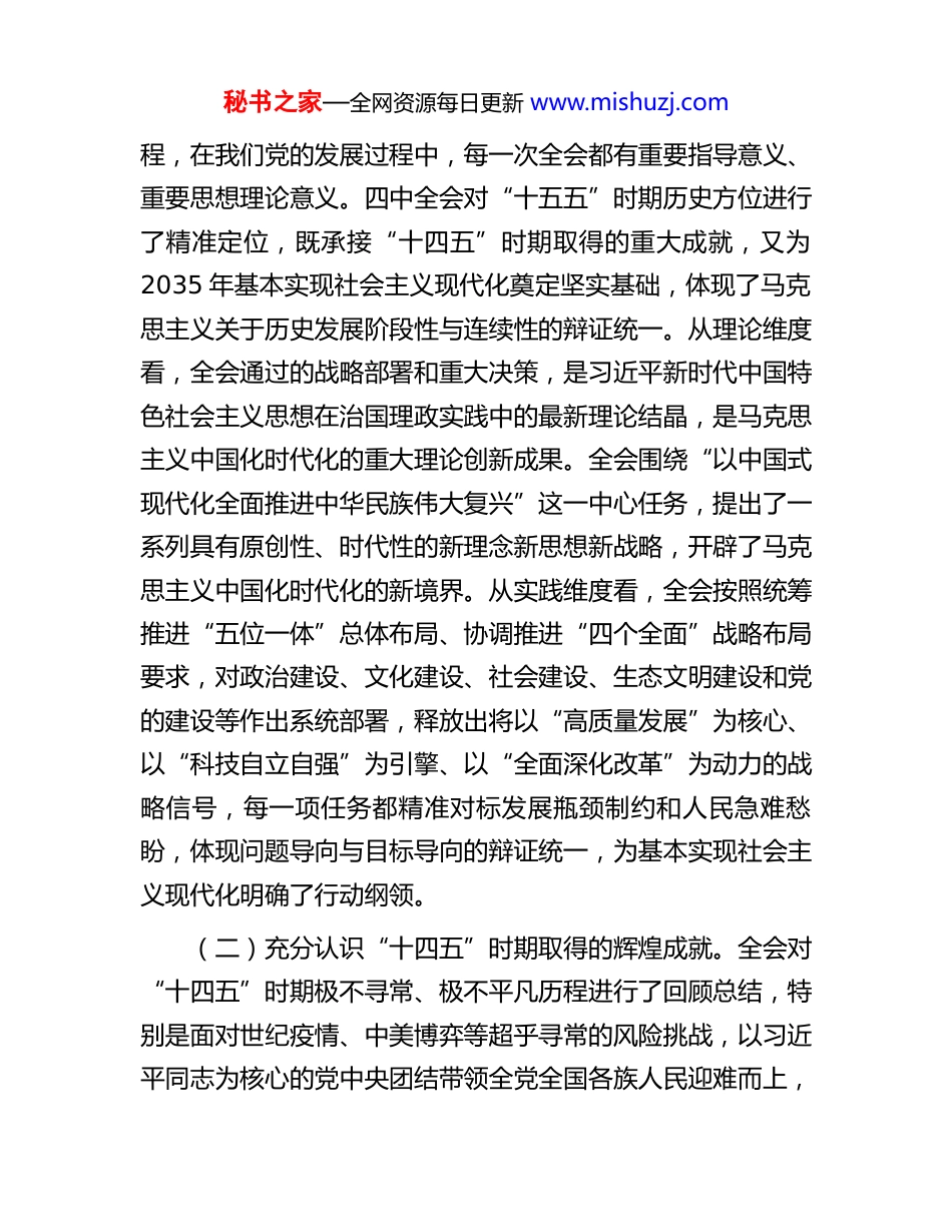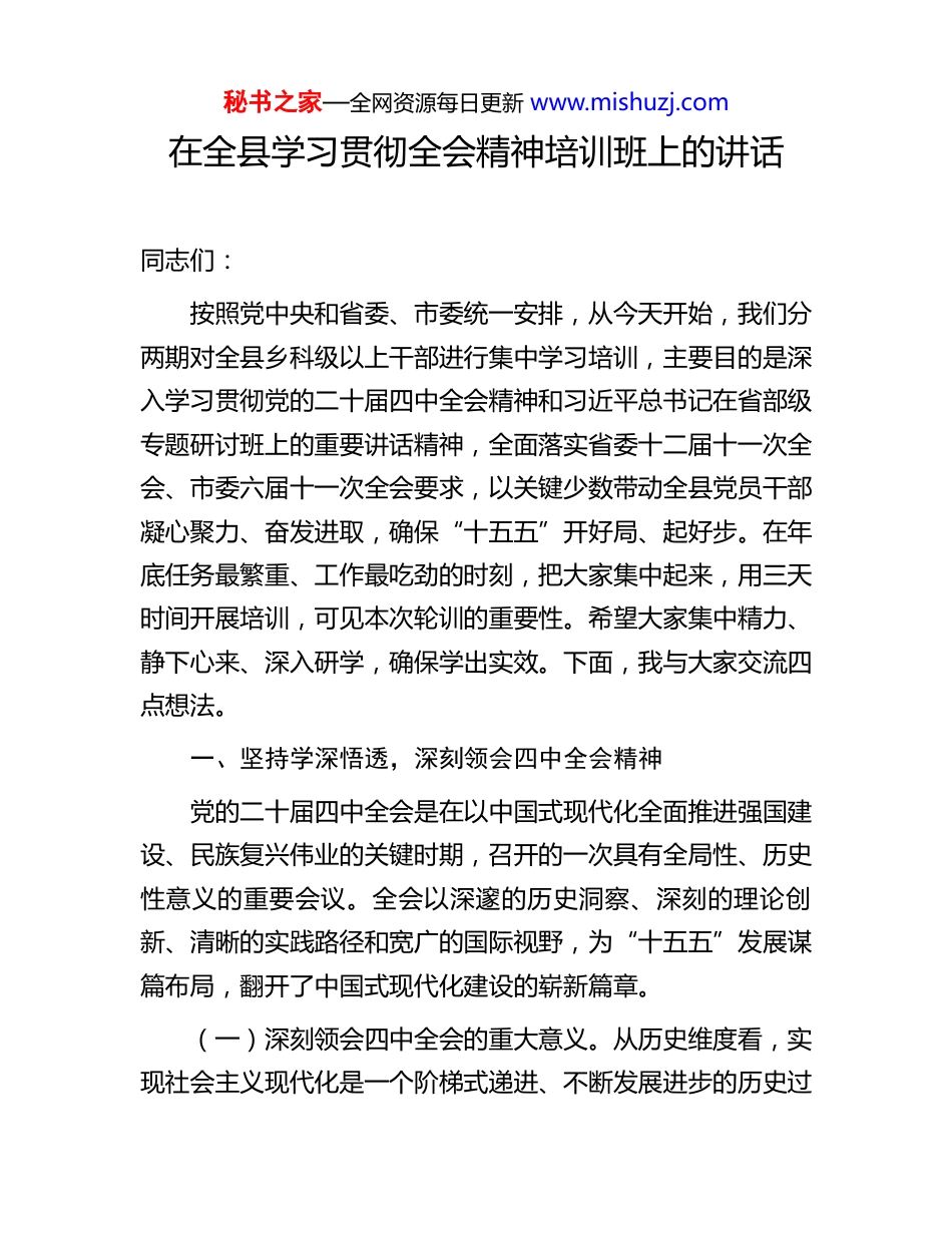 秘书之家—全网资源每日更新 www.mishuzj.com在全县学习贯彻全会精神培训班上的讲话同志们:按照党中央和省委、市委统一安排,从今天开始,我们分两期对全县乡科级以上干部进行集中学习培训,主要目的是深入学习贯彻党的二十届四中全会精神和习近平总书记在省部级专题研讨班上的重要讲话精神,全面落实省委十二届十一次全会、市委六届十一次全会要求,以关键少数带动全县党员干部凝心聚力、奋发进取,确保“十五五”开好局、起好步。在年底任务最繁重、工作最吃劲的时刻,把大家集中起来,用三天时间开展培训,可见本次轮训的重要性。希望大家集中精力、静下心来、深入研学,确保学出实效。下面,我与大家交流四点想法。一、坚持学深悟透,深刻领会四中全会精神党的二十届四中全会是在以中国式现代化全面推进强国建设、民族复兴伟业的关键时期,召开的一次具有全局性、历史性意义的重要会议。全会以深邃的历史洞察、深刻的理论创新、清晰的实践路径和宽广的国际视野,为“十五五”发展谋篇布局,翻开了中国式现代化建设的崭新篇章。(一)深刻领会四中全会的重大意义。从历史维度看,实现社会主义现代化是一个阶梯式递进、不断发展进步的历史过秘书之家—全网资源每日更新 www.mishuzj.com程,在我们党的发展过程中,每一次全会都有重要指导意义、重要思想理论意义。四中全会对“十五五”时期历史方位进行了精准定位,既承接“十四五”时期取得的重大成就,又为2035 年基本实现社会主义现代化奠定坚实基础,体现了马克思主义关于历史发展阶段性与连续性的辩证统一。从理论维度看,全会通过的战略部署和重大决策,是习近平新时代中国特色社会主义思想在治国理政实践中的最新理论结晶,是马克思主义中国化时代化的重大理论创新成果。全会围绕“以中国式现代化全面推进中华民族伟大复兴”这一中心任务,提出了一系列具有原创性、时代性的新理念新思想新战略,开辟了马克思主义中国化时代化的新境界。从实践维度看,全会按照统筹推进“五位一体”总体布局、协调推进“四个全面”战略布局要求,对政治建设、文化建设、社会建设、生态文明建设和党的建设等作出系统部署,释放出将以“高质量发展”为核心、以“科技自立自强”为引擎、以“全面深化改革”为动力的战略信号,每一项任务都精准对标发展瓶颈制约和人民急难愁盼,体现问题导向与目标导向的辩证统一,为基本实现社会主义现代化明确了行动纲领。(二)充分认识“十四五”时期取得的辉煌成就。全会对“十四五”时期极不寻常、极不平凡历程进行了回顾总结,特别是面对世纪疫情、中美博弈等超乎寻常的风险挑战,以习近平同志为核心的党中央团结带领全党全国各族人民迎难而上,秘书之家—全网资源每日更新 www.mishuzj.com取得了历史性跨越和历史性成就。X 县“十四五”期间同样也取得难能可贵的发展成效,全县地区生产总值达到 222.3 亿元,年均增长 13%,五年增长 1.8 倍,实现翻一番,增速连续四年稳居全市前列;规上工业总产值达到 338 亿元,年均增长 34%,实现翻两番,增速连续三年全市第一;固定资产投资达到 184 亿元,年均增长 8%;一般公共预算收入达到23 亿元,年均增长 30%以上,实现翻两番,总量、增幅均位居全市前列。新型工业化、新型城镇化、科技创新等工作经验省市推广,先后在全省市厅级主要领导干部专题培训班、科技创新大会、生物制造产业对接活动上作交流发言。(三)辩证看待机遇和挑战。全会对“十五五”时期我国发展面临的复杂环境进行战略研判,指出“我国发展处于战略机遇和风险挑战并存、不确定难预料因素增多的时期”。从外部环境看,百年变局加速演进,变的一面深入发展,乱的一面更加突出,东升西降格局明显加速,全球地缘政治格局、经济格局正在深刻调整。特别是单边主义、保护主义抬头,旧秩序坍塌与新秩序构建激烈博弈。从内部发展看,我国经济社会发展到了转型变革的历史关口,老问题、新挑战仍然不少,周期性、结构性、体制性问题相互交织。XX 省长总结为“五个复杂变化”(1 社会主要矛盾发生重大复杂变化;2 总体供需格局发生重大复杂变化;3 支撑发展的要素条件发生重大...
