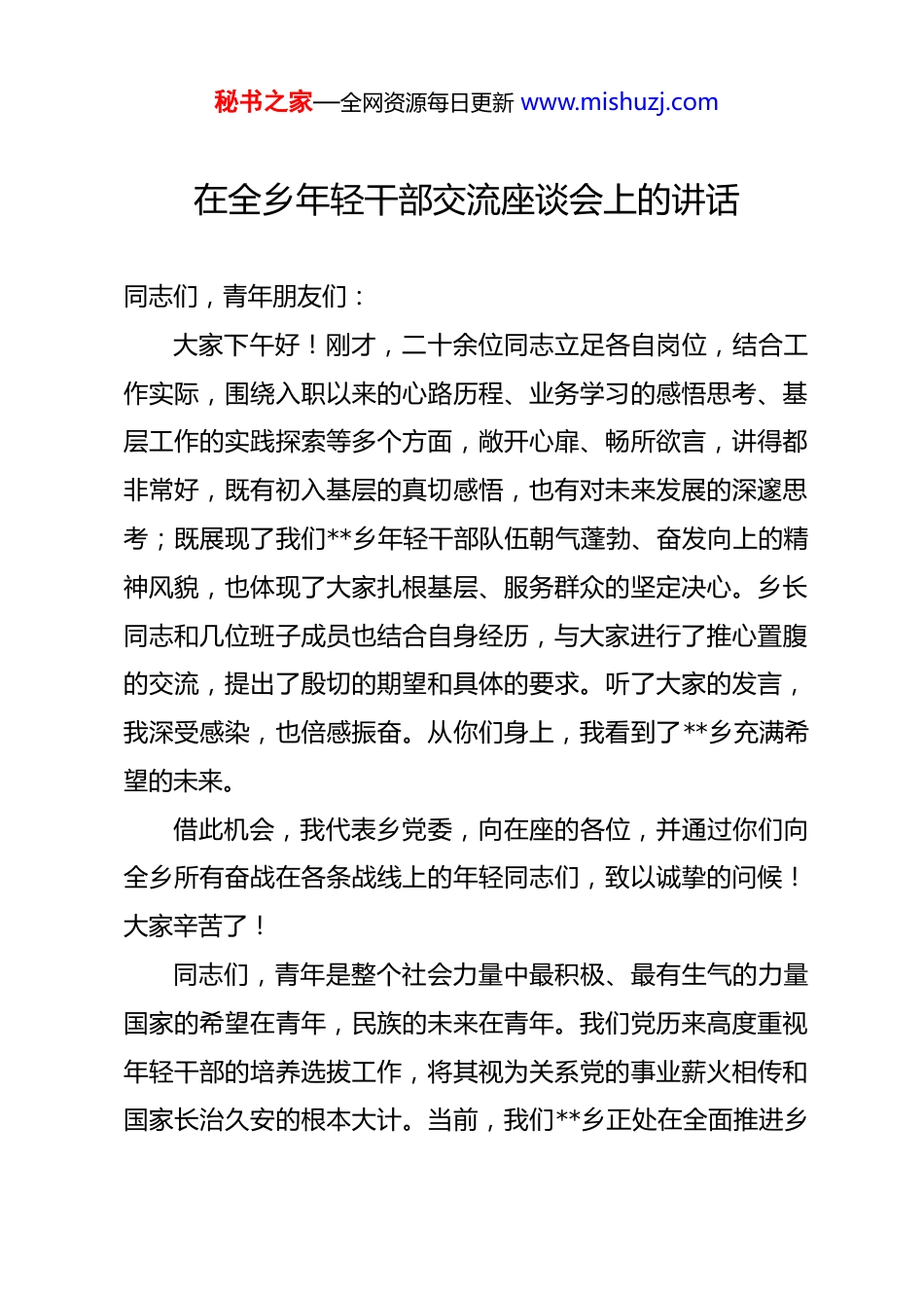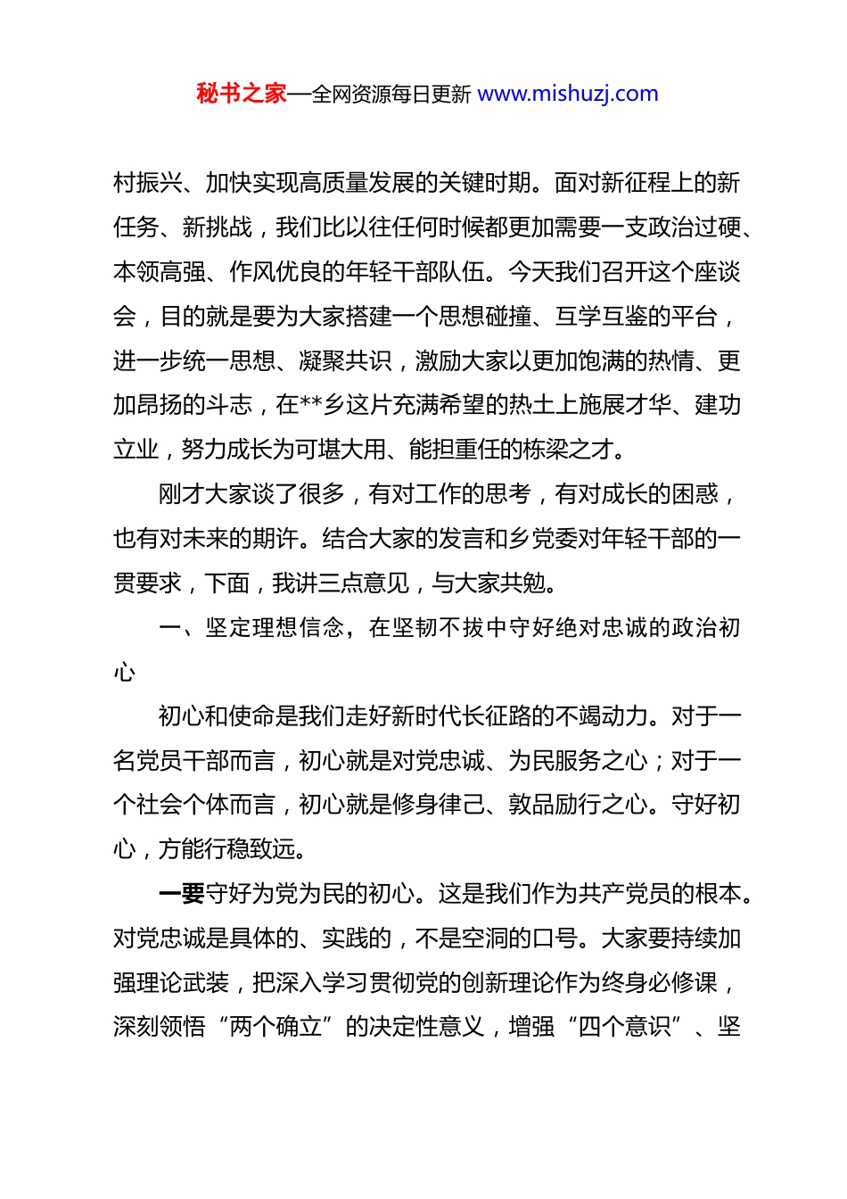 秘书之家—全网资源每日更新 www.mishuzj.com在全乡年轻干部交流座谈会上的讲话 同志们,青年朋友们:大家下午好!刚才,二十余位同志立足各自岗位,结合工作实际,围绕入职以来的心路历程、业务学习的感悟思考、基层工作的实践探索等多个方面,敞开心扉、畅所欲言,讲得都非常好,既有初入基层的真切感悟,也有对未来发展的深邃思考;既展现了我们**乡年轻干部队伍朝气蓬勃、奋发向上的精神风貌,也体现了大家扎根基层、服务群众的坚定决心。乡长同志和几位班子成员也结合自身经历,与大家进行了推心置腹的交流,提出了殷切的期望和具体的要求。听了大家的发言,我深受感染,也倍感振奋。从你们身上,我看到了**乡充满希望的未来。借此机会,我代表乡党委,向在座的各位,并通过你们向全乡所有奋战在各条战线上的年轻同志们,致以诚挚的问候!大家辛苦了!同志们,青年是整个社会力量中最积极、最有生气的力量国家的希望在青年,民族的未来在青年。我们党历来高度重视年轻干部的培养选拔工作,将其视为关系党的事业薪火相传和国家长治久安的根本大计。当前,我们**乡正处在全面推进乡秘书之家—全网资源每日更新 www.mishuzj.com村振兴、加快实现高质量发展的关键时期。面对新征程上的新任务、新挑战,我们比以往任何时候都更加需要一支政治过硬、本领高强、作风优良的年轻干部队伍。今天我们召开这个座谈会,目的就是要为大家搭建一个思想碰撞、互学互鉴的平台,进一步统一思想、凝聚共识,激励大家以更加饱满的热情、更加昂扬的斗志,在**乡这片充满希望的热土上施展才华、建功立业,努力成长为可堪大用、能担重任的栋梁之才。刚才大家谈了很多,有对工作的思考,有对成长的困惑,也有对未来的期许。结合大家的发言和乡党委对年轻干部的一贯要求,下面,我讲三点意见,与大家共勉。一、坚定理想信念,在坚韧不拔中守好绝对忠诚的政治初心初心和使命是我们走好新时代长征路的不竭动力。对于一名党员干部而言,初心就是对党忠诚、为民服务之心;对于一个社会个体而言,初心就是修身律己、敦品励行之心。守好初心,方能行稳致远。一要守好为党为民的初心。这是我们作为共产党员的根本。对党忠诚是具体的、实践的,不是空洞的口号。大家要持续加强理论武装,把深入学习贯彻党的创新理论作为终身必修课,深刻领悟“两个确立”的决定性意义,增强“四个意识”、坚秘书之家—全网资源每日更新 www.mishuzj.com定“四个自信”、做到“两个维护”,不断提高政治判断力、政治领悟力、政治执行力,确保在任何时候、任何情况下都同党中央保持高度一致。忠诚最终要落脚在行动上,要体现在全心全意为人民服务上。我们乡的年轻干部,绝大多数直接与群众打交道,大家要牢固树立“群众利益无小事”的理念,真正把群众的安危冷暖放在心上。要主动走出办公室,迈开双腿,走进田间地头、村居院落,与群众坐在一张板凳上,用群众听得懂的语言拉家常、问需求、讲政策。要真正沉下心来,在躬行实践中厚植同人民群众的鱼水深情,知道群众在想什么、盼什么、愁什么,用心用情用力解决好群众的急难愁盼问题,无论是产业发展、人居环境整治,还是矛盾纠纷化解、民生保障服务,都要拿出实实在在的举措,办一件成一件,积小胜为大胜,用我们的辛苦指数换取群众的幸福指数。要切实做到根植于心、实践于行,让忠诚于党、服务于民的初心在基层一线熠熠生辉。二要守好修身齐家的初心。修身、齐家、治国、平天下,这是中华民族自古以来的价值追求。对于一名干部而言,个人的品德修养和家庭家风建设,不仅是私事,更是关系到党和政府形象的大事。大家要时刻牢记,自己不仅是一名干部,也是一个普通的社会个体,是父母的子女、是配偶的伴侣、是孩子秘书之家—全网资源每日更新 www.mishuzj.com的榜样。要自觉把涵养优良家风作为砥砺品行的“磨刀石”,在日常生活中带头赓续中华民族的传统美德,孝敬父母、关爱子女、和睦邻里,以家庭的“小气候”温润社会的“大气候”。要注重培养健康的生活情趣,净化自己的社交圈、生活圈、朋友圈,做到崇德向善、见贤思齐,坚决抵制各种歪风邪气。只有把家庭这个后方阵地建设...
