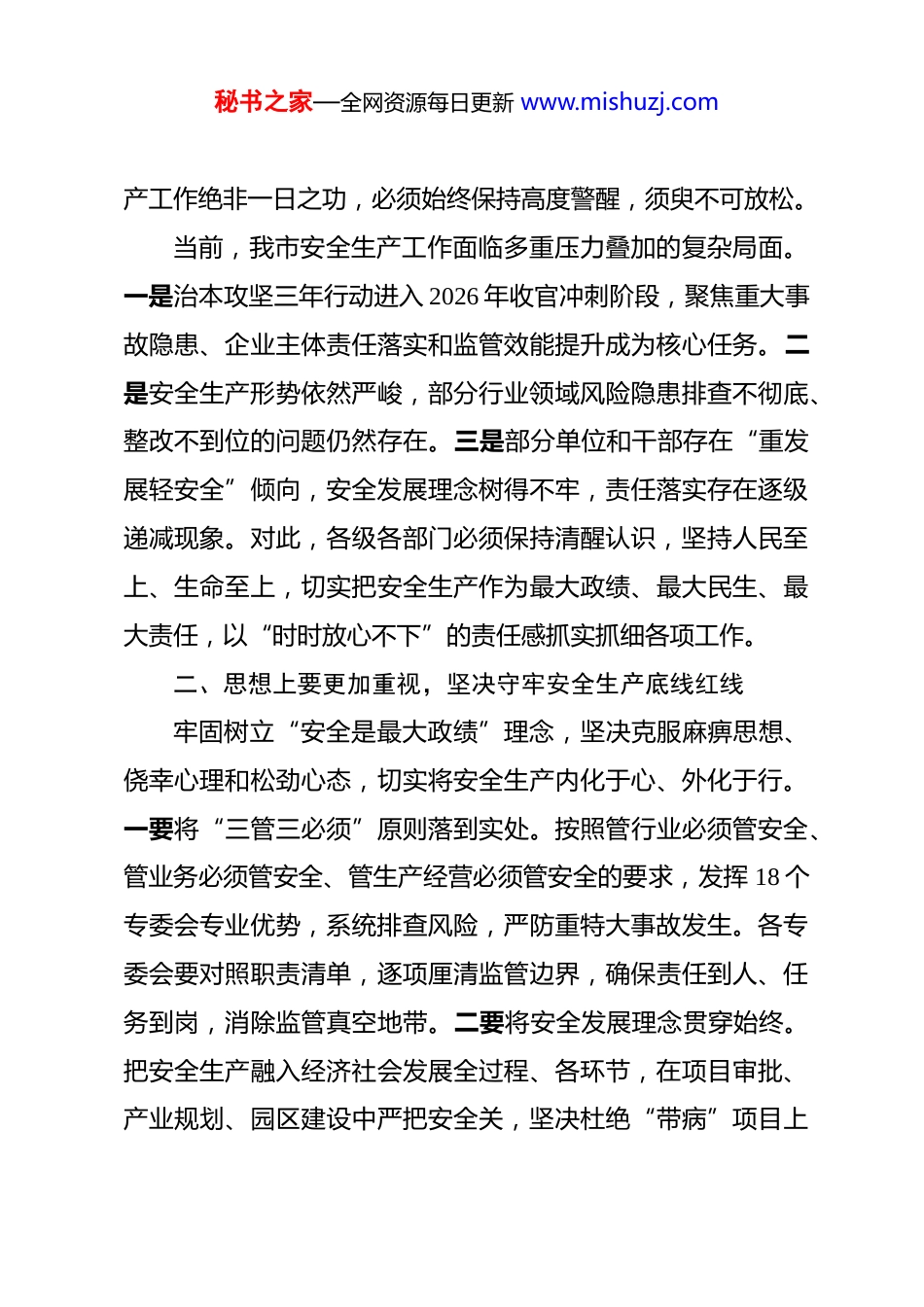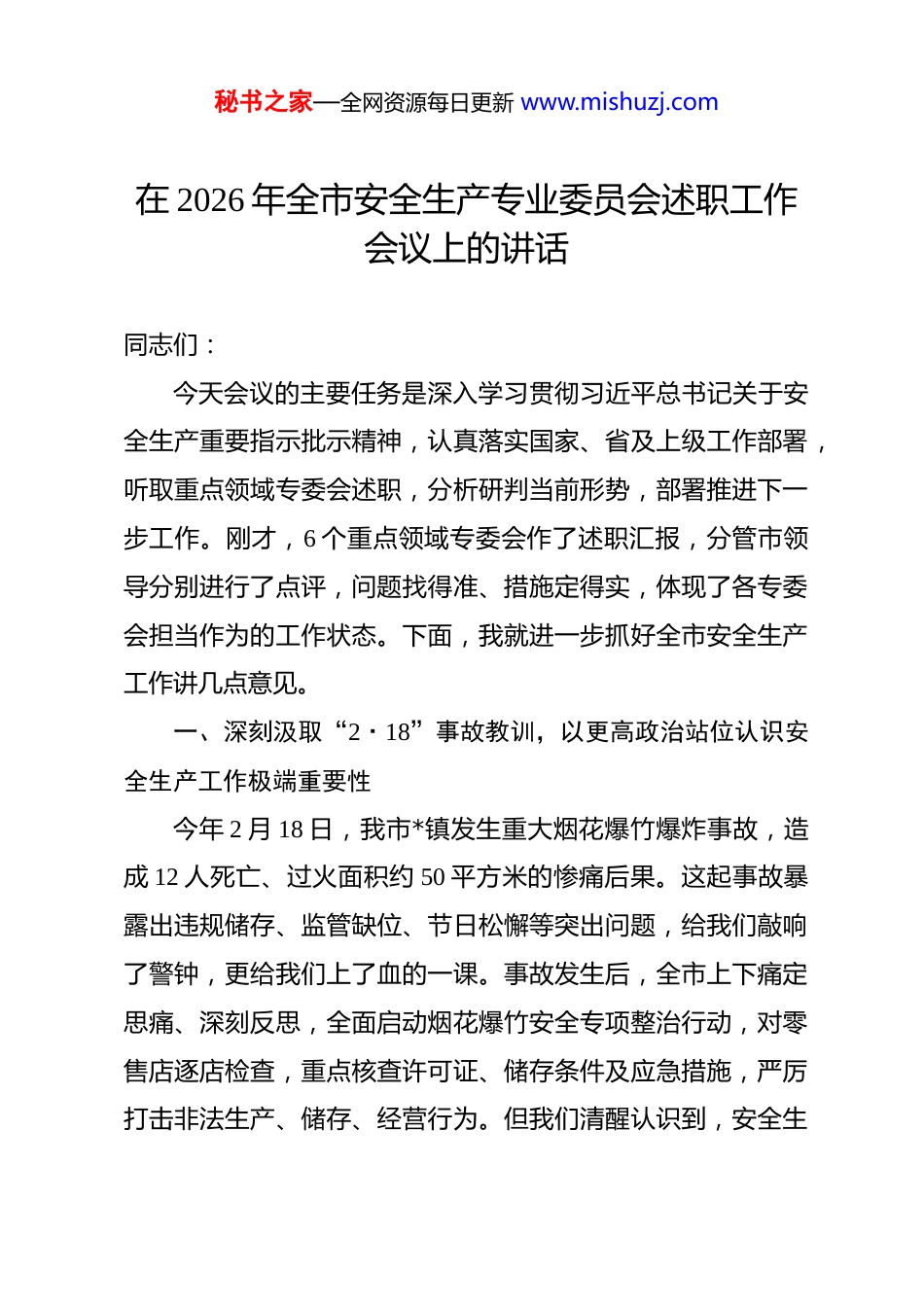 秘书之家—全网资源每日更新 www.mishuzj.com在 2026 年全市安全生产专业委员会述职工作会议上的讲话 同志们:今天会议的主要任务是深入学习贯彻习近平总书记关于安全生产重要指示批示精神,认真落实国家、省及上级工作部署,听取重点领域专委会述职,分析研判当前形势,部署推进下一步工作。刚才,6 个重点领域专委会作了述职汇报,分管市领导分别进行了点评,问题找得准、措施定得实,体现了各专委会担当作为的工作状态。下面,我就进一步抓好全市安全生产工作讲几点意见。一、深刻汲取“2·18”事故教训,以更高政治站位认识安全生产工作极端重要性今年 2 月 18 日,我市*镇发生重大烟花爆竹爆炸事故,造成 12 人死亡、过火面积约 50 平方米的惨痛后果。这起事故暴露出违规储存、监管缺位、节日松懈等突出问题,给我们敲响了警钟,更给我们上了血的一课。事故发生后,全市上下痛定思痛、深刻反思,全面启动烟花爆竹安全专项整治行动,对零售店逐店检查,重点核查许可证、储存条件及应急措施,严厉打击非法生产、储存、经营行为。但我们清醒认识到,安全生秘书之家—全网资源每日更新 www.mishuzj.com产工作绝非一日之功,必须始终保持高度警醒,须臾不可放松。当前,我市安全生产工作面临多重压力叠加的复杂局面。一是治本攻坚三年行动进入 2026 年收官冲刺阶段,聚焦重大事故隐患、企业主体责任落实和监管效能提升成为核心任务。二是安全生产形势依然严峻,部分行业领域风险隐患排查不彻底、整改不到位的问题仍然存在。三是部分单位和干部存在“重发展轻安全”倾向,安全发展理念树得不牢,责任落实存在逐级递减现象。对此,各级各部门必须保持清醒认识,坚持人民至上、生命至上,切实把安全生产作为最大政绩、最大民生、最大责任,以“时时放心不下”的责任感抓实抓细各项工作。二、思想上要更加重视,坚决守牢安全生产底线红线牢固树立“安全是最大政绩”理念,坚决克服麻痹思想、侥幸心理和松劲心态,切实将安全生产内化于心、外化于行。一要将“三管三必须”原则落到实处。按照管行业必须管安全、管业务必须管安全、管生产经营必须管安全的要求,发挥 18 个专委会专业优势,系统排查风险,严防重特大事故发生。各专委会要对照职责清单,逐项厘清监管边界,确保责任到人、任务到岗,消除监管真空地带。二要将安全发展理念贯穿始终。把安全生产融入经济社会发展全过程、各环节,在项目审批、产业规划、园区建设中严把安全关,坚决杜绝“带病”项目上秘书之家—全网资源每日更新 www.mishuzj.com马。三要将风险意识转化为行动自觉。深刻认识当前安全生产工作的长期性、复杂性和艰巨性,时刻绷紧安全这根弦,做到警钟长鸣、常抓不懈,变被动应对为主动预防。三、举措上要更细更实,全面提升安全监管规范化水平对照清单厘清职责,精准摸排监管底数,复盘许可事项,确保监管工作精准有效。一是要深入开展隐患排查整治。围绕民爆物品、特种设备、综合交通、水利、农业农村、能源等重点领域,组织专业力量开展拉网式排查,建立问题清单、责任清单、整改清单,实行销号管理、闭环整改。对排查出的隐患,能立即整改的要立行立改,需要一定条件的要明确整改期限、责任人和整改措施,确保隐患见底、措施到底、整改彻底。二是要健全完善监管工作机制。探索“综合查一次”“一次查全面”创新模式,打破部门壁垒,强化信息共享与联合执法,织密防控网格。建立分级分类监管体系,根据企业风险等级实施差异化监管,提高监管效能。三是要强化源头管控和准入管理。严格安全生产行政许可,对不符合安全生产条件的企业坚决不予审批,对存在重大安全隐患的企业责令停产整顿,对整改仍不达标的依法予以关闭。四、执法上要更严更硬,切实压实安全生产各方责任敢于动真碰硬,建立分级惩戒机制,推动安全生产责任全秘书之家—全网资源每日更新 www.mishuzj.com面落实。一是要严格执法检查。对首次违规未造成后果的限期整改,对屡教不改的坚决清退出市场。加大“四不两直”、暗查暗访力度,提升检查实效。严肃查处各类安全生产违法行为,做到有法必依、执法必严、违法必究。二是要...