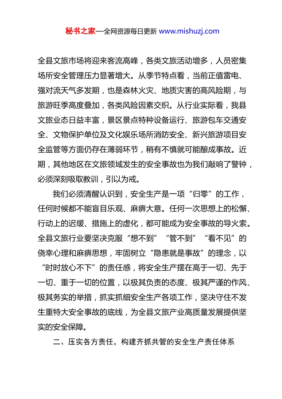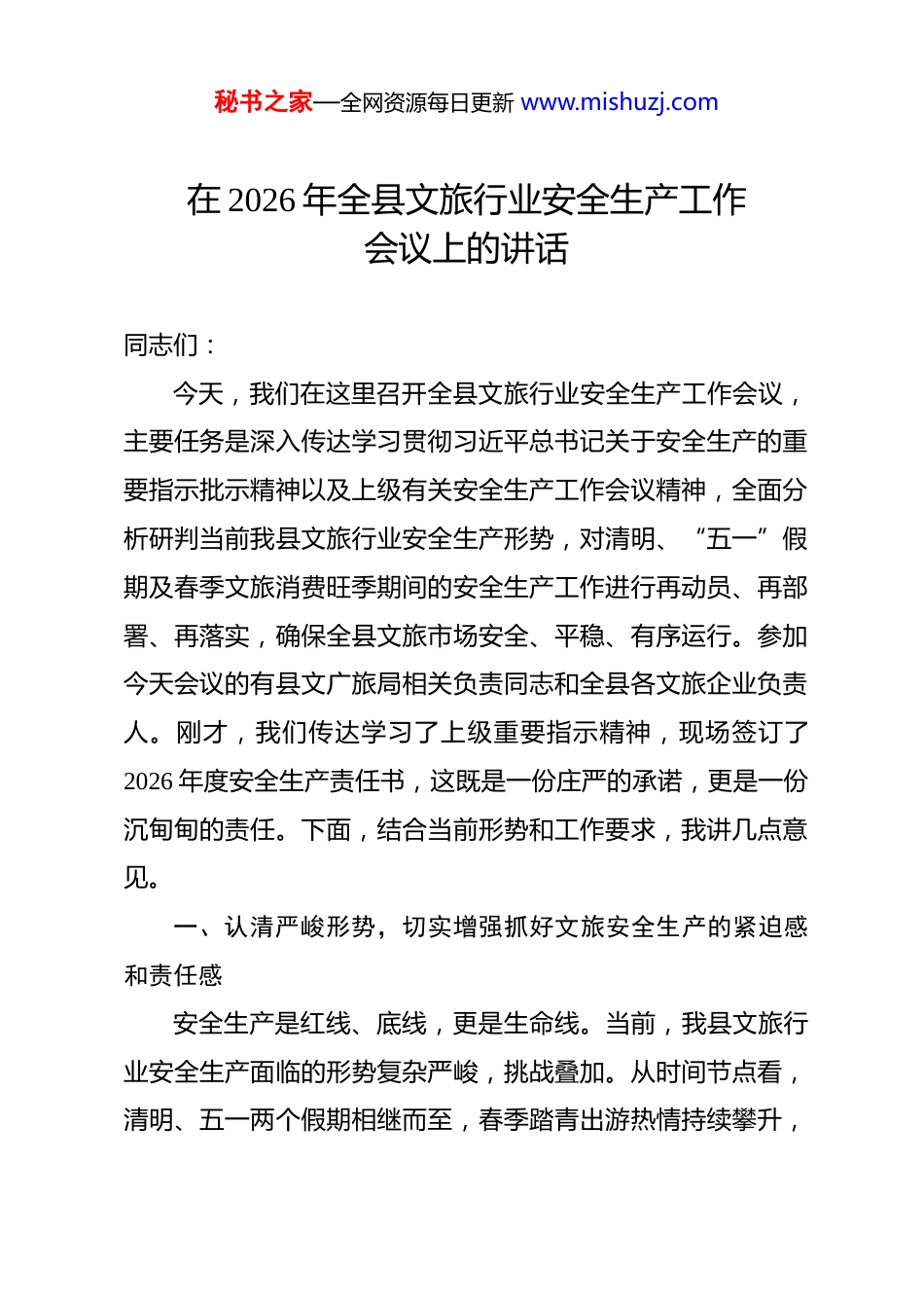 秘书之家—全网资源每日更新 www.mishuzj.com在 2026 年全县文旅行业安全生产工作会议上的讲话 同志们:今天,我们在这里召开全县文旅行业安全生产工作会议,主要任务是深入传达学习贯彻习近平总书记关于安全生产的重要指示批示精神以及上级有关安全生产工作会议精神,全面分析研判当前我县文旅行业安全生产形势,对清明、“五一”假期及春季文旅消费旺季期间的安全生产工作进行再动员、再部署、再落实,确保全县文旅市场安全、平稳、有序运行。参加今天会议的有县文广旅局相关负责同志和全县各文旅企业负责人。刚才,我们传达学习了上级重要指示精神,现场签订了2026 年度安全生产责任书,这既是一份庄严的承诺,更是一份沉甸甸的责任。下面,结合当前形势和工作要求,我讲几点意见。一、认清严峻形势,切实增强抓好文旅安全生产的紧迫感和责任感安全生产是红线、底线,更是生命线。当前,我县文旅行业安全生产面临的形势复杂严峻,挑战叠加。从时间节点看,清明、五一两个假期相继而至,春季踏青出游热情持续攀升,秘书之家—全网资源每日更新 www.mishuzj.com全县文旅市场将迎来客流高峰,各类文旅活动增多,人员密集场所安全管理压力显著增大。从季节特点看,当前正值雷电、强对流天气多发期,也是森林火灾、地质灾害的高风险期,与旅游旺季高度叠加,各类风险因素交织。从行业实际看,我县文旅业态日益丰富,景区景点特种设备运行、旅游包车交通安全、文物保护单位及文化娱乐场所消防安全、新兴旅游项目安全监管等方面仍存在薄弱环节,稍有不慎就可能酿成事故。近期,其他地区在文旅领域发生的安全事故也为我们敲响了警钟,必须深刻吸取教训,引以为戒。我们必须清醒认识到,安全生产是一项“归零”的工作,任何时候都不能盲目乐观、麻痹大意。任何一次思想上的松懈、行动上的迟缓、措施上的虚化,都可能成为安全事故的导火索。全县文旅行业要坚决克服“想不到”“管不到”“看不见”的侥幸心理和麻痹思想,牢固树立“隐患就是事故”的理念,以“时时放心不下”的责任感,将安全生产摆在高于一切、先于一切、重于一切的位置,以极其负责的态度、极其严谨的作风、极其务实的举措,抓实抓细安全生产各项工作,坚决守住不发生重特大安全事故的底线,为全县文旅产业高质量发展提供坚实的安全保障。二、压实各方责任,构建齐抓共管的安全生产责任体系秘书之家—全网资源每日更新 www.mishuzj.com责任落实是安全生产的灵魂。确保安全,必须首先明晰并压实责任。刚才我们签订了责任书,这只是一个开始,关键在于将纸上的承诺转化为实实在在的行动。一要严格落实企业主体责任。企业是安全生产的内因和根本。各文旅企业主要负责人必须切实履行安全生产第一责任人责任,对本单位安全生产负总责。要建立健全全员安全生产责任制,做到安全责任、投入、培训、管理和应急救援“五到位”。要依法设立安全管理机构或配备安全管理人员,保障安全投入,改善安全条件。要将安全生产责任层层分解到每一个部门、每一个班组、每一个岗位、每一名员工,确保责任无死角、管理无盲区。要定期开展安全风险辨识评估和隐患排查治理,主动消除安全隐患。二要严格落实部门监管责任。县文广旅局作为行业主管部门,要坚决扛起“管行业必须管安全”的政治责任。要紧紧围绕安全生产治本攻坚三年行动收官要求,制定并落实年度监督检查计划,创新监管方式,运用“双随机、一公开”检查、专项督查、明察暗访等手段,加强对文旅企业的日常监管和指导服务。要建立健全安全风险分级管控和隐患排查治理双重预防机制,推动安全生产治理模式向事前预防转型。要依法依规履行安全生产行政许可、执法检查等职责,对发现的违法违规行秘书之家—全网资源每日更新 www.mishuzj.com为,坚决依法查处。要完善与应急管理、市场监管、消防、交通、林业、自然资源等部门的协同联动机制,形成监管合力。三要严格落实属地管理责任。安全生产工作必须依靠地方党委、政府的坚强领导。我们将积极向县委、县政府汇报文旅行业安全形势和工作建议,推动将文旅安全纳入全县安全生产整体部署和考核体系。要推动乡镇落实对辖区内文旅经营...
