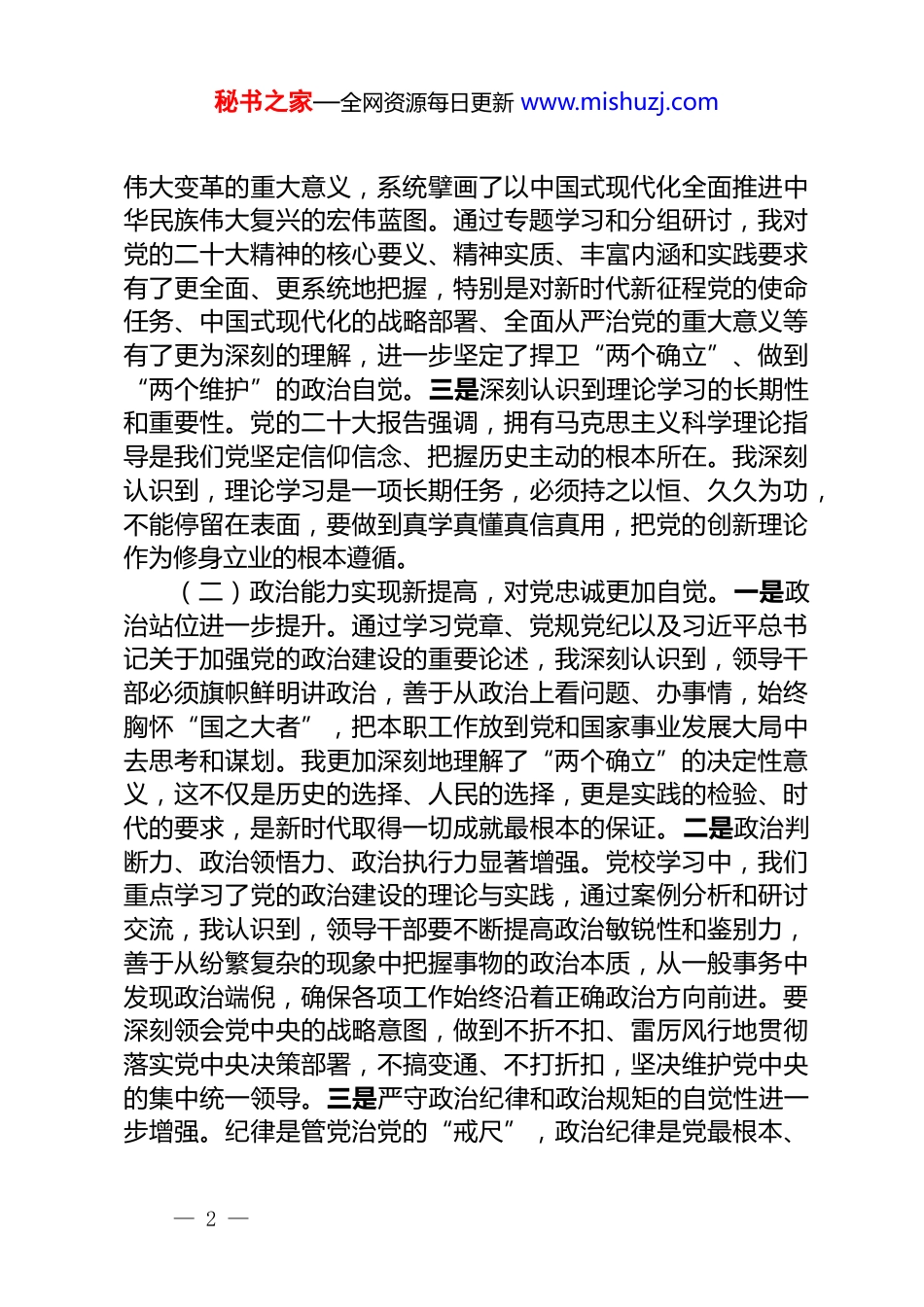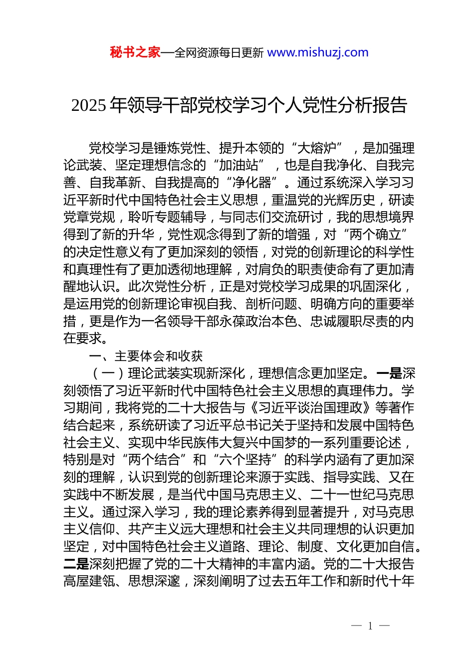 秘书之家—全网资源每日更新 www.mishuzj.com2025 年领导干部党校学习个人党性分析报告党校学习是锤炼党性、提升本领的“大熔炉”,是加强理论武装、坚定理想信念的“加油站”,也是自我净化、自我完善、自我革新、自我提高的“净化器”。通过系统深入学习习近平新时代中国特色社会主义思想,重温党的光辉历史,研读党章党规,聆听专题辅导,与同志们交流研讨,我的思想境界得到了新的升华,党性观念得到了新的增强,对“两个确立”的决定性意义有了更加深刻的领悟,对党的创新理论的科学性和真理性有了更加透彻地理解,对肩负的职责使命有了更加清醒地认识。此次党性分析,正是对党校学习成果的巩固深化,是运用党的创新理论审视自我、剖析问题、明确方向的重要举措,更是作为一名领导干部永葆政治本色、忠诚履职尽责的内在要求。一、主要体会和收获(一)理论武装实现新深化,理想信念更加坚定。一是深刻领悟了习近平新时代中国特色社会主义思想的真理伟力。学习期间,我将党的二十大报告与《习近平谈治国理政》等著作结合起来,系统研读了习近平总书记关于坚持和发展中国特色社会主义、实现中华民族伟大复兴中国梦的一系列重要论述,特别是对“两个结合”和“六个坚持”的科学内涵有了更加深刻的理解,认识到党的创新理论来源于实践、指导实践、又在实践中不断发展,是当代中国马克思主义、二十一世纪马克思主义。通过深入学习,我的理论素养得到显著提升,对马克思主义信仰、共产主义远大理想和社会主义共同理想的认识更加坚定,对中国特色社会主义道路、理论、制度、文化更加自信。二是深刻把握了党的二十大精神的丰富内涵。党的二十大报告高屋建瓴、思想深邃,深刻阐明了过去五年工作和新时代十年— 1 —秘书之家—全网资源每日更新 www.mishuzj.com伟大变革的重大意义,系统擘画了以中国式现代化全面推进中华民族伟大复兴的宏伟蓝图。通过专题学习和分组研讨,我对党的二十大精神的核心要义、精神实质、丰富内涵和实践要求有了更全面、更系统地把握,特别是对新时代新征程党的使命任务、中国式现代化的战略部署、全面从严治党的重大意义等有了更为深刻的理解,进一步坚定了捍卫“两个确立”、做到“两个维护”的政治自觉。三是深刻认识到理论学习的长期性和重要性。党的二十大报告强调,拥有马克思主义科学理论指导是我们党坚定信仰信念、把握历史主动的根本所在。我深刻认识到,理论学习是一项长期任务,必须持之以恒、久久为功,不能停留在表面,要做到真学真懂真信真用,把党的创新理论作为修身立业的根本遵循。(二)政治能力实现新提高,对党忠诚更加自觉。一是政治站位进一步提升。通过学习党章、党规党纪以及习近平总书记关于加强党的政治建设的重要论述,我深刻认识到,领导干部必须旗帜鲜明讲政治,善于从政治上看问题、办事情,始终胸怀“国之大者”,把本职工作放到党和国家事业发展大局中去思考和谋划。我更加深刻地理解了“两个确立”的决定性意义,这不仅是历史的选择、人民的选择,更是实践的检验、时代的要求,是新时代取得一切成就最根本的保证。二是政治判断力、政治领悟力、政治执行力显著增强。党校学习中,我们重点学习了党的政治建设的理论与实践,通过案例分析和研讨交流,我认识到,领导干部要不断提高政治敏锐性和鉴别力,善于从纷繁复杂的现象中把握事物的政治本质,从一般事务中发现政治端倪,确保各项工作始终沿着正确政治方向前进。要深刻领会党中央的战略意图,做到不折不扣、雷厉风行地贯彻落实党中央决策部署,不搞变通、不打折扣,坚决维护党中央的集中统一领导。三是严守政治纪律和政治规矩的自觉性进一步增强。纪律是管党治党的“戒尺”,政治纪律是党最根本、— 2 —秘书之家—全网资源每日更新 www.mishuzj.com最重要的纪律。通过对党内政治生活的若干准则、纪律处分条例的再学习,我进一步强化了对纪律和规矩的敬畏之心,认识到必须时刻绷紧纪律这根弦,严格遵守党的各项纪律特别是政治纪律和政治规矩,做到令行禁止、步调一致,确保在思想上政治上行动上同以习近平同志为核心的党中央保持高度一致。(三)宗旨意识实现新强...
