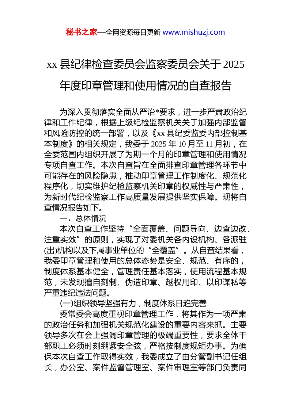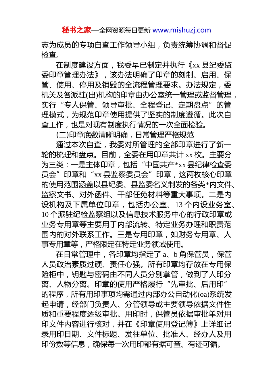 秘书之家—全网资源每日更新 www.mishuzj.comxx 县纪律检查委员会监察委员会关于 2025年度印章管理和使用情况的自查报告为深入贯彻落实全面从严治*要求,进一步严肃政治纪律和工作纪律,根据上级纪检监察机关关于加强内部监督和风险防控的统一部署,以及《xx 县纪委监委内部控制基本制度》的相关规定,我委于 2025 年 10 月至 11 月初,在全委范围内组织开展了为期一个月的印章管理和使用情况专项自查工作。本次自查旨在全面排查印章管理各环节中可能存在的风险隐患,推动印章管理工作制度化、规范化程序化,切实维护纪检监察机关印章的权威性与严肃性,为新时代纪检监察工作高质量发展提供坚实保障。现将自查情况报告如下。一、总体情况本次自查工作坚持“全面覆盖、问题导向、边查边改、注重实效”的原则,实现了对委机关各内设机构、各派驻(出)机构以及下属事业单位的“全覆盖”。从自查结果看,我委印章管理和使用的总体态势是安全、规范、有序的,制度体系基本健全,管理责任基本落实,使用流程基本规范,未发现擅自刻制、伪造印章、越权用印、以印谋私等严重违纪违法问题。(一)组织领导坚强有力,制度体系日趋完善委常委会高度重视印章管理工作,将其作为一项严肃的政治任务和加强机关规范化建设的重要内容来抓。主要领导多次在会上强调印章管理的极端重要性,要求全体干部职工必须时刻绷紧安全弦,严格按制度规矩办事。为确保本次自查工作取得实效,我委成立了由分管副书记任组长,办公室、案件监督管理室、案件审理室等部门负责同秘书之家—全网资源每日更新 www.mishuzj.com志为成员的专项自查工作领导小组,负责统筹协调和督促检查。在制度建设方面,我委早已制定并执行《xx 县纪委监委印章管理办法》,该办法明确了印章的刻制、启用、保管、使用、停用及销毁的全流程管理要求。办法规定,委机关及各派驻(出)机构的印章由办公室统一管理或监督管理,实行“专人保管、领导审批、全程登记、定期盘点”的管理模式,为规范印章使用提供了坚实的制度遵循。此次自查工作,也是对现有制度执行情况的一次全面检验。(二)印章底数清晰明确,日常管理严格规范通过本次自查,我委对所管理的全部印章进行了新一轮的梳理和盘点。目前,全委在用印章共计 xx 枚。主要分为三类:一是主体印章,包括“中国共产*xx 县纪律检查委员会”印章和“xx 县监察委员会”印章,这两枚核心印章的使用范围涵盖以县纪委、县监委名义制发的各类*内文件、监察文书、对外函件、干部任免材料等重大事项。二是内设机构及下属单位印章,包括办公室、13 个内设业务室、10 个派驻纪检监察组以及信息技术服务中心的行政印章或业务专用章等主要用于内部流转、特定业务办理和职责范围内的对外联系工作。三是专用印章,如财务专用章、人事专用章等,严格限定在特定业务领域使用。在日常管理中,各印章均指定了 a、b 角保管员,保管人员政治素质过硬、责任心强。所有印章均存放在专用保险柜中,钥匙与密码由不同人员分别掌管,做到了人印分离、人物分离。印章的使用严格履行“先审批、后用印”的程序,所有用印事项均需通过内部办公自动化(oa)系统发起申请,经部门负责人、分管领导或主要领导依据文件性质和重要程度逐级审批。用印时,保管员依据审批单对用印文件内容进行核对,并在《印章使用登记簿》上详细记录用印日期、文件标题、发往单位、批准人、经办人及用印份数等信息,确保每一次用印都有据可查、有迹可循。秘书之家—全网资源每日更新 www.mishuzj.com(三)自查方式科学严谨,检查过程深入细致本次自查采取“各室(部、组)自查自纠”与“领导小组重点抽查”相结合的方式进行。第一阶段为自查自纠阶段要求各部门对照《xx 县纪委监委印章管理办法》和相关规定,对本部门持有或使用的印章管理情况进行全面梳理,重点检查印章保管是否安全、使用审批是否合规、登记信息是否完整、归档管理是否规范等内容,并形成自查报告。第二阶段为重点抽查阶段,自查工作领导小组采取不打招呼、随机抽查的方式,深入到各部门,通过查阅用印登记台账、核验 oa 系统审批流程、抽查已归档的用印文件等方...