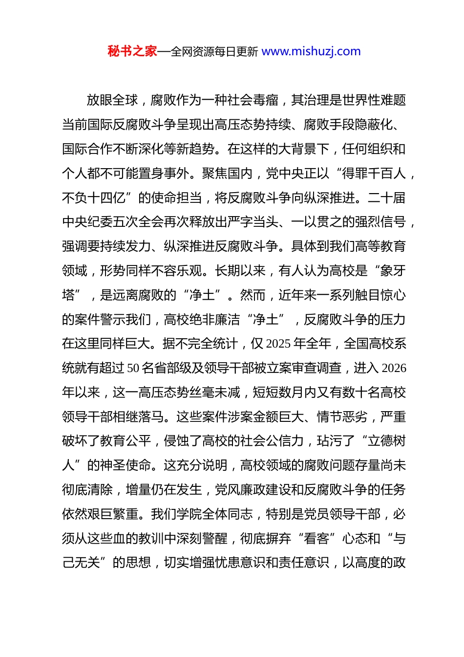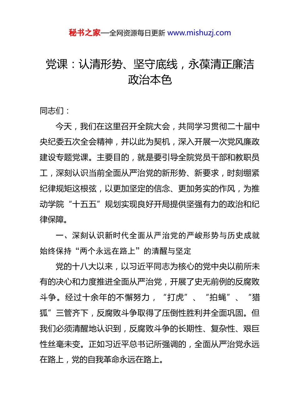 秘书之家—全网资源每日更新 www.mishuzj.com党课:认清形势、坚守底线,永葆清正廉洁政治本色 同志们:今天,我们在这里召开全院大会,共同学习贯彻二十届中央纪委五次全会精神,并以此为契机,深入开展一次党风廉政建设专题党课。主要目的,就是要引导全院党员干部和教职员工,深刻认识当前全面从严治党的新形势、新要求,时刻绷紧纪律规矩这根弦,以更加坚定的信念、更加务实的作风,为推动学院“十五五”规划实现良好开局提供坚强有力的政治和纪律保障。一、深刻认识新时代全面从严治党的严峻形势与历史成就始终保持“两个永远在路上”的清醒与坚定党的十八大以来,以习近平同志为核心的党中央以前所未有的决心和力度推进全面从严治党,开展了史无前例的反腐败斗争。经过十余年的不懈努力,“打虎”、“拍蝇”、“猎狐”三管齐下,反腐败斗争取得了压倒性胜利并全面巩固。但我们必须清醒地认识到,反腐败斗争的长期性、复杂性、艰巨性丝毫未变。正如习近平总书记所强调的,全面从严治党永远在路上,党的自我革命永远在路上。秘书之家—全网资源每日更新 www.mishuzj.com放眼全球,腐败作为一种社会毒瘤,其治理是世界性难题当前国际反腐败斗争呈现出高压态势持续、腐败手段隐蔽化、国际合作不断深化等新趋势。在这样的大背景下,任何组织和个人都不可能置身事外。聚焦国内,党中央正以“得罪千百人,不负十四亿”的使命担当,将反腐败斗争向纵深推进。二十届中央纪委五次全会再次释放出严字当头、一以贯之的强烈信号,强调要持续发力、纵深推进反腐败斗争。具体到我们高等教育领域,形势同样不容乐观。长期以来,有人认为高校是“象牙塔”,是远离腐败的“净土”。然而,近年来一系列触目惊心的案件警示我们,高校绝非廉洁“净土”,反腐败斗争的压力在这里同样巨大。据不完全统计,仅 2025 年全年,全国高校系统就有超过 50 名省部级及领导干部被立案审查调查,进入 2026年以来,这一高压态势丝毫未减,短短数月内又有数十名高校领导干部相继落马。这些案件涉案金额巨大、情节恶劣,严重破坏了教育公平,侵蚀了高校的社会公信力,玷污了“立德树人”的神圣使命。这充分说明,高校领域的腐败问题存量尚未彻底清除,增量仍在发生,党风廉政建设和反腐败斗争的任务依然艰巨繁重。我们学院全体同志,特别是党员领导干部,必须从这些血的教训中深刻警醒,彻底摒弃“看客”心态和“与己无关”的思想,切实增强忧患意识和责任意识,以高度的政秘书之家—全网资源每日更新 www.mishuzj.com治自觉投入到这场输不起也决不能输的斗争中去。二、深入剖析高校腐败问题的成因机理与突出风险,精准把握“靶心”,筑牢“防线”腐败的本质,是公权力的异化和滥用。高校作为知识、权力和资源的交汇点,同样存在滋生腐败的土壤和条件。深入分析近年来查处的高校腐败案件,我们可以发现其规律与特点,主要集中在以下几个高风险领域,这些领域也是上级主管部门和纪检监察机关反复强调需要重点防控的风险点:(一)基建工程与物资采购领域。高校基建项目投资巨大专业性强,决策链条长,从项目立项、招标投标、工程变更到物资采购、款项支付,每一个环节都存在巨大的廉政风险。一些不法分子与校内掌握权力的干部内外勾结,通过违规插手、设置门槛、虚报造价等方式大搞权钱交易,把教育工程项目变成了“腐败温床”和个人“提款机”。教育部发布的《直属高校和直属单位基本建设廉政风险防控手册》中,就梳理出 142个廉政风险点,其中工程招标环节的风险等级最高。(二)科研经费管理与使用领域。随着国家对科技创新的投入持续加大,高校科研经费体量快速增长。但与此同时,管理制度和监督机制未能同步跟上,给一些人留下了可乘之机。他们利用项目申报、经费报销、设备采购等环节的漏洞,采取秘书之家—全网资源每日更新 www.mishuzj.com虚列开支、套取现金、违规外包、化公为私等手段,将宝贵的科研经费装入个人腰包,严重违背了科研诚信,浪费了国家资源。(三)招生录取与人事任免领域。招生和人事权是高校的核心权力之一,直接关系到学生的命运和教职工的职业发展,社会关注度极高。少数...