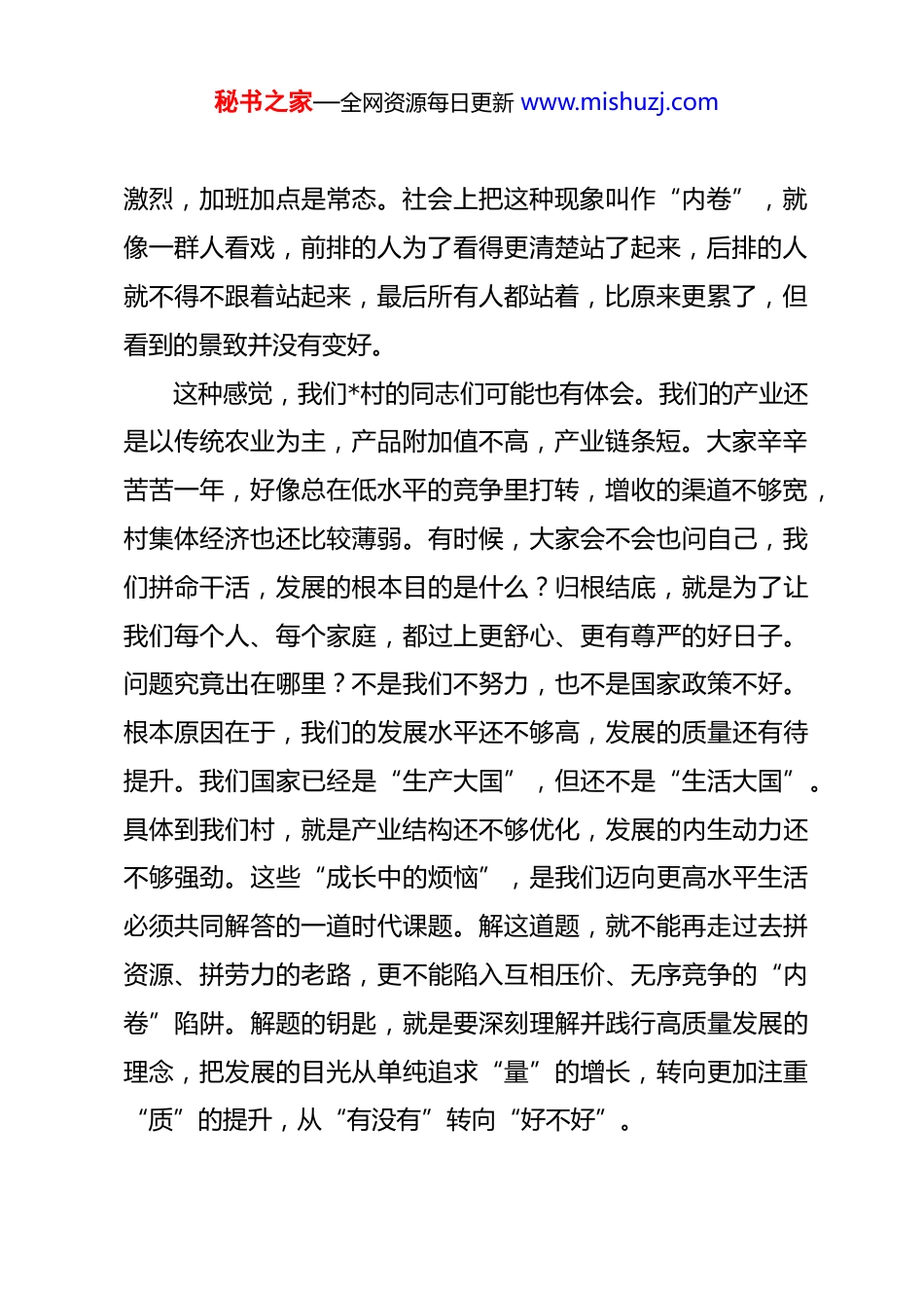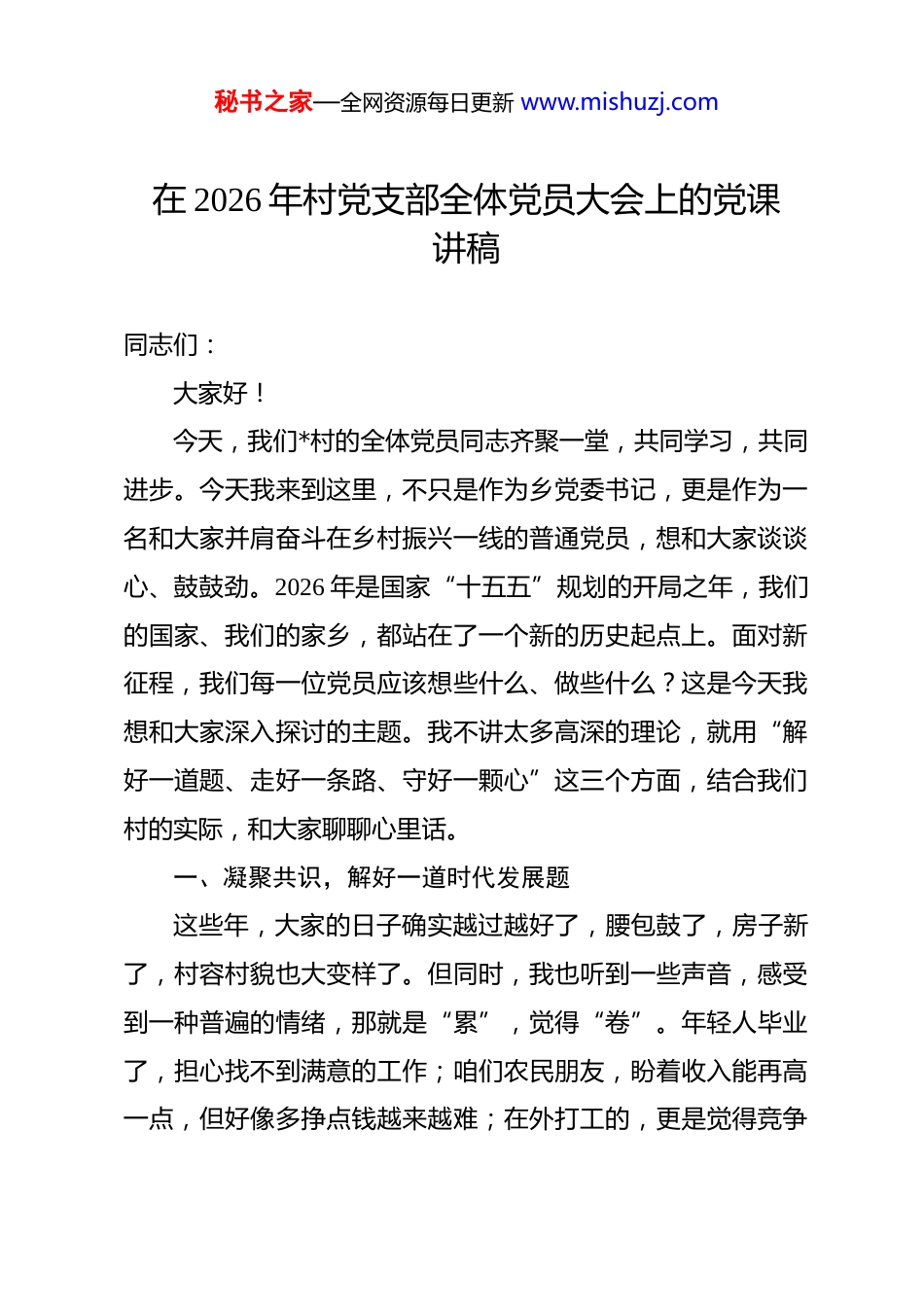 秘书之家—全网资源每日更新 www.mishuzj.com在 2026 年村党支部全体党员大会上的党课讲稿 同志们:大家好!今天,我们*村的全体党员同志齐聚一堂,共同学习,共同进步。今天我来到这里,不只是作为乡党委书记,更是作为一名和大家并肩奋斗在乡村振兴一线的普通党员,想和大家谈谈心、鼓鼓劲。2026 年是国家“十五五”规划的开局之年,我们的国家、我们的家乡,都站在了一个新的历史起点上。面对新征程,我们每一位党员应该想些什么、做些什么?这是今天我想和大家深入探讨的主题。我不讲太多高深的理论,就用“解好一道题、走好一条路、守好一颗心”这三个方面,结合我们村的实际,和大家聊聊心里话。一、凝聚共识,解好一道时代发展题这些年,大家的日子确实越过越好了,腰包鼓了,房子新了,村容村貌也大变样了。但同时,我也听到一些声音,感受到一种普遍的情绪,那就是“累”,觉得“卷”。年轻人毕业了,担心找不到满意的工作;咱们农民朋友,盼着收入能再高一点,但好像多挣点钱越来越难;在外打工的,更是觉得竞争秘书之家—全网资源每日更新 www.mishuzj.com激烈,加班加点是常态。社会上把这种现象叫作“内卷”,就像一群人看戏,前排的人为了看得更清楚站了起来,后排的人就不得不跟着站起来,最后所有人都站着,比原来更累了,但看到的景致并没有变好。这种感觉,我们*村的同志们可能也有体会。我们的产业还是以传统农业为主,产品附加值不高,产业链条短。大家辛辛苦苦一年,好像总在低水平的竞争里打转,增收的渠道不够宽,村集体经济也还比较薄弱。有时候,大家会不会也问自己,我们拼命干活,发展的根本目的是什么?归根结底,就是为了让我们每个人、每个家庭,都过上更舒心、更有尊严的好日子。问题究竟出在哪里?不是我们不努力,也不是国家政策不好。根本原因在于,我们的发展水平还不够高,发展的质量还有待提升。我们国家已经是“生产大国”,但还不是“生活大国”。具体到我们村,就是产业结构还不够优化,发展的内生动力还不够强劲。这些“成长中的烦恼”,是我们迈向更高水平生活必须共同解答的一道时代课题。解这道题,就不能再走过去拼资源、拼劳力的老路,更不能陷入互相压价、无序竞争的“内卷”陷阱。解题的钥匙,就是要深刻理解并践行高质量发展的理念,把发展的目光从单纯追求“量”的增长,转向更加注重“质”的提升,从“有没有”转向“好不好”。秘书之家—全网资源每日更新 www.mishuzj.com二、实干为要,走好一条高质量发展路党中央提出,高质量发展是全面建设社会主义现代化国家的首要任务。“十五五”规划建议更是将“高质量发展取得显著成效”放在了主要目标的突出位置。那么,对我们*村而言,这条高质量发展之路,具体应该怎么走?它不是一句空洞的口号,而是需要我们用脚步去丈量、用汗水去浇灌的实实在在的行动。第一,让产业“强”起来,把发展的蛋糕做得更大更优。产业兴旺是乡村振兴的基石,也是高质量发展的核心。我们必须在壮大特色产业上动脑筋、下功夫。高质量发展不是要抛弃传统农业,而是要用新的理念和技术去改造提升它。一是要在“特”字上做文章。要立足我们村的资源禀赋,因地制宜,科学规划,实施“一村一策”,发展有市场前景、有地域特色的产业项目。看看周边的先进村,有的通过发展柑橘产业让荒山变金山,有的把小土豆做成了“金豆豆”。这些案例告诉我们,找准路子是关键。二是要在“链”字上求突破。不能总是满足于卖原材料。要积极探索农产品精深加工,延长产业链,提升附加值。村党支部要带头,党员要示范,积极领办或参与合作社,通过“党建+合作社+农户”的模式,把分散的农户组织起来,抱团闯市场,增强抗风险能力。三是要在“融”字上拓秘书之家—全网资源每日更新 www.mishuzj.com新路。要学习贵州“村超”的智慧,把“日子”和“乐子”结合起来。我们村的文化、生态,都是宝贵的资源。可以思考如何将农业与旅游、文化、康养结合起来,发展乡村旅游、体验式农业,让田园变公园、农产品变礼品,让咱们的生活本身,成为吸引人、创造价值的场景。第二,让治理“优”起来,为高质量发展提供坚强保障。一...