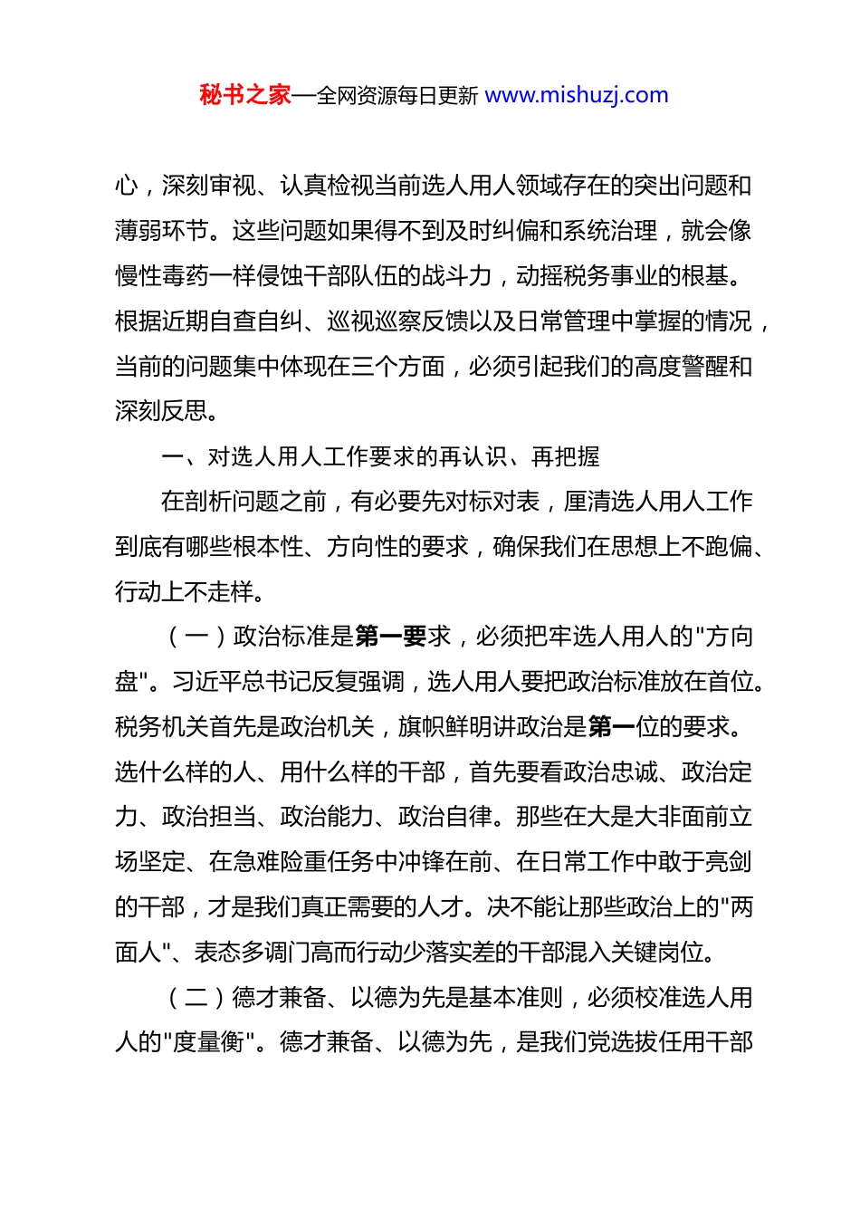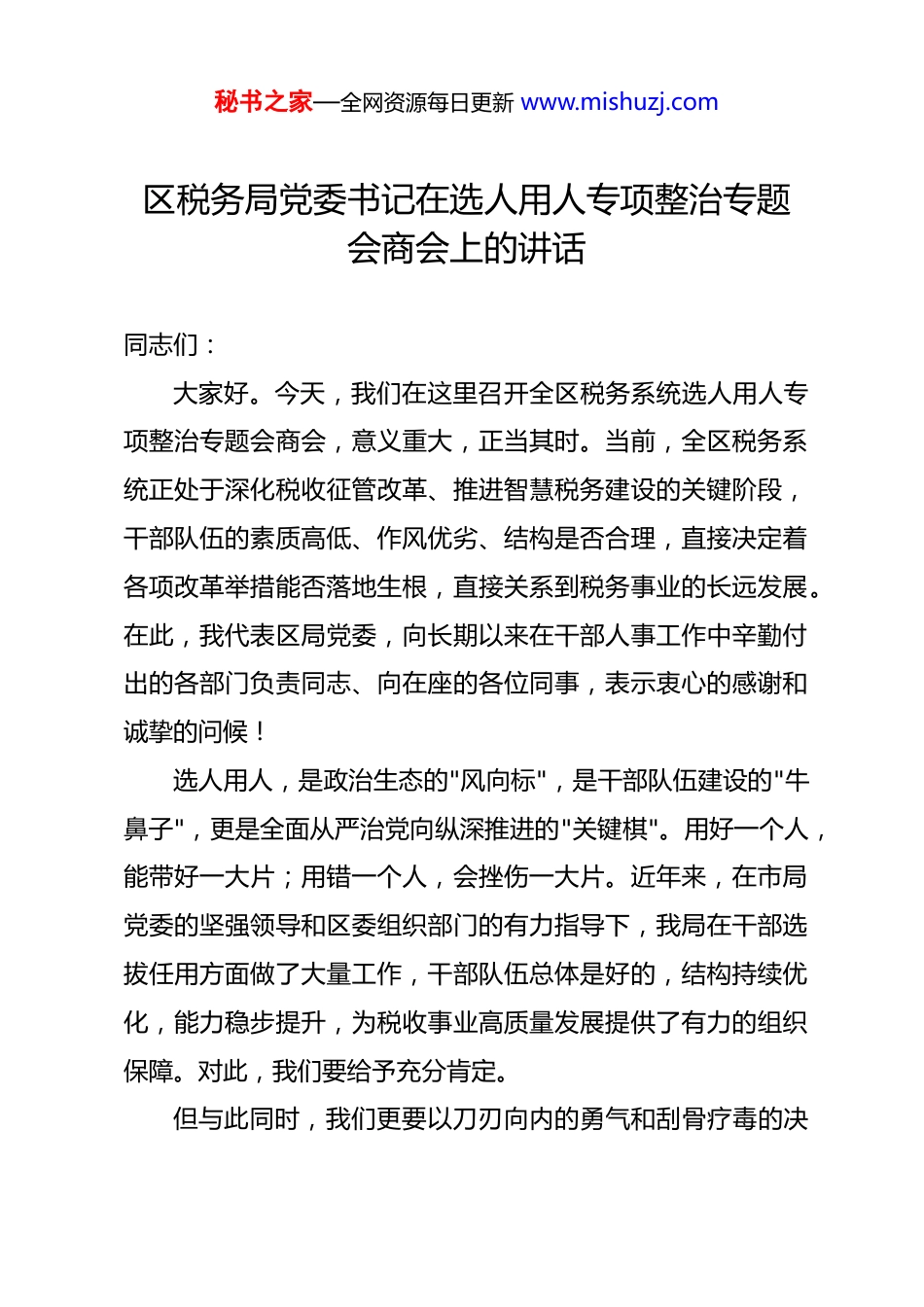秘书之家—全网资源每日更新 www.mishuzj.com区税务局党委书记在选人用人专项整治专题会商会上的讲话 同志们:大家好。今天,我们在这里召开全区税务系统选人用人专项整治专题会商会,意义重大,正当其时。当前,全区税务系统正处于深化税收征管改革、推进智慧税务建设的关键阶段,干部队伍的素质高低、作风优劣、结构是否合理,直接决定着各项改革举措能否落地生根,直接关系到税务事业的长远发展。在此,我代表区局党委,向长期以来在干部人事工作中辛勤付出的各部门负责同志、向在座的各位同事,表示衷心的感谢和诚挚的问候!选人用人,是政治生态的"风向标",是干部队伍建设的"牛鼻子",更是全面从严治党向纵深推进的"关键棋"。用好一个人,能带好一大片;用错一个人,会挫伤一大片。近年来,在市局党委的坚强领导和区委组织部门的有力指导下,我局在干部选拔任用方面做了大量工作,干部队伍总体是好的,结构持续优化,能力稳步提升,为税收事业高质量发展提供了有力的组织保障。对此,我们要给予充分肯定。但与此同时,我们更要以刀刃向内的勇气和刮骨疗毒的决秘书之家—全网资源每日更新 www.mishuzj.com心,深刻审视、认真检视当前选人用人领域存在的突出问题和薄弱环节。这些问题如果得不到及时纠偏和系统治理,就会像慢性毒药一样侵蚀干部队伍的战斗力,动摇税务事业的根基。根据近期自查自纠、巡视巡察反馈以及日常管理中掌握的情况,当前的问题集中体现在三个方面,必须引起我们的高度警醒和深刻反思。一、对选人用人工作要求的再认识、再把握在剖析问题之前,有必要先对标对表,厘清选人用人工作到底有哪些根本性、方向性的要求,确保我们在思想上不跑偏、行动上不走样。(一)政治标准是第一要求,必须把牢选人用人的"方向盘"。习近平总书记反复强调,选人用人要把政治标准放在首位。税务机关首先是政治机关,旗帜鲜明讲政治是第一位的要求。选什么样的人、用什么样的干部,首先要看政治忠诚、政治定力、政治担当、政治能力、政治自律。那些在大是大非面前立场坚定、在急难险重任务中冲锋在前、在日常工作中敢于亮剑的干部,才是我们真正需要的人才。决不能让那些政治上的"两面人"、表态多调门高而行动少落实差的干部混入关键岗位。(二)德才兼备、以德为先是基本准则,必须校准选人用人的"度量衡"。德才兼备、以德为先,是我们党选拔任用干部秘书之家—全网资源每日更新 www.mishuzj.com的一贯方针。在税务系统,"德"不仅体现在政治品德上,还体现在职业道德、社会公德和个人品德上。执法为民的宗旨意识强不强、面对诱惑能不能守住底线、对待纳税人缴费人的态度端不端正,都是"德"的具体体现。同时,专业能力、业务素养、改革创新能力等"才"的维度同样不可或缺。当前税收改革日新月异,没有过硬的本领,光有良好的品行,同样无法胜任岗位要求。德与才如同鸟之双翼、车之两轮,缺一不可。(三)事业为上、人岗相适是根本原则,必须把住选人用人的"适配度"。选人用人的最终目的,是推动事业发展。"骏马能历险,力田不如牛;坚车能载重,渡河不如舟。"每个人都有自己的长处和短板,关键是把合适的人放到合适的岗位上。要从税收事业发展的实际需要出发,因事择人、量才适用,真正做到人尽其才、才尽其用、用当其时。绝不能搞"因人设岗""论资排辈",更不能把干部岗位当作安抚照顾的"福利品"。(四)严管厚爱、激励约束是重要方法,必须用好选人用人的"组合拳"。好干部是选出来的,更是管出来的。选人用人不能只看"选"这一步,更要看"用"之后的跟踪培养和监督管理。要坚持严管与厚爱相结合、激励与约束并重,既要为担当者担当、为负责者负责,营造干事创业的良好氛围;又要抓早抓小、防微杜渐,对苗头性、倾向性问题及时咬耳扯袖、红脸出汗,秘书之家—全网资源每日更新 www.mishuzj.com防止小毛病演变成大问题。二、当前税务系统选人用人领域存在的突出问题剖析对照上述要求,结合我局实际,当前选人用人领域存在的问题不容回避,主要表现在以下几个方面。(一)政治素质考察"虚化弱化",选人用人的政治标尺不够硬。一是政治标准在操作层面"软化"。在干部选拔的具体...