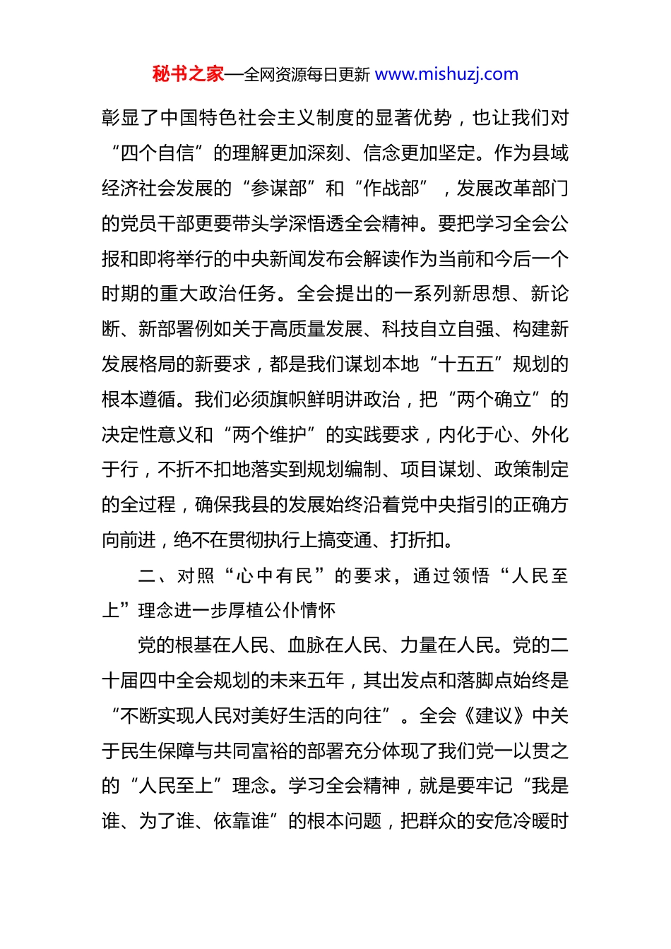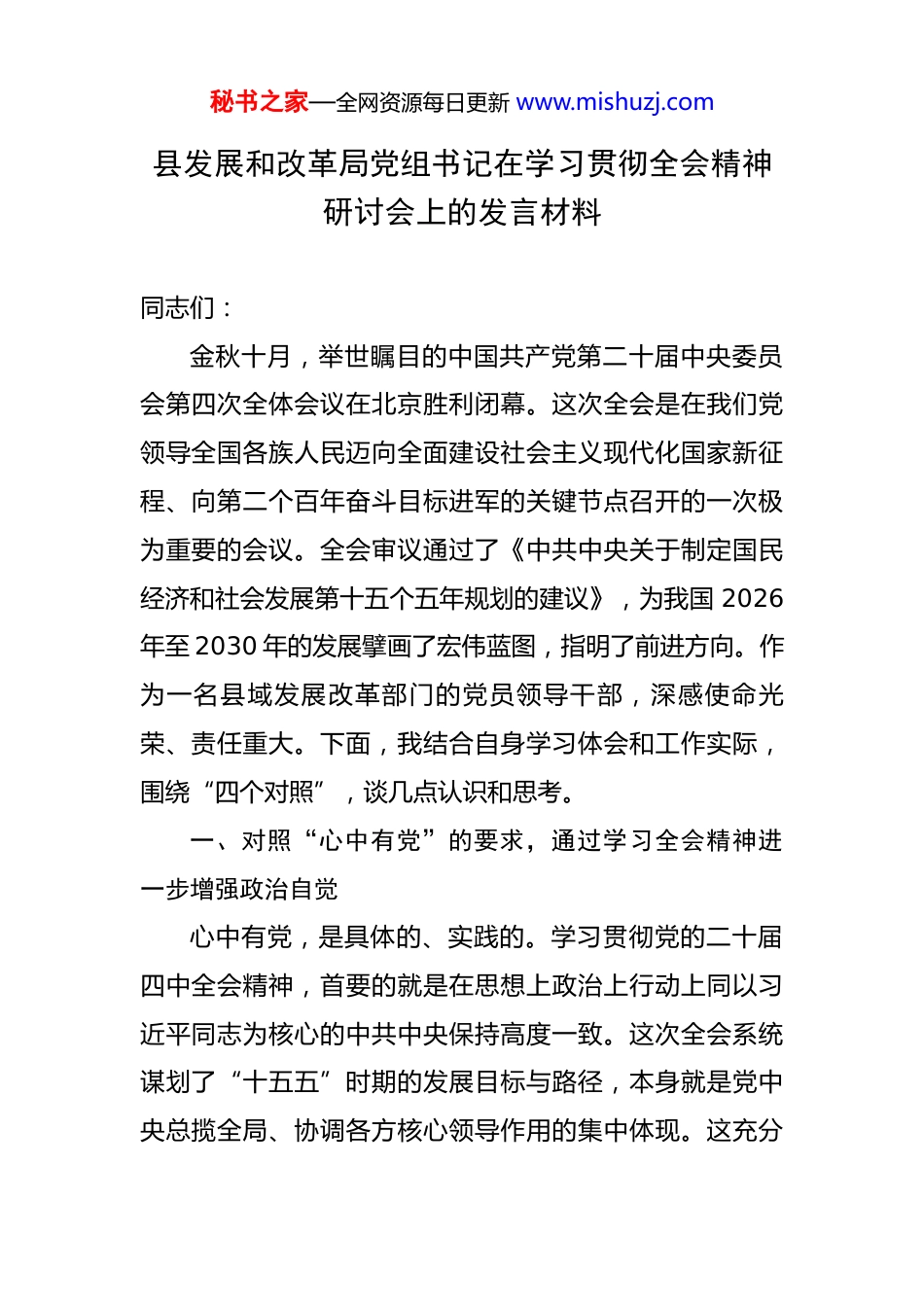 秘书之家—全网资源每日更新 www.mishuzj.com县发展和改革局党组书记在学习贯彻全会精神研讨会上的发言材料 同志们:金秋十月,举世瞩目的中国共产党第二十届中央委员会第四次全体会议在北京胜利闭幕。这次全会是在我们党领导全国各族人民迈向全面建设社会主义现代化国家新征程、向第二个百年奋斗目标进军的关键节点召开的一次极为重要的会议。全会审议通过了《中共中央关于制定国民经济和社会发展第十五个五年规划的建议》,为我国 2026年至 2030 年的发展擘画了宏伟蓝图,指明了前进方向。作为一名县域发展改革部门的党员领导干部,深感使命光荣、责任重大。下面,我结合自身学习体会和工作实际,围绕“四个对照”,谈几点认识和思考。一、对照“心中有党”的要求,通过学习全会精神进一步增强政治自觉心中有党,是具体的、实践的。学习贯彻党的二十届四中全会精神,首要的就是在思想上政治上行动上同以习近平同志为核心的中共中央保持高度一致。这次全会系统谋划了“十五五”时期的发展目标与路径,本身就是党中央总揽全局、协调各方核心领导作用的集中体现。这充分秘书之家—全网资源每日更新 www.mishuzj.com彰显了中国特色社会主义制度的显著优势,也让我们对“四个自信”的理解更加深刻、信念更加坚定。作为县域经济社会发展的“参谋部”和“作战部”,发展改革部门的党员干部更要带头学深悟透全会精神。要把学习全会公报和即将举行的中央新闻发布会解读作为当前和今后一个时期的重大政治任务。全会提出的一系列新思想、新论断、新部署例如关于高质量发展、科技自立自强、构建新发展格局的新要求,都是我们谋划本地“十五五”规划的根本遵循。我们必须旗帜鲜明讲政治,把“两个确立”的决定性意义和“两个维护”的实践要求,内化于心、外化于行,不折不扣地落实到规划编制、项目谋划、政策制定的全过程,确保我县的发展始终沿着党中央指引的正确方向前进,绝不在贯彻执行上搞变通、打折扣。二、对照“心中有民”的要求,通过领悟“人民至上”理念进一步厚植公仆情怀党的根基在人民、血脉在人民、力量在人民。党的二十届四中全会规划的未来五年,其出发点和落脚点始终是“不断实现人民对美好生活的向往”。全会《建议》中关于民生保障与共同富裕的部署充分体现了我们党一以贯之的“人民至上”理念。学习全会精神,就是要牢记“我是谁、为了谁、依靠谁”的根本问题,把群众的安危冷暖时秘书之家—全网资源每日更新 www.mishuzj.com刻放在心上。结合*县的实际情况,贯彻以人民为中心的发展思想,就要将全会精神转化为具体的民生实事。在编制我县的“十五五”规划时,必须坚持开门问策、集思广益,把教育、医疗、养老、托育等群众最关心、最直接、最现实的利益问题,作为规划的重中之重。例如,对于*镇、*乡等区域的城乡教育资源不均衡问题,应在规划中明确提出具体的优化布局方案和投入计划;对于县城老旧小区改造、农村人居环境整治等工作,要从“群众需不需要”变为“群众满不满意”,把项目做到群众心坎上。发展改革部门掌握着项目审批和资金安排的重要职能,每一项决策、每一个项目都直接关系到群众的切身利益。必须时刻自省,手中的权力是人民赋予的,只能用来为人民谋福祉,绝不能有丝毫的私心杂念。三、对照“心中有责”的要求,通过理解“统筹发展和安全”进一步强化底线思维“统筹发展和安全”是党的二十届四中全会释放出的一个极其重要的信号,也是贯穿“十五五”时期发展的一条主线。全会强调,要把安全贯穿于国家发展的各领域和全过程,有效防范化解影响我国现代化进程的各种风险。这标志着我们党对发展规律的认识达到了新的高度。对于我们县一级而言,“发展是硬道理”没错,但“安全是硬前秘书之家—全网资源每日更新 www.mishuzj.com提”的观念必须牢固树立起来。离开了安全这个“1”,再多的发展成果“0”都可能付诸东流。作为发展改革部门的负责人,我对此感受尤为深刻。过去,一些地方在招商引资和项目建设上,存在重速度、轻质量,重经济效益、轻安全风险的倾向。学习了四中全会精神后,我们必须彻底扭转这一贯性思维。第一,要守住经济金融安全底...