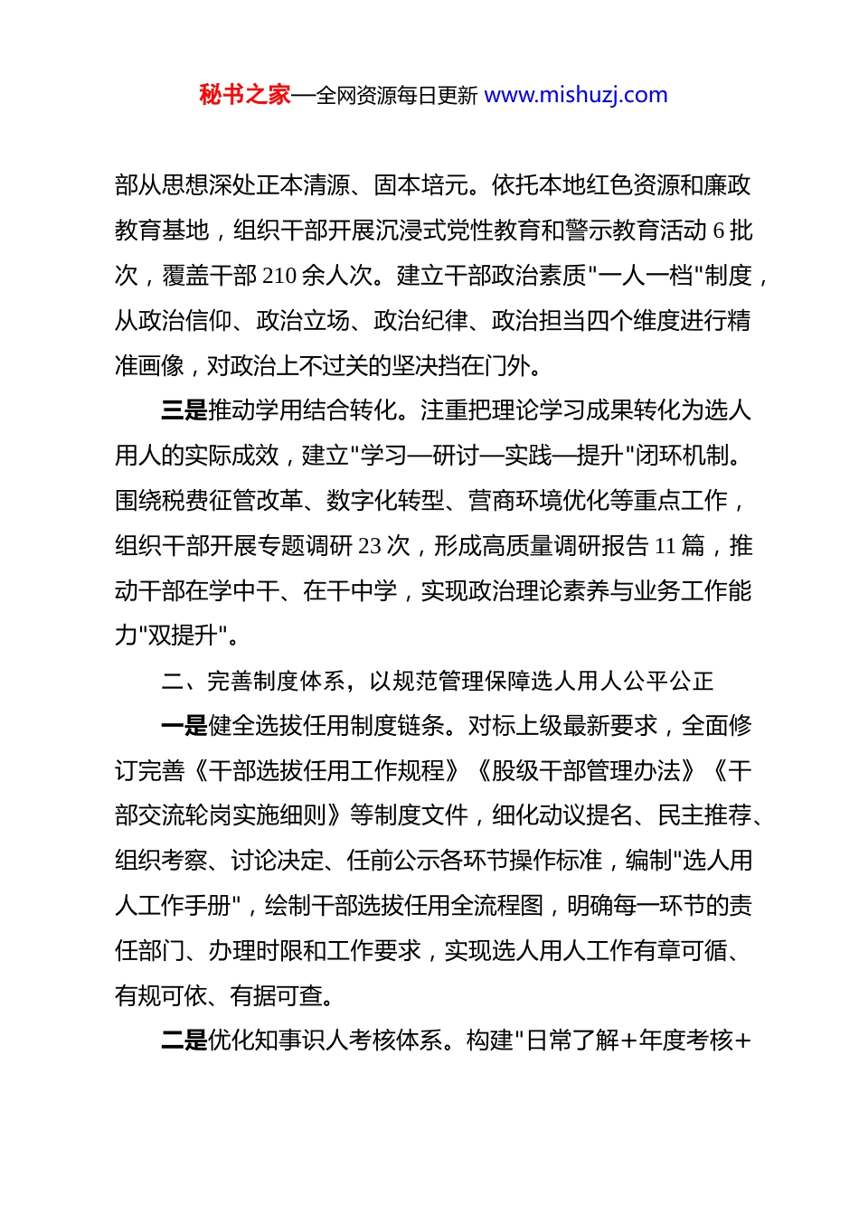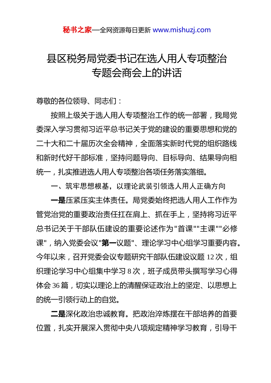 秘书之家—全网资源每日更新 www.mishuzj.com县区税务局党委书记在选人用人专项整治专题会商会上的讲话 尊敬的各位领导、同志们:按照上级关于选人用人专项整治工作的统一部署,我局党委深入学习贯彻习近平总书记关于党的建设的重要思想和党的二十大和二十届历次全会精神,全面落实新时代党的组织路线和新时代好干部标准,坚持问题导向、目标导向、结果导向相统一,扎实推进选人用人专项整治各项任务落实落细。一、筑牢思想根基,以理论武装引领选人用人正确方向一是压紧压实主体责任。局党委始终把选人用人工作作为管党治党的重要政治责任扛在肩上、抓在手上,坚持将习近平总书记关于干部队伍建设的重要论述作为"首课""主课""必修课",纳入党委会议"第一议题"、理论学习中心组学习重要内容。今年以来,召开党委会议专题研究干部队伍建设议题 12 次,组织理论学习中心组集中学习 8 次,班子成员带头撰写学习心得体会 36 篇,切实以理论上的清醒保证政治上的坚定、以思想上的统一引领行动上的自觉。二是深化政治忠诚教育。把政治淬炼摆在干部培养的首要位置,扎实开展深入贯彻中央八项规定精神学习教育,引导干秘书之家—全网资源每日更新 www.mishuzj.com部从思想深处正本清源、固本培元。依托本地红色资源和廉政教育基地,组织干部开展沉浸式党性教育和警示教育活动 6 批次,覆盖干部 210 余人次。建立干部政治素质"一人一档"制度,从政治信仰、政治立场、政治纪律、政治担当四个维度进行精准画像,对政治上不过关的坚决挡在门外。三是推动学用结合转化。注重把理论学习成果转化为选人用人的实际成效,建立"学习—研讨—实践—提升"闭环机制。围绕税费征管改革、数字化转型、营商环境优化等重点工作,组织干部开展专题调研 23 次,形成高质量调研报告 11 篇,推动干部在学中干、在干中学,实现政治理论素养与业务工作能力"双提升"。二、完善制度体系,以规范管理保障选人用人公平公正一是健全选拔任用制度链条。对标上级最新要求,全面修订完善《干部选拔任用工作规程》《股级干部管理办法》《干部交流轮岗实施细则》等制度文件,细化动议提名、民主推荐、组织考察、讨论决定、任前公示各环节操作标准,编制"选人用人工作手册",绘制干部选拔任用全流程图,明确每一环节的责任部门、办理时限和工作要求,实现选人用人工作有章可循、有规可依、有据可查。二是优化知事识人考核体系。构建"日常了解+年度考核+秘书之家—全网资源每日更新 www.mishuzj.com专项考察+任期评价"四位一体考核格局,综合运用谈话调研、民主测评、实绩分析、综合研判等多种方式,多角度、全方位掌握干部真实表现。推行干部考察"下沉式"走访,深入税收征管一线、办税服务窗口、税费风险应对现场,近距离观察干部工作状态和精神面貌。引入服务对象评价机制,将纳税人缴费人满意度作为干部考核的重要参考依据。三是强化选人用人全程纪实。严格落实"凡提四必"要求,建立干部选拔任用工作全程纪实台账,对动议提名、推荐考察、讨论决定、任职公示等各环节实行痕迹化管理、档案化保存。规范会议记录和表决程序,确保集体讨论、民主决策过程完整可追溯。主动对接纪检监察、信访举报等部门进行联审联查,做到关口前移、防线前置。三、鲜明导向激励,以事业需要锻造过硬税务干部队伍一是突出政治过硬选干部。坚持把政治标准作为选人用人的"硬杠杠",在干部选拔任用中实行政治素质"首关"测评,从政治忠诚、政治定力、政治担当等维度设置量化指标,对政治素质测评不合格的实行"一票否决"。建立干部政治表现正负面清单,重点记录干部在重大原则问题上、急难险重任务中、关键时刻节点的政治立场和行为表现,坚决防止"两面人"混入干部队伍。秘书之家—全网资源每日更新 www.mishuzj.com二是着眼事业发展配干部。紧紧围绕税费主责主业和年度重点任务,将干部选拔与班子建设需求、岗位专业要求、事业发展需要紧密衔接。注重选拔在组织税费收入、落实减税降费政策、深化税收征管改革、优化税收营商环境等工作中实绩突出的优秀干部。加大专业化干部选配力度,对税源管理、税务稽查、风险管理、纳税服务等专...