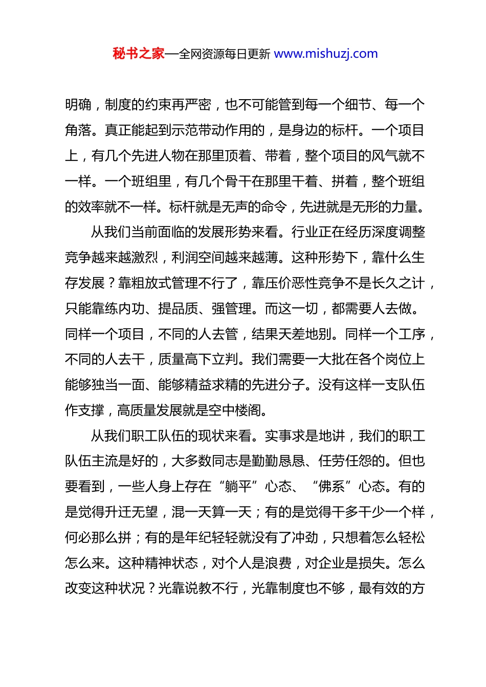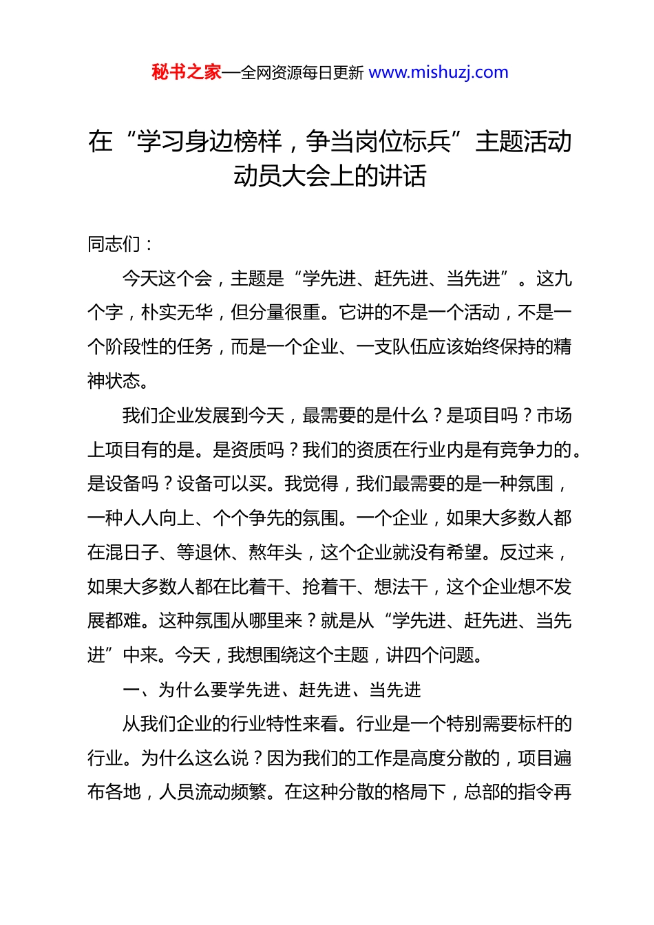 秘书之家—全网资源每日更新 www.mishuzj.com在“学习身边榜样,争当岗位标兵”主题活动动员大会上的讲话 同志们:今天这个会,主题是“学先进、赶先进、当先进”。这九个字,朴实无华,但分量很重。它讲的不是一个活动,不是一个阶段性的任务,而是一个企业、一支队伍应该始终保持的精神状态。我们企业发展到今天,最需要的是什么?是项目吗?市场上项目有的是。是资质吗?我们的资质在行业内是有竞争力的。是设备吗?设备可以买。我觉得,我们最需要的是一种氛围,一种人人向上、个个争先的氛围。一个企业,如果大多数人都在混日子、等退休、熬年头,这个企业就没有希望。反过来,如果大多数人都在比着干、抢着干、想法干,这个企业想不发展都难。这种氛围从哪里来?就是从“学先进、赶先进、当先进”中来。今天,我想围绕这个主题,讲四个问题。一、为什么要学先进、赶先进、当先进从我们企业的行业特性来看。行业是一个特别需要标杆的行业。为什么这么说?因为我们的工作是高度分散的,项目遍布各地,人员流动频繁。在这种分散的格局下,总部的指令再秘书之家—全网资源每日更新 www.mishuzj.com明确,制度的约束再严密,也不可能管到每一个细节、每一个角落。真正能起到示范带动作用的,是身边的标杆。一个项目上,有几个先进人物在那里顶着、带着,整个项目的风气就不一样。一个班组里,有几个骨干在那里干着、拼着,整个班组的效率就不一样。标杆就是无声的命令,先进就是无形的力量。从我们当前面临的发展形势来看。行业正在经历深度调整竞争越来越激烈,利润空间越来越薄。这种形势下,靠什么生存发展?靠粗放式管理不行了,靠压价恶性竞争不是长久之计,只能靠练内功、提品质、强管理。而这一切,都需要人去做。同样一个项目,不同的人去管,结果天差地别。同样一个工序,不同的人去干,质量高下立判。我们需要一大批在各个岗位上能够独当一面、能够精益求精的先进分子。没有这样一支队伍作支撑,高质量发展就是空中楼阁。从我们职工队伍的现状来看。实事求是地讲,我们的职工队伍主流是好的,大多数同志是勤勤恳恳、任劳任怨的。但也要看到,一些人身上存在“躺平”心态、“佛系”心态。有的是觉得升迁无望,混一天算一天;有的是觉得干多干少一个样,何必那么拼;有的是年纪轻轻就没有了冲劲,只想着怎么轻松怎么来。这种精神状态,对个人是浪费,对企业是损失。怎么改变这种状况?光靠说教不行,光靠制度也不够,最有效的方秘书之家—全网资源每日更新 www.mishuzj.com法就是树立榜样,让大家看到,干得好的人是什么样子,努力的人能得到什么。榜样的力量是无穷的,一个先进可以带动一大片。基于以上分析,我想明确一个判断:学先进、赶先进、当先进,不是可有可无的“选修课”,而是关乎企业生存发展的“必修课”。各级组织要把这项工作作为带队伍、正风气、促发展的重要抓手,常抓不懈、久久为功。二、学先进,学什么学先进,首先要搞清楚学什么。先进之所以成为先进,一定有他的过人之处。学先进不是学他的具体做法,因为每个人的岗位不同、条件不同,照搬照抄没有意义。要学的是他身上最本质、最核心的东西。第一,学他们的敬业精神。我观察过很多先进人物,他们有一个共同的特点,就是把工作当成事业来干,而不是当成差事来应付。同样的岗位,别人是按时上下班,他是早来晚走;别人是完成任务就行,他是追求做到最好;别人遇到困难绕着走,他是主动迎上去解决。这种敬业精神,不是谁要求的,是发自内心的。他觉得这件事就应该这么干,不这么干心里不踏实。学先进,首先要学这种把工作当成事业、把岗位当成责任的敬业态度。有了这种态度,再平凡的岗位也能干出不平凡的秘书之家—全网资源每日更新 www.mishuzj.com业绩。第二,学他们的专业追求。先进人物在业务上往往都是拔尖的。同样绑钢筋,他绑得又快又好;同样搞测量,他的数据精准无误;同样做方案,他的方案周到严密。这种专业上的优势不是天生的,是日积月累练出来的。别人休息的时候他在琢磨技术,别人应付差事的时候他在钻研业务,别人觉得差不多就行了他在追求精益求精。学先进,就要学这种对专业...