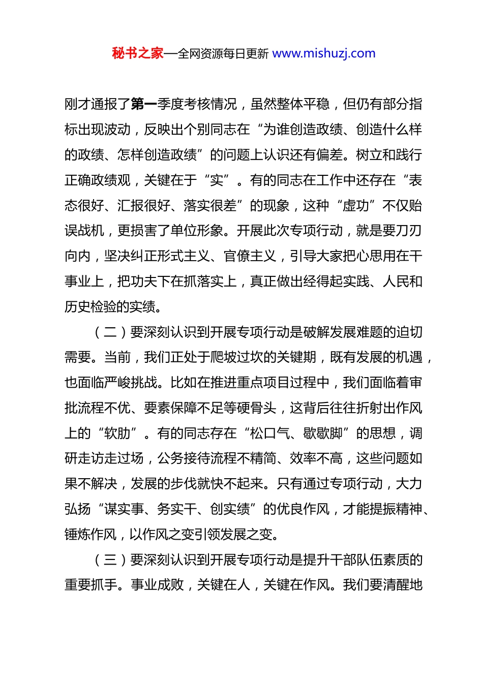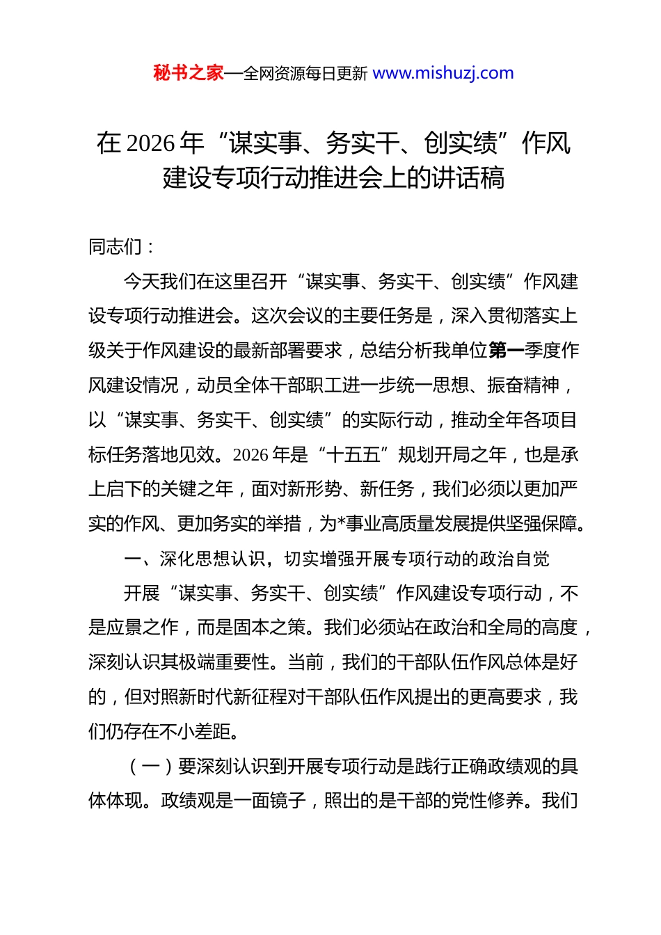 秘书之家—全网资源每日更新 www.mishuzj.com在 2026 年“谋实事、务实干、创实绩”作风建设专项行动推进会上的讲话稿 同志们:今天我们在这里召开“谋实事、务实干、创实绩”作风建设专项行动推进会。这次会议的主要任务是,深入贯彻落实上级关于作风建设的最新部署要求,总结分析我单位第一季度作风建设情况,动员全体干部职工进一步统一思想、振奋精神,以“谋实事、务实干、创实绩”的实际行动,推动全年各项目标任务落地见效。2026 年是“十五五”规划开局之年,也是承上启下的关键之年,面对新形势、新任务,我们必须以更加严实的作风、更加务实的举措,为*事业高质量发展提供坚强保障。一、深化思想认识,切实增强开展专项行动的政治自觉开展“谋实事、务实干、创实绩”作风建设专项行动,不是应景之作,而是固本之策。我们必须站在政治和全局的高度,深刻认识其极端重要性。当前,我们的干部队伍作风总体是好的,但对照新时代新征程对干部队伍作风提出的更高要求,我们仍存在不小差距。(一)要深刻认识到开展专项行动是践行正确政绩观的具体体现。政绩观是一面镜子,照出的是干部的党性修养。我们秘书之家—全网资源每日更新 www.mishuzj.com刚才通报了第一季度考核情况,虽然整体平稳,但仍有部分指标出现波动,反映出个别同志在“为谁创造政绩、创造什么样的政绩、怎样创造政绩”的问题上认识还有偏差。树立和践行正确政绩观,关键在于“实”。有的同志在工作中还存在“表态很好、汇报很好、落实很差”的现象,这种“虚功”不仅贻误战机,更损害了单位形象。开展此次专项行动,就是要刀刃向内,坚决纠正形式主义、官僚主义,引导大家把心思用在干事业上,把功夫下在抓落实上,真正做出经得起实践、人民和历史检验的实绩。(二)要深刻认识到开展专项行动是破解发展难题的迫切需要。当前,我们正处于爬坡过坎的关键期,既有发展的机遇,也面临严峻挑战。比如在推进重点项目过程中,我们面临着审批流程不优、要素保障不足等硬骨头,这背后往往折射出作风上的“软肋”。有的同志存在“松口气、歇歇脚”的思想,调研走访走过场,公务接待流程不精简、效率不高,这些问题如果不解决,发展的步伐就快不起来。只有通过专项行动,大力弘扬“谋实事、务实干、创实绩”的优良作风,才能提振精神、锤炼作风,以作风之变引领发展之变。(三)要深刻认识到开展专项行动是提升干部队伍素质的重要抓手。事业成败,关键在人,关键在作风。我们要清醒地秘书之家—全网资源每日更新 www.mishuzj.com看到,部分班子成员和干部职工在担当精神、攻坚克难勇气方面还有不足,面对矛盾不敢碰硬,面对困难不敢担当。有的纪律规矩意识松弛,自我要求不严,存在“雷声大雨点小”的假把式。此次专项行动,明确提出了“对党忠诚、担当尽责、一心为民、勤学善做、真抓实干、清正廉洁”的具体要求,这既是“说明书”,也是“军令状”。我们要通过这次行动,把队伍锻造得更加坚强有力,让“实干”成为*干部身上最鲜明的特征。二、聚焦重点任务,全面推动专项行动走深走实专项行动的核心在于行动,关键在于落实。我们要紧扣“谋实事、务实干、创实绩”这一主题,把作风建设与业务工作深度融合,坚持问题导向、目标导向、结果导向,确保专项行动不虚、不空、不偏。(一)要在“谋实事”上精准发力,坚决防止形式主义。谋事要实,就是要从实际出发谋划事业和工作,使点子、政策、方案符合实际情况、符合客观规律、符合科学精神。我们个别同志在项目谋划上,习惯于“拍脑袋决策”,方案做得漂亮,但落地性不强,这就是典型的“谋事不实”。今年,我们在谋划年度重点攻坚项目时,必须坚持“避虚就实”,深入基层一线开展调查研究,摸清底数、找准问题、提实对策。要围绕秘书之家—全网资源每日更新 www.mishuzj.com“十五五”规划开局,聚焦高质量发展、攻坚克难、民生服务等重点领域,认真梳理立项推进的重点工作。在谋划过程中,要大兴调查研究之风,坚决反对“坐在办公室里想对策”,要像*地区那样,以“时时放心不下”的责任感,将各项务实举措落实到基层一线,确保每一项决策都经得起推敲,每一...