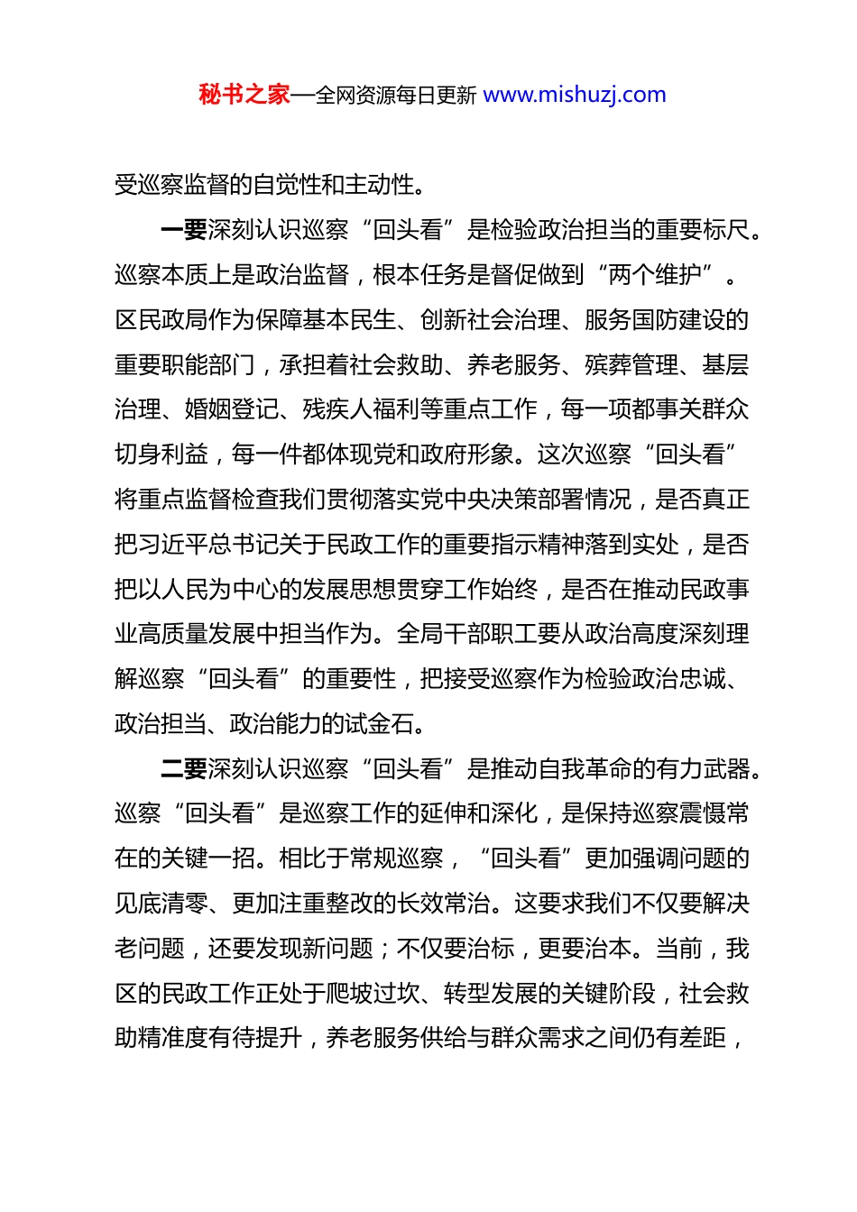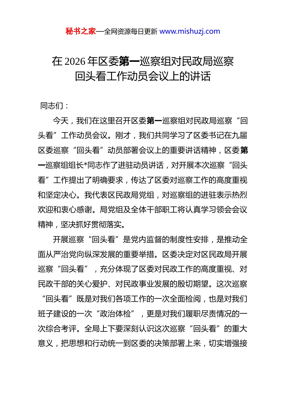 秘书之家—全网资源每日更新 www.mishuzj.com在 2026 年区委第一巡察组对民政局巡察回头看工作动员会议上的讲话 同志们:今天,我们在这里召开区委第一巡察组对民政局巡察“回头看”工作动员会议。刚才,我们共同学习了区委书记在九届区委巡察“回头看”动员部署会议上的重要讲话精神,区委第一巡察组组长*同志作了进驻动员讲话,对开展本次巡察“回头看”工作提出了明确要求,传达了区委对巡察工作的高度重视和坚定决心。我代表区民政局党组,对巡察组的进驻表示热烈欢迎和衷心感谢。局党组及全体干部职工将认真学习领会会议精神,坚决抓好贯彻落实。开展巡察“回头看”是党内监督的制度性安排,是推动全面从严治党向纵深发展的重要举措。区委决定对区民政局开展巡察“回头看”,充分体现了区委对民政工作的高度重视、对民政干部的关心爱护、对民政事业发展的殷切期望。这次巡察“回头看”既是对我们各项工作的一次全面检阅,也是对我们班子建设的一次“政治体检”,更是对我们履职尽责情况的一次综合考评。全局上下要深刻认识这次巡察“回头看”的重大意义,把思想和行动统一到区委的决策部署上来,切实增强接秘书之家—全网资源每日更新 www.mishuzj.com受巡察监督的自觉性和主动性。一要深刻认识巡察“回头看”是检验政治担当的重要标尺。巡察本质上是政治监督,根本任务是督促做到“两个维护”。区民政局作为保障基本民生、创新社会治理、服务国防建设的重要职能部门,承担着社会救助、养老服务、殡葬管理、基层治理、婚姻登记、残疾人福利等重点工作,每一项都事关群众切身利益,每一件都体现党和政府形象。这次巡察“回头看”将重点监督检查我们贯彻落实党中央决策部署情况,是否真正把习近平总书记关于民政工作的重要指示精神落到实处,是否把以人民为中心的发展思想贯穿工作始终,是否在推动民政事业高质量发展中担当作为。全局干部职工要从政治高度深刻理解巡察“回头看”的重要性,把接受巡察作为检验政治忠诚、政治担当、政治能力的试金石。二要深刻认识巡察“回头看”是推动自我革命的有力武器。巡察“回头看”是巡察工作的延伸和深化,是保持巡察震慑常在的关键一招。相比于常规巡察,“回头看”更加强调问题的见底清零、更加注重整改的长效常治。这要求我们不仅要解决老问题,还要发现新问题;不仅要治标,更要治本。当前,我区的民政工作正处于爬坡过坎、转型发展的关键阶段,社会救助精准度有待提升,养老服务供给与群众需求之间仍有差距,秘书之家—全网资源每日更新 www.mishuzj.com殡葬管理改革任务依然艰巨,基层治理能力还需加强。通过巡察“回头看”,我们可以更加清醒地看到差距、找到不足、明确方向,以刮骨疗毒的勇气和壮士断腕的决心推动自我净化、自我完善、自我革新、自我提高。三要深刻认识巡察“回头看”是促进事业发展的重要机遇。巡察监督是发现问题、形成震慑、推动改革、促进发展的有机整体。我们要把巡察“回头看”作为发现问题、解决问题的契机,作为改进作风、提升效能的契机,作为补齐短板、推动发展的契机。近年来,区民政局在区委、区政府的坚强领导下,坚持以习近平新时代中国特色社会主义思想为指导,认真贯彻落实党中央和省市区委各项决策部署,各项工作取得了一定成效。但我们清醒认识到,对照新时代民政工作的职责使命,对照人民群众的期盼要求,我们的工作还存在不小差距和不足。这次巡察“回头看”为我们提供了发现问题、剖析原因、整改提高的宝贵机会,我们要珍惜这次机会,主动接受监督,虚心听取意见,认真抓好整改,推动民政工作再上新台阶。刚才,巡察组强调了要深刻理解和把握“四个聚焦”,切实提升巡察的针对性、实效性。这“四个聚焦”为我们指明了接受监督的重点方向和关键环节。全局上下要认真学习领会,自觉对标对表,主动查摆问题。秘书之家—全网资源每日更新 www.mishuzj.com一是聚焦党中央决策部署在基层落实情况。要重点检查是否认真贯彻落实习近平总书记关于民政工作的重要指示批示精神,是否把党中央关于基本民生保障、基层社会治理、基本社会服务等决策部署落到实处,是否在推动巩固拓展脱贫攻坚成果...