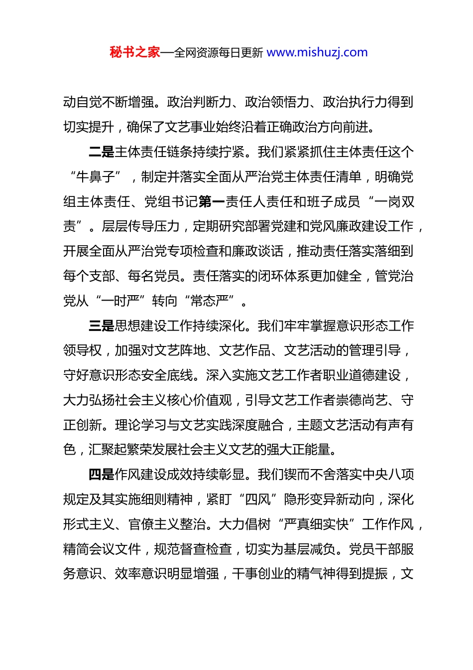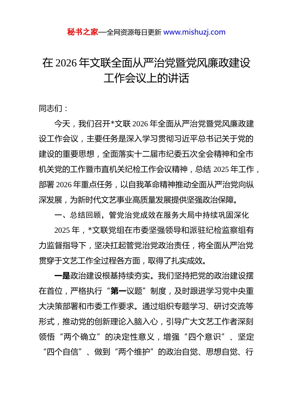 秘书之家—全网资源每日更新 www.mishuzj.com在 2026 年文联全面从严治党暨党风廉政建设工作会议上的讲话 同志们:今天,我们召开*文联 2026 年全面从严治党暨党风廉政建设工作会议,主要任务是深入学习贯彻习近平总书记关于党的建设的重要思想,全面落实十二届市纪委五次全会精神和全市机关党的工作暨市直机关纪检工作会议精神,总结 2025 年工作,部署 2026 年重点任务,以自我革命精神推动全面从严治党向纵深发展,为新时代文艺事业高质量发展提供坚强政治保障。一、总结回顾,管党治党成效在服务大局中持续巩固深化2025 年,*文联党组在市委坚强领导和派驻纪检监察组有力监督指导下,坚决扛起管党治党政治责任,将全面从严治党贯穿于文艺工作全过程各方面,取得了扎实成效。一是政治建设根基持续夯实。我们坚持把党的政治建设摆在首位,严格执行“第一议题”制度,及时跟进学习党中央重大决策部署和市委工作要求。通过组织专题学习、研讨交流等形式,推动党的创新理论入脑入心,引导广大文艺工作者深刻领悟“两个确立”的决定性意义,增强“四个意识”、坚定“四个自信”、做到“两个维护”的政治自觉、思想自觉、行秘书之家—全网资源每日更新 www.mishuzj.com动自觉不断增强。政治判断力、政治领悟力、政治执行力得到切实提升,确保了文艺事业始终沿着正确政治方向前进。二是主体责任链条持续拧紧。我们紧紧抓住主体责任这个“牛鼻子”,制定并落实全面从严治党主体责任清单,明确党组主体责任、党组书记第一责任人责任和班子成员“一岗双责”。层层传导压力,定期研究部署党建和党风廉政建设工作,开展全面从严治党专项检查和廉政谈话,推动责任落实落细到每个支部、每名党员。责任落实的闭环体系更加健全,管党治党从“一时严”转向“常态严”。三是思想建设工作持续深化。我们牢牢掌握意识形态工作领导权,加强对文艺阵地、文艺作品、文艺活动的管理引导,守好意识形态安全底线。深入实施文艺工作者职业道德建设,大力弘扬社会主义核心价值观,引导文艺工作者崇德尚艺、守正创新。理论学习与文艺实践深度融合,主题文艺活动有声有色,汇聚起繁荣发展社会主义文艺的强大正能量。四是作风建设成效持续彰显。我们锲而不舍落实中央八项规定及其实施细则精神,紧盯“四风”隐形变异新动向,深化形式主义、官僚主义整治。大力倡树“严真细实快”工作作风,精简会议文件,规范督查检查,切实为基层减负。党员干部服务意识、效率意识明显增强,干事创业的精气神得到提振,文秘书之家—全网资源每日更新 www.mishuzj.com联机关和文艺界作风持续向好。五是廉洁文化建设持续推进。我们坚持把廉洁文化建设作为一体推进“三不腐”的基础性工程,深挖*历史文化中的廉洁因子,创作推出了一批主题鲜明的廉洁文化文艺作品。通过组织观看警示教育片、开展廉政谈话、建设廉洁文化阵地等多种方式,营造了崇廉拒腐、激浊扬清的良好氛围,廉洁自律的思想堤坝不断加固。六是监督执纪问责持续从严。我们全力支持派驻纪检监察组履行监督职责,自觉接受监督。用好监督执纪“四种形态”,特别是第一种形态,抓早抓小、防微杜渐。加强对重点领域、关键环节的廉政风险防控,对苗头性、倾向性问题及时提醒纠正。监督的“探头”作用有效发挥,纪律的刚性约束持续强化,政治生态更加风清气正。二、认清形势,增强推动全面从严治党的责任感和紧迫感在肯定成绩的同时,我们也必须清醒认识到,全面从严治党永远在路上,党的自我革命永远在路上。对照党中央和市委的要求,对照文艺事业高质量发展的需要,我们的工作还存在一些不足和短板。一是理论武装与实际结合的深度有待加强,运用党的创新理论指导解决文艺发展难题的能力还需提升。二是党建与业务融合还不够紧密,有时存在“两张皮”现象,党秘书之家—全网资源每日更新 www.mishuzj.com建引领业务发展的机制有待进一步创新完善。三是个别党员干部的纪律规矩意识还不够牢固,作风建设仍需常抓不懈。四是廉政风险防控体系需要进一步织密织牢,特别是在文艺评奖、项目扶持、资金使用、活动组织等方面,制度执行和监督的力度要持续加大。五是廉...