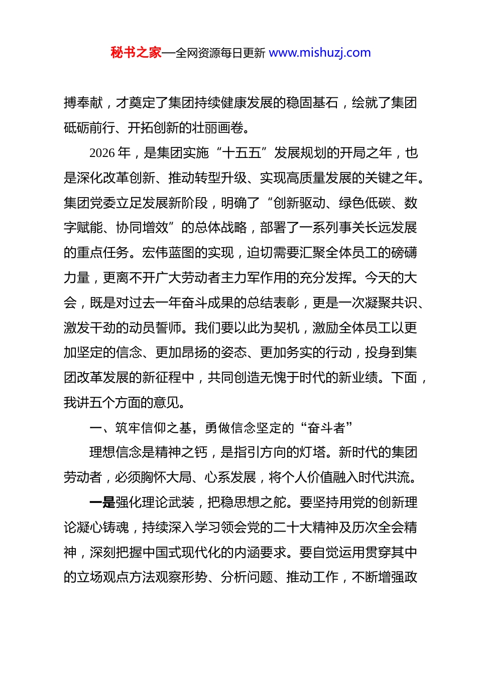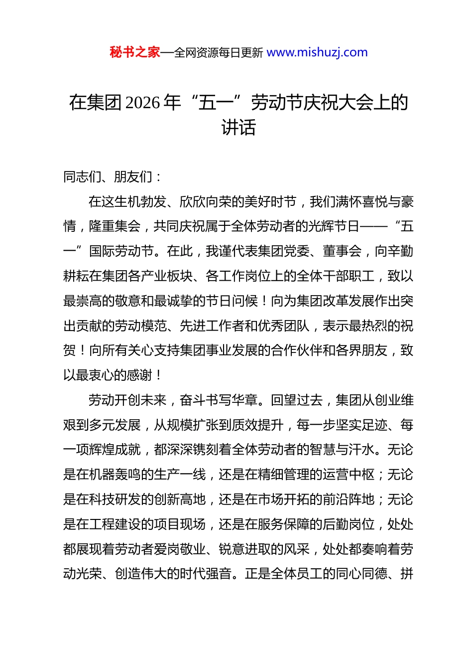 秘书之家—全网资源每日更新 www.mishuzj.com在集团 2026 年“五一”劳动节庆祝大会上的讲话 同志们、朋友们:在这生机勃发、欣欣向荣的美好时节,我们满怀喜悦与豪情,隆重集会,共同庆祝属于全体劳动者的光辉节日——“五一”国际劳动节。在此,我谨代表集团党委、董事会,向辛勤耕耘在集团各产业板块、各工作岗位上的全体干部职工,致以最崇高的敬意和最诚挚的节日问候!向为集团改革发展作出突出贡献的劳动模范、先进工作者和优秀团队,表示最热烈的祝贺!向所有关心支持集团事业发展的合作伙伴和各界朋友,致以最衷心的感谢!劳动开创未来,奋斗书写华章。回望过去,集团从创业维艰到多元发展,从规模扩张到质效提升,每一步坚实足迹、每一项辉煌成就,都深深镌刻着全体劳动者的智慧与汗水。无论是在机器轰鸣的生产一线,还是在精细管理的运营中枢;无论是在科技研发的创新高地,还是在市场开拓的前沿阵地;无论是在工程建设的项目现场,还是在服务保障的后勤岗位,处处都展现着劳动者爱岗敬业、锐意进取的风采,处处都奏响着劳动光荣、创造伟大的时代强音。正是全体员工的同心同德、拼秘书之家—全网资源每日更新 www.mishuzj.com搏奉献,才奠定了集团持续健康发展的稳固基石,绘就了集团砥砺前行、开拓创新的壮丽画卷。2026 年,是集团实施“十五五”发展规划的开局之年,也是深化改革创新、推动转型升级、实现高质量发展的关键之年。集团党委立足发展新阶段,明确了“创新驱动、绿色低碳、数字赋能、协同增效”的总体战略,部署了一系列事关长远发展的重点任务。宏伟蓝图的实现,迫切需要汇聚全体员工的磅礴力量,更离不开广大劳动者主力军作用的充分发挥。今天的大会,既是对过去一年奋斗成果的总结表彰,更是一次凝聚共识、激发干劲的动员誓师。我们要以此为契机,激励全体员工以更加坚定的信念、更加昂扬的姿态、更加务实的行动,投身到集团改革发展的新征程中,共同创造无愧于时代的新业绩。下面,我讲五个方面的意见。一、筑牢信仰之基,勇做信念坚定的“奋斗者”理想信念是精神之钙,是指引方向的灯塔。新时代的集团劳动者,必须胸怀大局、心系发展,将个人价值融入时代洪流。一是强化理论武装,把稳思想之舵。要坚持用党的创新理论凝心铸魂,持续深入学习领会党的二十大精神及历次全会精神,深刻把握中国式现代化的内涵要求。要自觉运用贯穿其中的立场观点方法观察形势、分析问题、推动工作,不断增强政秘书之家—全网资源每日更新 www.mishuzj.com治判断力、政治领悟力、政治执行力。要将学习成果转化为对集团发展战略的深刻认同和自觉践行,确保个人奋斗与集团前进方向同频共振。二是践行核心价值,涵养精神品格。要积极培育和践行社会主义核心价值观,使之成为日常行为的准则和职业操守的标尺。要在工作中恪守诚信、精益求精,在生活中友善互助、弘扬美德。要主动参与集团精神文明创建活动,争当爱岗敬业的模范、诚实守信的典范、团结协作的表率,以先进个体的言行感染带动团队整体,共同营造积极向上、和谐奋进的企业文化氛围。三是胸怀“国之大者”,服务发展大局。要深刻认识集团在服务国家战略、推动地方经济、保障民生需求中的责任担当。要将本职工作放到集团全局乃至国家发展大局中去思考和定位,增强工作的方向感和使命感。要自觉维护集团和谐稳定,理性看待发展中的困难和挑战,积极建言献策,传播正能量,为集团行稳致远营造良好的内部环境。二、投身发展实践,勇做攻坚克难的“实干家”发展是硬道理,实干是硬功夫。推动集团战略落地,需要全体员工立足岗位、真抓实干,将规划蓝图变为生动现实。一是聚焦主业提质,做强发展引擎。各产业板块的干部职秘书之家—全网资源每日更新 www.mishuzj.com工要紧紧围绕主业核心竞争力提升,在降本增效、技术升级、市场开拓上狠下功夫。生产一线员工要发扬工匠精神,精研技艺,保障质量,提升效率;技术研发人员要瞄准行业前沿,勇于攻关,加快成果转化;市场营销人员要敏锐洞察需求,创新模式,开拓疆土。要通过全链条的协同努力,不断巩固和扩大集团的市场竞争优势。二是聚力创新突破,培育增长动能。要...