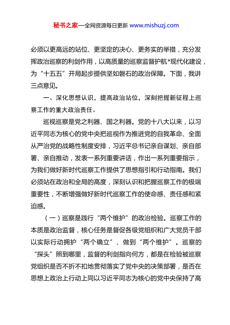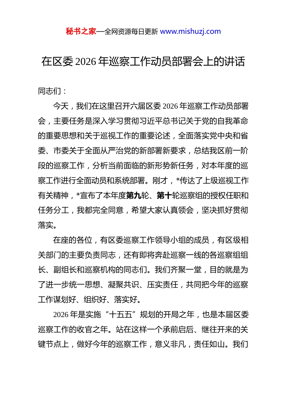 秘书之家—全网资源每日更新 www.mishuzj.com在区委 2026 年巡察工作动员部署会上的讲话 同志们:今天,我们在这里召开六届区委 2026 年巡察工作动员部署会,主要任务是深入学习贯彻习近平总书记关于党的自我革命的重要思想和关于巡视工作的重要论述,全面落实党中央和省委、市委关于全面从严治党的新部署新要求,总结我区前一阶段的巡察工作,分析当前面临的新形势新任务,对本年度的巡察工作进行全面动员和系统部署。刚才,*传达了上级巡视工作有关精神,*宣布了本年度第九轮、第十轮巡察组的授权任职和任务分工,我都完全同意,希望大家认真领会,坚决抓好贯彻落实。在座的各位,有区委巡察工作领导小组的成员,有区级相关部门的主要负责同志,还有即将奔赴巡察一线的各巡察组组长、副组长和巡察机构的同志们。我们齐聚一堂,目的就是为了进一步统一思想、凝聚共识、压实责任,共同把今年的巡察工作谋划好、组织好、落实好。2026 年是实施“十五五”规划的开局之年,也是本届区委巡察工作的收官之年。站在这样一个承前启后、继往开来的关键节点上,做好今年的巡察工作,意义非凡,责任如山。我们秘书之家—全网资源每日更新 www.mishuzj.com必须以更高远的站位、更坚定的决心、更务实的举措,充分发挥政治巡察的利剑作用,以高质量的巡察监督护航*现代化建设,为“十五五”开局起步提供坚如磐石的政治保障。下面,我讲三点意见。一、深化思想认识,提高政治站位,深刻把握新征程上巡察工作的重大政治责任。巡视巡察是党之利器、国之利器。党的十八大以来,以习近平同志为核心的党中央把巡视作为推进党的自我革命、全面从严治党的战略性制度安排,习近平总书记亲自谋划、亲自部署、亲自推动,发表一系列重要讲话,作出一系列重要指示,为我们做好新时代巡察工作提供了思想指引和行动指南。我们必须站在政治和全局的高度,深刻认识和把握巡察工作的极端重要性,不断增强做好新时代巡察工作的使命感、责任感和紧迫感。(一)巡察是践行“两个维护”的政治检验。巡察工作的本质是政治监督,核心任务是督促各级党组织和广大党员干部以实际行动拥护“两个确立”、做到“两个维护”。巡察的“探头”照到哪里,监督的利剑指向何方,都是在检验被巡察党组织是否不折不扣地贯彻落实了党中央的决策部署,是否在思想上政治上行动上同以习近平同志为核心的党中央保持了高秘书之家—全网资源每日更新 www.mishuzj.com度一致。今年的巡察工作,无论是对区级部门的专项巡察,还是对整改落实情况的“回头看”,根本目的都是为了推动上级精神在*落地生根、开花结果。我们必须把巡察作为捍卫核心、维护权威的实际行动,通过精准有力的监督,确保全区上下政令畅通、步调一致。(二)巡察是护航*高质量发展的现实需要。当前,*区正处在爬坡过坎、转型升级的关键时期。去年,我区经济社会发展取得了可喜成绩,服务业增加值实现历史性突破,展现出强劲的发展韧性和潜力。但我们也要清醒地看到,前进道路上依然面临诸多风险挑战,发展不平衡不充分的问题依然存在,一些制约高质量发展的堵点、痛点、难点亟待破解。比如,我们的营商环境还有没有提升空间?一些领域的执法乱象是否得到根本遏制?民生领域的突出问题是否得到有效解决?这些都需要通过巡察这把“利剑”去深入检视、精准发现、推动解决。巡察工作要自觉服务于全区发展大局,紧盯影响和制约高质量发展的突出矛盾,清除阻碍改革发展的“拦路虎”“绊脚石”,为*的现代化建设保驾护航。(三)巡察是深化党的自我革命的关键抓手。习近平总书记深刻指出,我们党作为世界上最大的马克思主义执政党,如何成功跳出治乱兴衰历史周期率、确保党永远不变质、不变色、秘书之家—全网资源每日更新 www.mishuzj.com不变味,是一道摆在全党面前的重大课题。党的自我革命,就是我们党给出的第二个答案。巡察作为党内监督和群众监督相结合的重要方式,是发现问题、形成震慑、推动解决问题的有效途径,是深入推进党的自我革命的战略性举措。我们要深刻认识到,管党治党一刻也不能放松,反腐败斗争形势依然严峻复杂。通过巡察,就是要及时发现和纠正政...