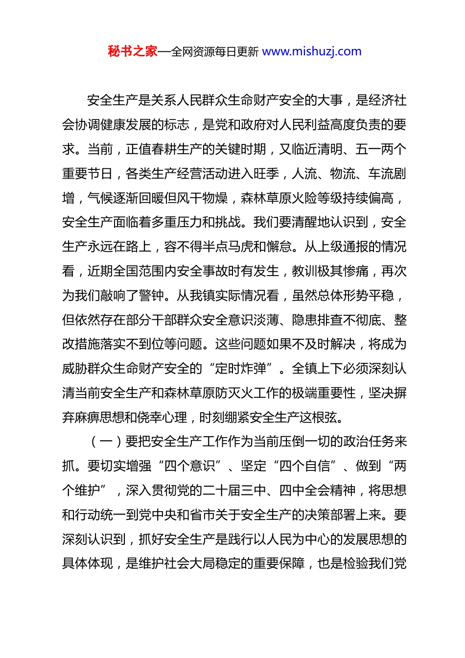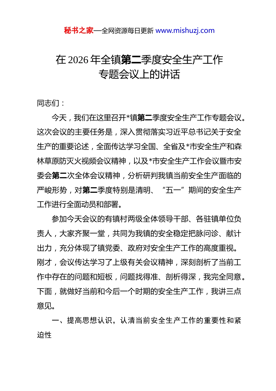 秘书之家—全网资源每日更新 www.mishuzj.com在 2026 年全镇第二季度安全生产工作专题会议上的讲话 同志们:今天,我们在这里召开*镇第二季度安全生产工作专题会议。这次会议的主要任务是,深入贯彻落实习近平总书记关于安全生产的重要论述,全面传达学习全国、全省及*市安全生产和森林草原防灭火视频会议精神,以及*市安全生产工作会议暨市安委会第二次全体会议精神,分析研判我镇当前安全生产面临的严峻形势,对第二季度特别是清明、“五一”期间的安全生产工作进行全面动员和部署。参加今天会议的有镇村两级全体领导干部、各驻镇单位负责人,大家齐聚一堂,共同为我镇的安全稳定把脉问诊、献计出力,充分体现了镇党委、政府对安全生产工作的高度重视。刚才,会议传达学习了上级有关会议精神,深刻剖析了当前工作中存在的问题和短板,问题找得准、剖析得深,我完全同意。下面,就做好当前和今后一个时期的安全生产工作,我讲三点意见。一、提高思想认识,认清当前安全生产工作的重要性和紧迫性秘书之家—全网资源每日更新 www.mishuzj.com安全生产是关系人民群众生命财产安全的大事,是经济社会协调健康发展的标志,是党和政府对人民利益高度负责的要求。当前,正值春耕生产的关键时期,又临近清明、五一两个重要节日,各类生产经营活动进入旺季,人流、物流、车流剧增,气候逐渐回暖但风干物燥,森林草原火险等级持续偏高,安全生产面临着多重压力和挑战。我们要清醒地认识到,安全生产永远在路上,容不得半点马虎和懈怠。从上级通报的情况看,近期全国范围内安全事故时有发生,教训极其惨痛,再次为我们敲响了警钟。从我镇实际情况看,虽然总体形势平稳,但依然存在部分干部群众安全意识淡薄、隐患排查不彻底、整改措施落实不到位等问题。这些问题如果不及时解决,将成为威胁群众生命财产安全的“定时炸弹”。全镇上下必须深刻认清当前安全生产和森林草原防灭火工作的极端重要性,坚决摒弃麻痹思想和侥幸心理,时刻绷紧安全生产这根弦。(一)要把安全生产工作作为当前压倒一切的政治任务来抓。要切实增强“四个意识”、坚定“四个自信”、做到“两个维护”,深入贯彻党的二十届三中、四中全会精神,将思想和行动统一到党中央和省市关于安全生产的决策部署上来。要深刻认识到,抓好安全生产是践行以人民为中心的发展思想的具体体现,是维护社会大局稳定的重要保障,也是检验我们党秘书之家—全网资源每日更新 www.mishuzj.com员干部党性和作风的试金石。各村、各单位要迅速行动起来,把安全生产工作摆在更加突出的位置,主要负责同志要亲自抓、负总责,分管负责同志要具体抓、抓落实,确保思想认识到位、组织领导到位、工作措施到位。(二)要把守牢安全底线作为不可逾越的红线来维护。我们要坚决守牢清明、五一节前安全红线,坚决守住不发生重特大火灾、不出现人员伤亡的底线。这是一条不可逾越的红线,也是我们必须承担的政治责任。要牢固树立“隐患就是事故”的理念,对任何细微的隐患都要高度重视,采取果断措施予以消除。要坚决克服“差不多”“大概齐”的糊弄思想,坚决杜绝形式主义、官僚主义,以对党和人民高度负责的态度,把安全生产各项工作抓实抓细抓出成效。对于因工作不力、失职渎职导致发生安全事故的,镇党委将依法依规严肃追究相关责任人的责任,绝不姑息迁就。(三)要把增强忧患意识作为推动工作的思想基础。面对当前复杂的安全生产形势,我们必须始终保持清醒头脑,做到居安思危、未雨绸缪。要充分估计可能遇到的困难和挑战,提前做好应对准备。要加强对安全生产形势的分析研判,及时发现和解决苗头性、倾向性问题,防患于未然。要广泛开展警示教育,用身边的事故案例教育广大群众,增强全民安全意识和秘书之家—全网资源每日更新 www.mishuzj.com自救互救能力,营造全社会关注安全、参与安全的良好氛围。二、抓住关键环节,推动各安全领域防控措施落到实处安全生产是一项复杂的系统工程,涉及面广、环节多、任务重。我们必须坚持问题导向,紧盯重点领域、重点时段、重点人群,全方位落实防控措施,精准开展重点领域整治,加大宣传引导力度,做好应...