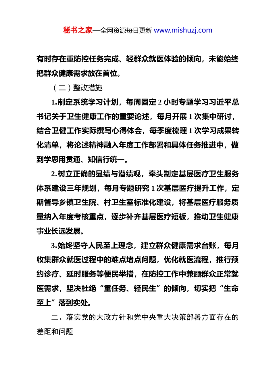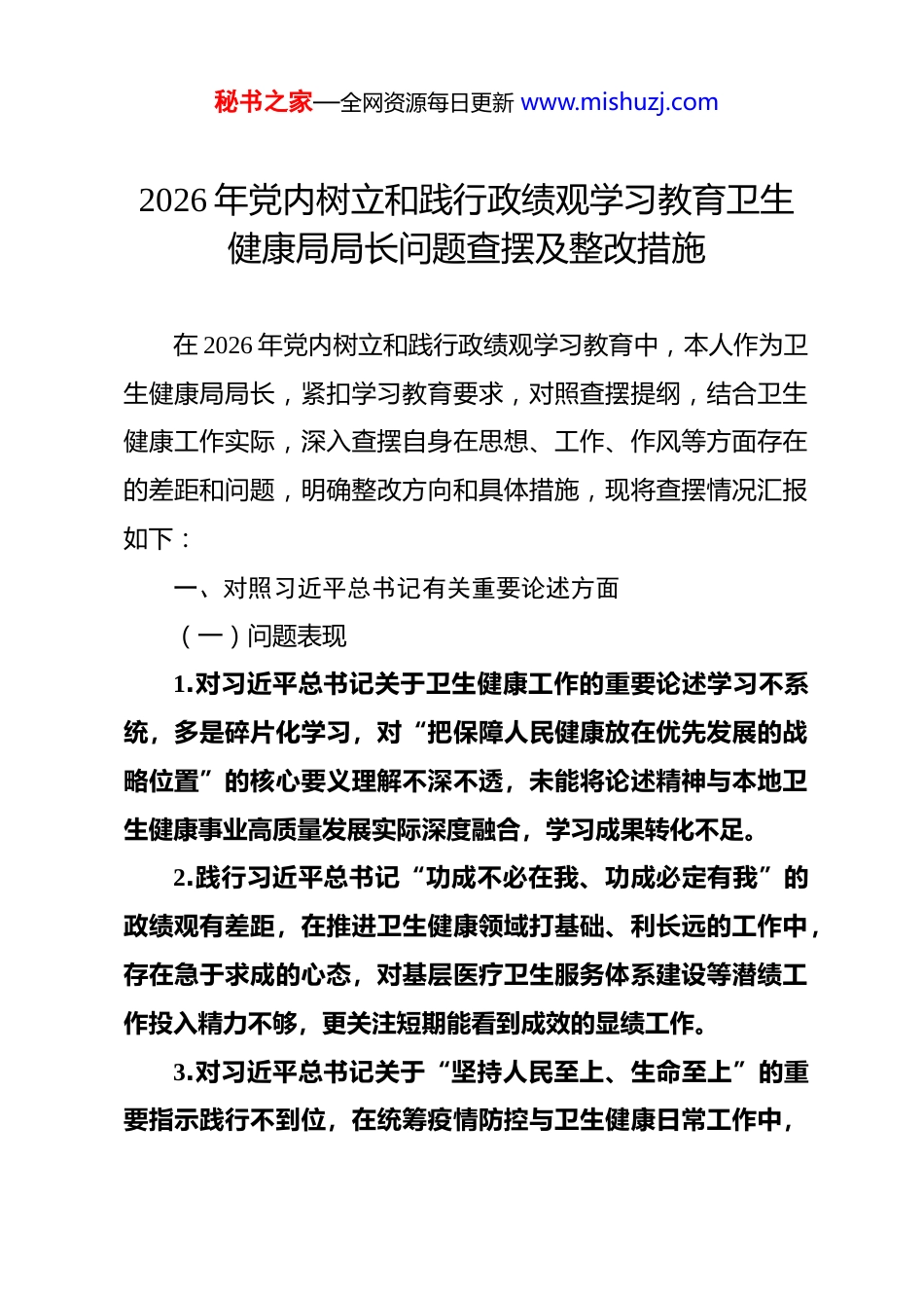 秘书之家—全网资源每日更新 www.mishuzj.com2026 年党内树立和践行政绩观学习教育卫生健康局局长问题查摆及整改措施 在 2026 年党内树立和践行政绩观学习教育中,本人作为卫生健康局局长,紧扣学习教育要求,对照查摆提纲,结合卫生健康工作实际,深入查摆自身在思想、工作、作风等方面存在的差距和问题,明确整改方向和具体措施,现将查摆情况汇报如下:一、对照习近平总书记有关重要论述方面(一)问题表现1.对习近平总书记关于卫生健康工作的重要论述学习不系统,多是碎片化学习,对“把保障人民健康放在优先发展的战略位置”的核心要义理解不深不透,未能将论述精神与本地卫生健康事业高质量发展实际深度融合,学习成果转化不足。2.践行习近平总书记“功成不必在我、功成必定有我”的政绩观有差距,在推进卫生健康领域打基础、利长远的工作中,存在急于求成的心态,对基层医疗卫生服务体系建设等潜绩工作投入精力不够,更关注短期能看到成效的显绩工作。3.对习近平总书记关于“坚持人民至上、生命至上”的重要指示践行不到位,在统筹疫情防控与卫生健康日常工作中,秘书之家—全网资源每日更新 www.mishuzj.com有时存在重防控任务完成、轻群众就医体验的倾向,未能始终把群众健康需求放在首位。(二)整改措施1.制定系统学习计划,每周固定 2 小时专题学习习近平总书记关于卫生健康工作的重要论述,每月开展 1 次集中研讨,结合卫健工作实际撰写心得体会,每季度梳理 1 次学习成果转化清单,将论述精神融入年度工作部署和具体任务推进中,做到学思用贯通、知信行统一。2.树立正确的显绩与潜绩观,牵头制定基层医疗卫生服务体系建设三年规划,每月专题研究 1 次基层医疗提升工作,定期督导乡镇卫生院、村卫生室标准化建设,将基层医疗服务质量纳入年度考核重点,逐步补齐基层医疗短板,推动卫生健康事业长远发展。3.始终坚守人民至上理念,建立群众健康需求台账,每月收集群众就医过程中的难点堵点问题,优化就医流程,推行预约诊疗、延时服务等便民举措,在防控工作中兼顾群众正常就医需求,坚决杜绝“重任务、轻民生”的倾向,切实把“生命至上”落到实处。二、落实党的大政方针和党中央重大决策部署方面存在的差距和问题秘书之家—全网资源每日更新 www.mishuzj.com(一)问题表现1.落实党中央关于深化医药卫生体制改革的决策部署不够有力,推进分级诊疗制度建设进度缓慢,县级医院与基层医疗机构的分工协作机制不健全,群众“看病难、看病远”问题未能得到有效缓解。2.对党中央关于公共卫生体系建设的部署落实不到位,公共卫生应急处置能力建设存在短板,应急物资储备不足、调配不顺畅,基层公共卫生服务人员专业能力薄弱,应对突发公共卫生事件的准备不够充分。3.落实健康中国建设战略部署存在偏差,对慢性病防治、健康促进等工作重视不够,健康科普宣传形式单一、覆盖面不广,群众健康素养提升缓慢,未能有效形成“人人关注健康、人人参与健康”的良好氛围。(二)整改措施1.加大医改推进力度,牵头制定分级诊疗实施方案,明确县级医院与基层医疗机构的职责分工,建立双向转诊、远程会诊机制,每月督导医改任务落实情况,每季度通报进展,年底完成分级诊疗试点建设,切实提升医疗资源利用效率,缓解群众就医难题。2.强化公共卫生体系建设,争取财政支持,充实应急物资秘书之家—全网资源每日更新 www.mishuzj.com储备,建立应急物资动态调配机制,每半年开展 1 次应急演练;开展基层公共卫生人员培训,每月组织 1 次业务培训,提升专业处置能力,筑牢公共卫生安全防线。3.推进健康中国建设落地,制定年度健康科普工作计划,创新宣传形式,通过新媒体、乡村宣讲、社区义诊等方式,扩大健康科普覆盖面;建立慢性病防治长效机制,开展重点人群健康筛查,每季度开展 1 次健康促进活动,推动群众健康素养持续提升。三、落实习近平总书记重要讲话和重要指示批示精神方面存在的差距和问题(一)问题表现1.对习近平总书记关于“加强基层医疗卫生服务体系建设”的重要指示批示落实不力,基层医疗机构人才流失严重,医护人员配备不足,部分村卫生室存在“有...