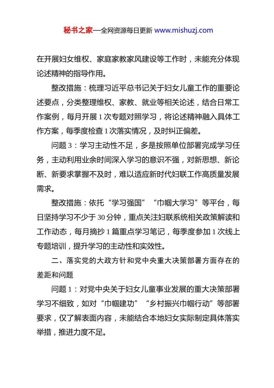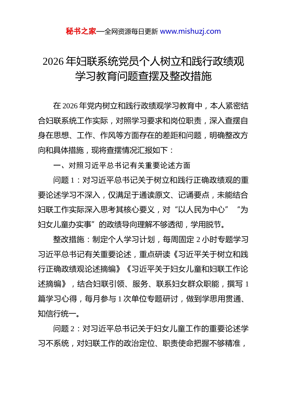 秘书之家—全网资源每日更新 www.mishuzj.com2026 年妇联系统党员个人树立和践行政绩观学习教育问题查摆及整改措施 在 2026 年党内树立和践行政绩观学习教育中,本人紧密结合妇联系统工作实际,对照学习要求和岗位职责,深入查摆自身在思想、工作、作风等方面存在的差距和问题,明确整改方向和具体措施,现将查摆情况汇报如下:一、对照习近平总书记有关重要论述方面问题 1:对习近平总书记关于树立和践行正确政绩观的重要论述学习不深入,仅满足于通读原文、记诵要点,未能结合妇联工作实际深入思考其核心要义,对“以人民为中心”“为妇女儿童办实事”的政绩导向理解不够透彻,学用脱节。整改措施:制定个人学习计划,每周固定 2 小时专题学习习近平总书记有关重要论述,重点研读《习近平关于树立和践行正确政绩观论述摘编》《习近平关于妇女儿童和妇联工作论述摘编》,结合妇联引领、服务、联系妇女群众职能,撰写 1篇学习心得,每月参与 1 次单位专题研讨,做到学思用贯通、知信行统一。问题 2:对习近平总书记关于妇女儿童工作的重要论述学习不系统,对妇联工作的政治定位、职责使命把握不够精准,秘书之家—全网资源每日更新 www.mishuzj.com在开展妇女维权、家庭家教家风建设等工作时,未能充分体现论述精神的指导作用。整改措施:梳理习近平总书记关于妇女儿童工作的重要论述要点,分类整理维权、家教、就业等相关论述,结合日常工作案例,每月开展 1 次专题对照学习,将论述精神融入具体工作方案,每季度检查 1 次落实情况,及时纠正偏差。问题 3:学习主动性不足,多是按照单位部署完成学习任务,主动利用业余时间深入学习的意识不强,对新思想、新论断、新要求掌握不及时,难以适应新时代妇联工作高质量发展需求。整改措施:依托“学习强国”“巾帼大学习”等平台,每日坚持学习不少于 30 分钟,重点关注妇联系统相关政策解读和工作动态,每月摘抄 1 篇重点学习笔记,每季度参加 1 次线上专题培训,提升学习的主动性和实效性。二、落实党的大政方针和党中央重大决策部署方面存在的差距和问题问题 1:对党中央关于妇女儿童事业发展的重大决策部署学习不细致,如对“巾帼建功”“乡村振兴巾帼行动”等部署要求,仅了解表面内容,未能结合本地妇女实际制定具体落实举措,推进力度不足。秘书之家—全网资源每日更新 www.mishuzj.com整改措施:系统学习党中央关于妇女儿童工作的重大决策部署,梳理分解任务清单,结合本地妇女就业、创业、维权等实际需求,制定季度落实计划,明确具体措施和完成时限,每月跟踪推进情况,确保部署落地见效。问题 2:落实党中央决策部署存在“重形式、轻实效”的倾向,如在开展相关主题活动时,过于注重活动流程和宣传报道,对活动实际效果、妇女群众的参与度和满意度关注不够,未能真正实现活动初衷。整改措施:在落实决策部署、开展活动前,深入调研妇女群众需求,制定针对性强、可落地的活动方案,活动结束后,通过问卷、座谈等方式收集妇女群众意见,及时总结经验、改进不足,将活动实效作为衡量工作的重要标准。问题 3:对党的大政方针宣传力度不足,尤其是面向基层妇女、农村妇女的宣传,形式单一、内容生硬,未能用通俗易懂的语言解读政策,导致部分妇女对党中央的惠民政策了解不全面、不深入。整改措施:创新宣传方式,结合妇联“巾帼宣讲队”工作采用案例讲解、文艺表演、短视频等妇女群众喜闻乐见的形式,每月开展 1 次基层政策宣讲,重点解读妇女维权、创业扶持、家庭教育等政策,确保政策宣传全覆盖、入人心。秘书之家—全网资源每日更新 www.mishuzj.com三、落实习近平总书记重要讲话和重要指示批示精神方面存在的差距和问题问题 1:对习近平总书记关于妇女儿童工作的重要讲话和重要指示批示精神,落实不够迅速,存在“等靠要”思想,接到相关要求后,未能第一时间研究部署,推进工作滞后。整改措施:建立重要讲话和重要指示批示精神落实台账,接到相关要求后,2 个工作日内研究制定落实方案,明确责任分工和完成时限,每周跟踪推进情况,确保各项指示批示精神落地生根、开花结果。问题 2:落...