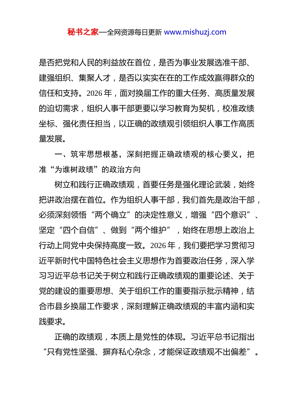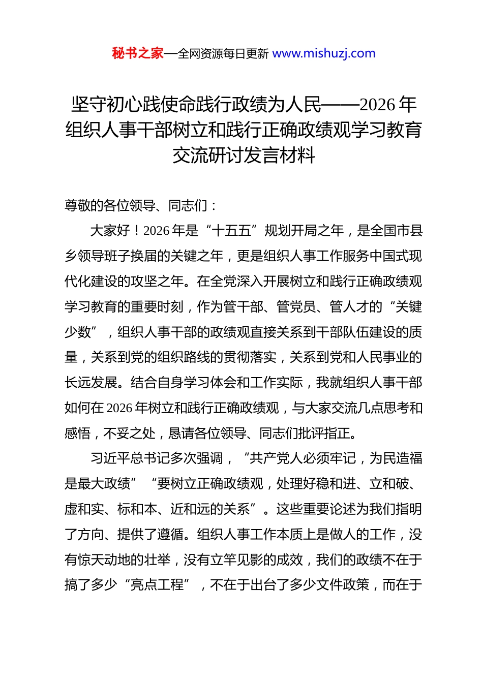 秘书之家—全网资源每日更新 www.mishuzj.com坚守初心践使命践行政绩为人民——2026 年组织人事干部树立和践行正确政绩观学习教育交流研讨发言材料 尊敬的各位领导、同志们:大家好!2026 年是“十五五”规划开局之年,是全国市县乡领导班子换届的关键之年,更是组织人事工作服务中国式现代化建设的攻坚之年。在全党深入开展树立和践行正确政绩观学习教育的重要时刻,作为管干部、管党员、管人才的“关键少数”,组织人事干部的政绩观直接关系到干部队伍建设的质量,关系到党的组织路线的贯彻落实,关系到党和人民事业的长远发展。结合自身学习体会和工作实际,我就组织人事干部如何在 2026 年树立和践行正确政绩观,与大家交流几点思考和感悟,不妥之处,恳请各位领导、同志们批评指正。习近平总书记多次强调,“共产党人必须牢记,为民造福是最大政绩”“要树立正确政绩观,处理好稳和进、立和破、虚和实、标和本、近和远的关系”。这些重要论述为我们指明了方向、提供了遵循。组织人事工作本质上是做人的工作,没有惊天动地的壮举,没有立竿见影的成效,我们的政绩不在于搞了多少“亮点工程”,不在于出台了多少文件政策,而在于秘书之家—全网资源每日更新 www.mishuzj.com是否把党和人民的利益放在首位,是否为事业发展选准干部、建强组织、集聚人才,是否以实实在在的工作成效赢得群众的信任和支持。2026 年,面对换届工作的重大任务、高质量发展的迫切需求,组织人事干部更要以学习教育为契机,校准政绩坐标、强化责任担当,以正确的政绩观引领组织人事工作高质量发展。一、筑牢思想根基,深刻把握正确政绩观的核心要义,把准“为谁树政绩”的政治方向树立和践行正确政绩观,首要任务是强化理论武装,始终把讲政治摆在首位。作为组织人事干部,我们首先是政治干部,必须深刻领悟“两个确立”的决定性意义,增强“四个意识”、坚定“四个自信”、做到“两个维护”,始终在思想上政治上行动上同党中央保持高度一致。2026 年,我们要把学习贯彻习近平新时代中国特色社会主义思想作为首要政治任务,深入学习习近平总书记关于树立和践行正确政绩观的重要论述、关于党的建设的重要思想、关于组织工作的重要指示批示精神,结合市县乡换届工作要求,深刻理解正确政绩观的丰富内涵和实践要求。正确的政绩观,本质上是党性的体现。习近平总书记指出“只有党性坚强、摒弃私心杂念,才能保证政绩观不出偏差”。秘书之家—全网资源每日更新 www.mishuzj.com组织人事干部手中的权力是党和人民赋予的,只能用来为党分忧、为民服务,绝不能用来谋取私利、装点门面。在 2026 年换届工作中,我们要始终坚持党管干部原则,严格落实新时代好干部标准,坚持德才兼备、以德为先、五湖四海、任人唯贤,严把人选政治关、品行关、能力关、作风关、廉洁关,坚决杜绝“带病提拔”“带病上岗”,确保选出的干部政治过硬、敢于担当、实绩突出、清正廉洁。要深刻认识到,换届工作的政绩,不是选出多少“明星干部”,而是选出能够担当“十五五”发展重任、能够为群众办实事的好班子、好干部,是营造风清气正的换届环境和政治生态。同时,要始终牢记“国之大者”,自觉把组织人事工作放到党和国家事业发展大局中去谋划、去推进。2026 年,我们要紧扣高质量发展主题,围绕市县乡换届、基层治理、人才引育等重点工作,找准组织人事工作的切入点和着力点,使组织工作始终与中心工作同频共振、同向发力。要坚决摒弃“就组织工作抓组织工作”的思维定式,不搞“花架子”、不做“表面文章”,以“时时放心不下”的责任感,把每一项工作都往实里做、往细里做、往深里做,让组织人事工作真正成为推动事业发展的坚强保障。二、聚焦主责主业,把正确政绩观融入履职实践,扛起秘书之家—全网资源每日更新 www.mishuzj.com“创什么政绩”的责任担当组织人事干部的政绩,体现在干部队伍建设、基层党组织建设、人才工作的每一个具体环节,体现在履职尽责的每一个实际行动中。2026 年,我们要以换届工作为契机,聚焦主责主业,把正确政绩观融入各项工作,以实干实绩践行初心使命。在干部工作上,要坚持“以实...