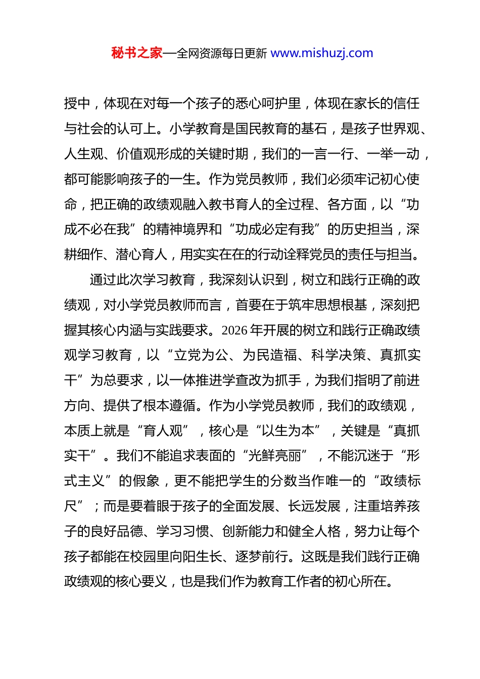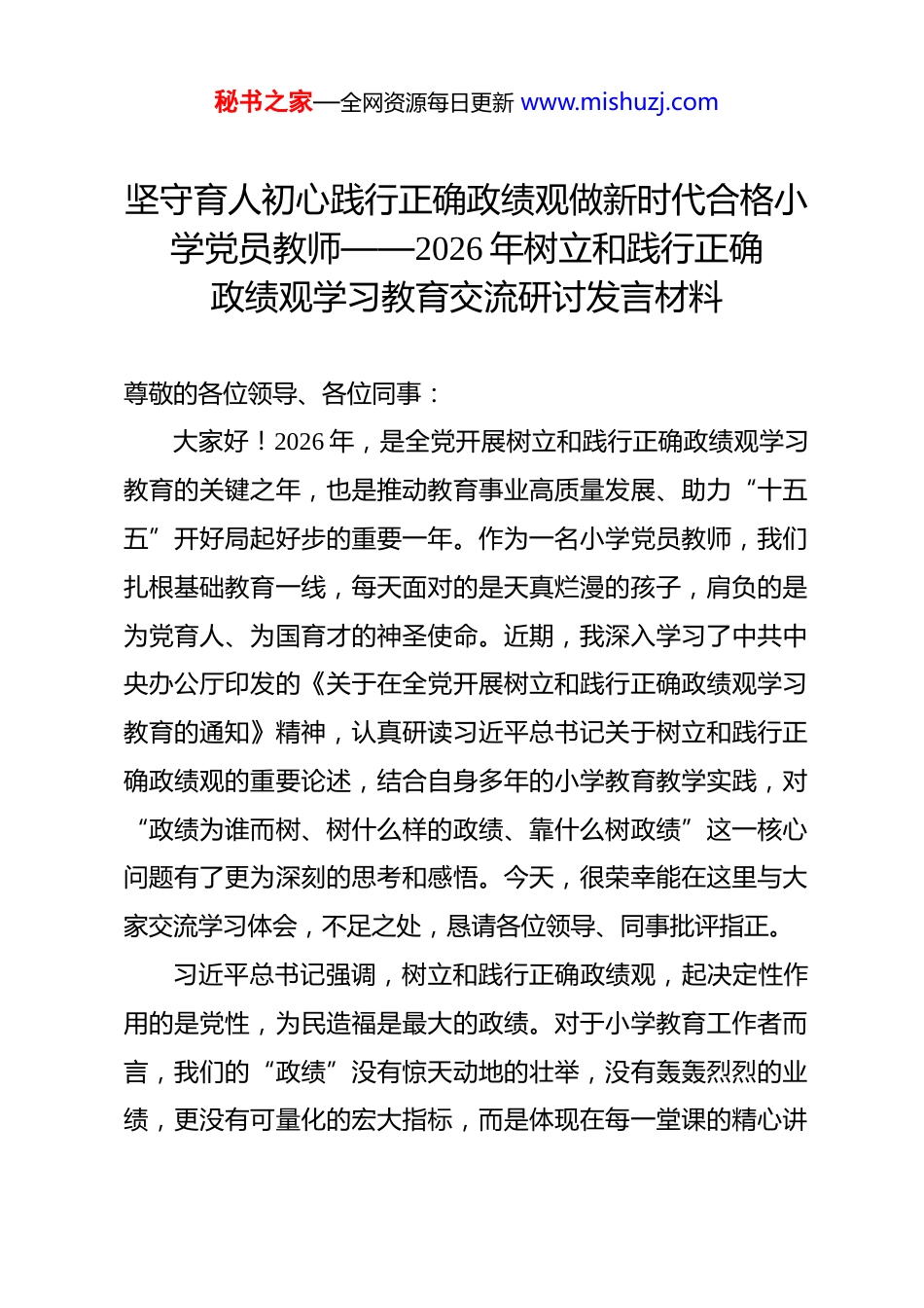 秘书之家—全网资源每日更新 www.mishuzj.com坚守育人初心践行正确政绩观做新时代合格小学党员教师——2026 年树立和践行正确政绩观学习教育交流研讨发言材料 尊敬的各位领导、各位同事:大家好!2026 年,是全党开展树立和践行正确政绩观学习教育的关键之年,也是推动教育事业高质量发展、助力“十五五”开好局起好步的重要一年。作为一名小学党员教师,我们扎根基础教育一线,每天面对的是天真烂漫的孩子,肩负的是为党育人、为国育才的神圣使命。近期,我深入学习了中共中央办公厅印发的《关于在全党开展树立和践行正确政绩观学习教育的通知》精神,认真研读习近平总书记关于树立和践行正确政绩观的重要论述,结合自身多年的小学教育教学实践,对“政绩为谁而树、树什么样的政绩、靠什么树政绩”这一核心问题有了更为深刻的思考和感悟。今天,很荣幸能在这里与大家交流学习体会,不足之处,恳请各位领导、同事批评指正。习近平总书记强调,树立和践行正确政绩观,起决定性作用的是党性,为民造福是最大的政绩。对于小学教育工作者而言,我们的“政绩”没有惊天动地的壮举,没有轰轰烈烈的业绩,更没有可量化的宏大指标,而是体现在每一堂课的精心讲秘书之家—全网资源每日更新 www.mishuzj.com授中,体现在对每一个孩子的悉心呵护里,体现在家长的信任与社会的认可上。小学教育是国民教育的基石,是孩子世界观、人生观、价值观形成的关键时期,我们的一言一行、一举一动,都可能影响孩子的一生。作为党员教师,我们必须牢记初心使命,把正确的政绩观融入教书育人的全过程、各方面,以“功成不必在我”的精神境界和“功成必定有我”的历史担当,深耕细作、潜心育人,用实实在在的行动诠释党员的责任与担当。通过此次学习教育,我深刻认识到,树立和践行正确的政绩观,对小学党员教师而言,首要在于筑牢思想根基,深刻把握其核心内涵与实践要求。2026 年开展的树立和践行正确政绩观学习教育,以“立党为公、为民造福、科学决策、真抓实干”为总要求,以一体推进学查改为抓手,为我们指明了前进方向、提供了根本遵循。作为小学党员教师,我们的政绩观,本质上就是“育人观”,核心是“以生为本”,关键是“真抓实干”。我们不能追求表面的“光鲜亮丽”,不能沉迷于“形式主义”的假象,更不能把学生的分数当作唯一的“政绩标尺”;而是要着眼于孩子的全面发展、长远发展,注重培养孩子的良好品德、学习习惯、创新能力和健全人格,努力让每个孩子都能在校园里向阳生长、逐梦前行。这既是我们践行正确政绩观的核心要义,也是我们作为教育工作者的初心所在。秘书之家—全网资源每日更新 www.mishuzj.com回顾自身的教育教学工作,在党组织的培养和同事们的帮助下,我始终以党员标准严格要求自己,努力将正确政绩观融入日常工作,在平凡的岗位上践行育人使命。在教学工作中,我始终坚守课堂主阵地,深入钻研教材教法,结合小学生的年龄特点和认知规律,精心设计每一堂课,注重启发式、互动式教学,努力让课堂变得生动有趣、高效实用。借鉴全国教书育人楷模俞正强老师“把课上对”的理念,我着力打造“种子课”,将知识植根于学生的生活经验之中,让学生听得懂、学得会、用得上,切实减轻学生课业负担,提升教学质量。比如在数学教学中,我结合学生的生活实际,从购物、测量、游戏等场景入手,引导学生理解抽象的数学概念,让学生在实践中感受数学的魅力,培养学生的数学思维和解决实际问题的能力。在学生培养方面,我始终坚持“立德树人”,注重德育渗透,把品德教育融入教育教学的每一个环节。我深知,小学阶段是孩子品德养成的关键时期,一句鼓励的话语、一个肯定的眼神、一次耐心的引导,都可能成为孩子成长路上的“光”。我注重培养学生的良好习惯,从整理书包、按时完成作业等小事做起,引导学生学会自律、懂得责任;关注每一个学生的成长,尤其是对学困生、特殊家庭学生,给予更多的关爱和帮助,耐心倾听他们的心声,细心解决他们的困难,用爱心、耐心和秘书之家—全网资源每日更新 www.mishuzj.com责任心呵护每一个孩子的成长。就像俞正强老师所说,育人不是讲出来的,而...