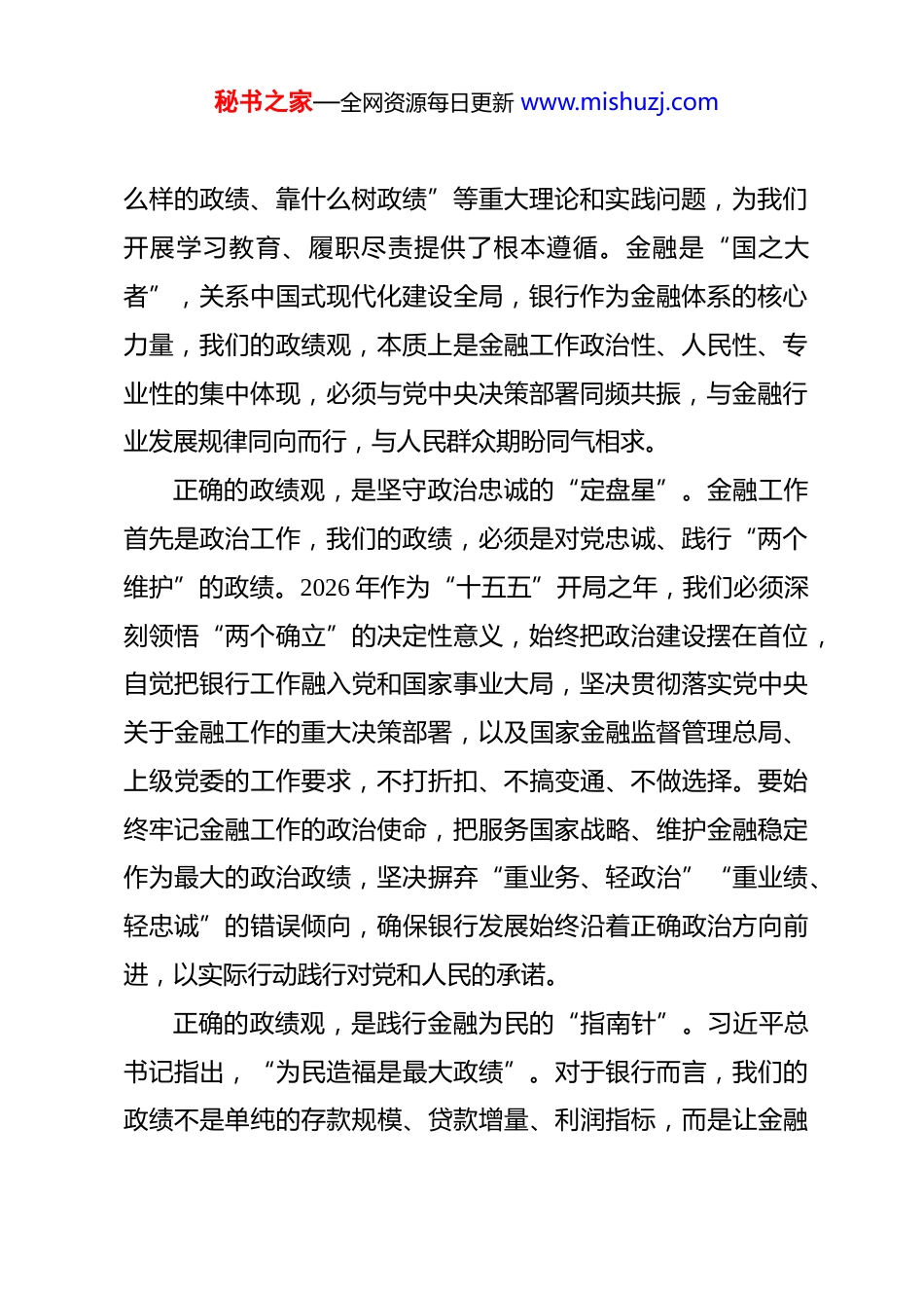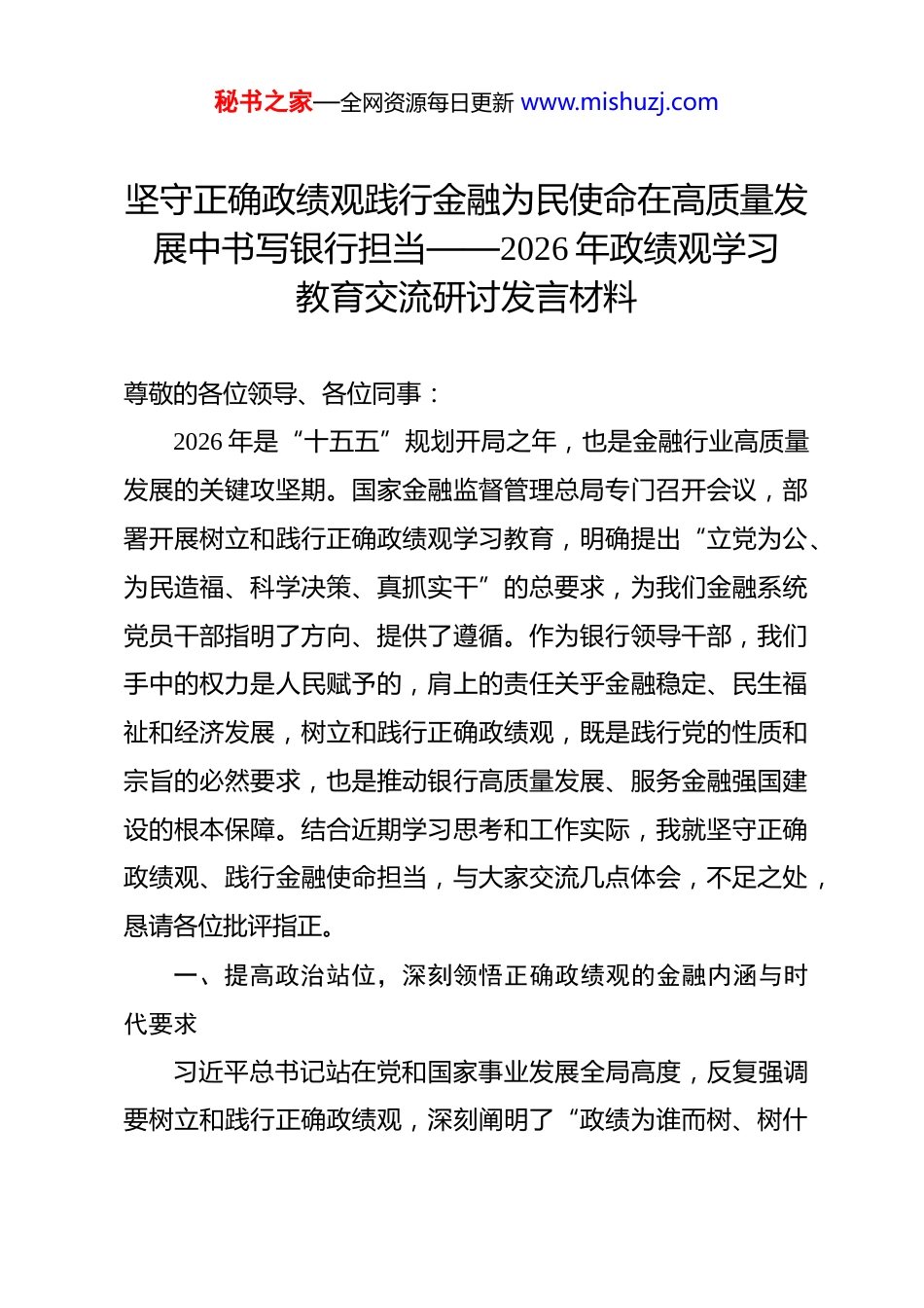 秘书之家—全网资源每日更新 www.mishuzj.com坚守正确政绩观践行金融为民使命在高质量发展中书写银行担当——2026 年政绩观学习教育交流研讨发言材料 尊敬的各位领导、各位同事:2026 年是“十五五”规划开局之年,也是金融行业高质量发展的关键攻坚期。国家金融监督管理总局专门召开会议,部署开展树立和践行正确政绩观学习教育,明确提出“立党为公、为民造福、科学决策、真抓实干”的总要求,为我们金融系统党员干部指明了方向、提供了遵循。作为银行领导干部,我们手中的权力是人民赋予的,肩上的责任关乎金融稳定、民生福祉和经济发展,树立和践行正确政绩观,既是践行党的性质和宗旨的必然要求,也是推动银行高质量发展、服务金融强国建设的根本保障。结合近期学习思考和工作实际,我就坚守正确政绩观、践行金融使命担当,与大家交流几点体会,不足之处,恳请各位批评指正。一、提高政治站位,深刻领悟正确政绩观的金融内涵与时代要求习近平总书记站在党和国家事业发展全局高度,反复强调要树立和践行正确政绩观,深刻阐明了“政绩为谁而树、树什秘书之家—全网资源每日更新 www.mishuzj.com么样的政绩、靠什么树政绩”等重大理论和实践问题,为我们开展学习教育、履职尽责提供了根本遵循。金融是“国之大者”,关系中国式现代化建设全局,银行作为金融体系的核心力量,我们的政绩观,本质上是金融工作政治性、人民性、专业性的集中体现,必须与党中央决策部署同频共振,与金融行业发展规律同向而行,与人民群众期盼同气相求。正确的政绩观,是坚守政治忠诚的“定盘星”。金融工作首先是政治工作,我们的政绩,必须是对党忠诚、践行“两个维护”的政绩。2026 年作为“十五五”开局之年,我们必须深刻领悟“两个确立”的决定性意义,始终把政治建设摆在首位,自觉把银行工作融入党和国家事业大局,坚决贯彻落实党中央关于金融工作的重大决策部署,以及国家金融监督管理总局、上级党委的工作要求,不打折扣、不搞变通、不做选择。要始终牢记金融工作的政治使命,把服务国家战略、维护金融稳定作为最大的政治政绩,坚决摒弃“重业务、轻政治”“重业绩、轻忠诚”的错误倾向,确保银行发展始终沿着正确政治方向前进,以实际行动践行对党和人民的承诺。正确的政绩观,是践行金融为民的“指南针”。习近平总书记指出,“为民造福是最大政绩”。对于银行而言,我们的政绩不是单纯的存款规模、贷款增量、利润指标,而是让金融秘书之家—全网资源每日更新 www.mishuzj.com服务更普惠、更便捷、更安全,让人民群众共享金融发展成果的实效。当前,人民群众对金融服务的需求日益多元化、个性化,从普惠金融、财富管理到风险防范,从线上服务、便民举措到权益保护,每一项需求都关乎群众的切身利益。我们必须始终坚持“以人民为中心”的发展思想,把群众满意作为衡量政绩的根本标准,既要做让老百姓看得见、摸得着、得实惠的实事,也要做为后人作铺垫、打基础、利长远的好事,既要做显功,也要做潜功,不计较个人功名,追求人民群众的好口碑、历史沉淀之后真正的评价。正确的政绩观,是推动高质量发展的“动力源”。当前,金融行业竞争日趋激烈,风险挑战交织叠加,粗放式发展模式已难以为继,高质量发展成为银行的必由之路。正确的政绩观,就是要摒弃急功近利、盲目扩张的浮躁心态,坚持实事求是、因地制宜,既要追求合理的业务增长和经营效益,更要注重发展质量和可持续性;既要抓好当前业务攻坚,破解发展难题,更要着眼长远布局,夯实发展基础。要深刻认识到,银行的政绩不在于一时的规模扩张,而在于核心竞争力的提升;不在于短期的利润增长,而在于风险防控能力的增强;不在于表面的数字好看,而在于对实体经济的实际贡献,真正实现速度与质量、效益与安全、当前与长远的有机统一。秘书之家—全网资源每日更新 www.mishuzj.com正确的政绩观,是坚守合规稳健的“防火墙”。金融行业是高风险行业,合规经营、稳健发展是银行的生命线。作为银行领导干部,我们的政绩必须是经得起历史、实践和监管检验的政绩,是守底线、防风险、保安全的政绩。要坚决摒弃“重发展、轻合规”“重...