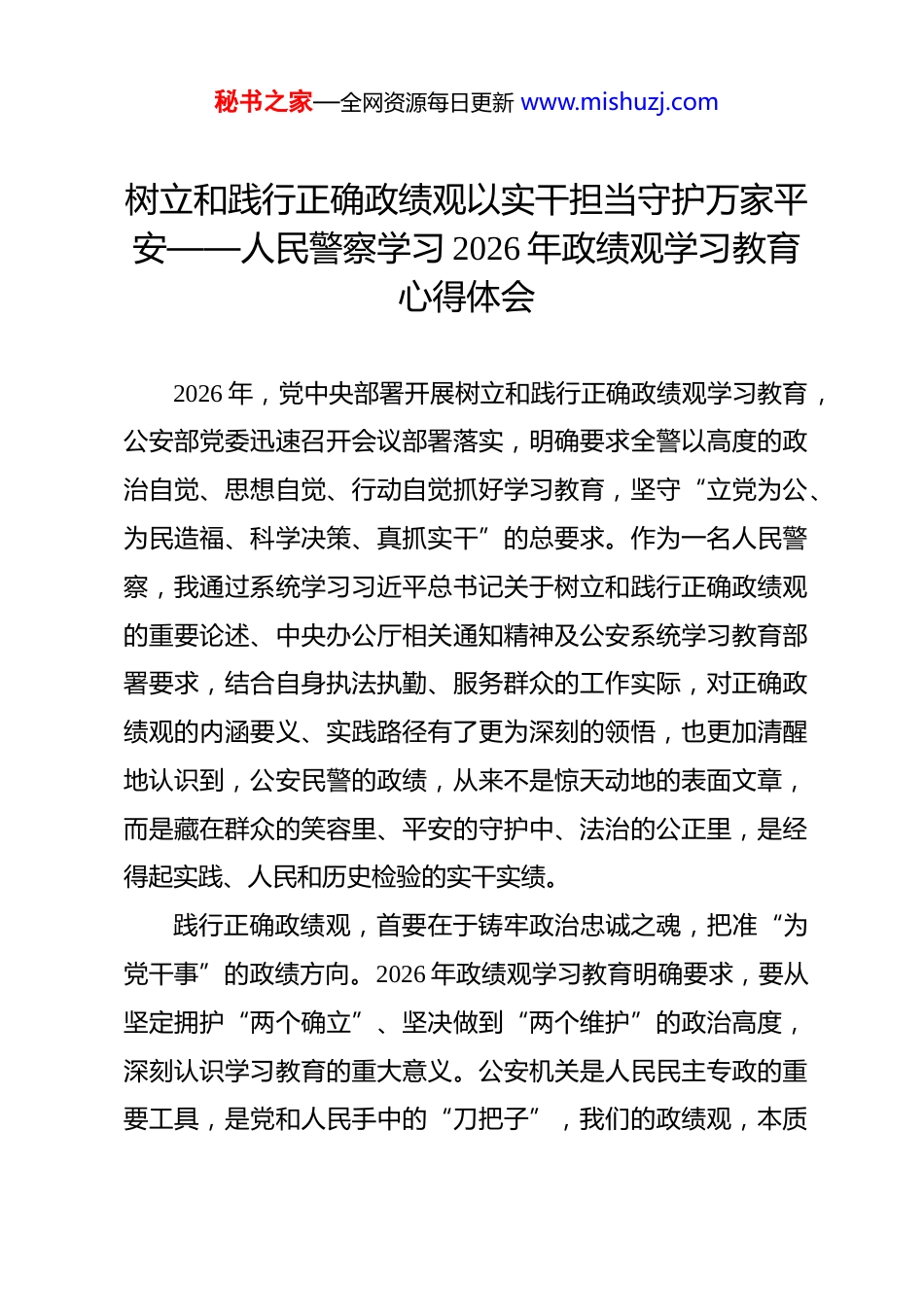 秘书之家—全网资源每日更新 www.mishuzj.com树立和践行正确政绩观以实干担当守护万家平安——人民警察学习 2026 年政绩观学习教育心得体会 2026 年,党中央部署开展树立和践行正确政绩观学习教育,公安部党委迅速召开会议部署落实,明确要求全警以高度的政治自觉、思想自觉、行动自觉抓好学习教育,坚守“立党为公、为民造福、科学决策、真抓实干”的总要求。作为一名人民警察,我通过系统学习习近平总书记关于树立和践行正确政绩观的重要论述、中央办公厅相关通知精神及公安系统学习教育部署要求,结合自身执法执勤、服务群众的工作实际,对正确政绩观的内涵要义、实践路径有了更为深刻的领悟,也更加清醒地认识到,公安民警的政绩,从来不是惊天动地的表面文章,而是藏在群众的笑容里、平安的守护中、法治的公正里,是经得起实践、人民和历史检验的实干实绩。践行正确政绩观,首要在于铸牢政治忠诚之魂,把准“为党干事”的政绩方向。2026 年政绩观学习教育明确要求,要从坚定拥护“两个确立”、坚决做到“两个维护”的政治高度,深刻认识学习教育的重大意义。公安机关是人民民主专政的重要工具,是党和人民手中的“刀把子”,我们的政绩观,本质秘书之家—全网资源每日更新 www.mishuzj.com上是党性的体现、忠诚的延伸。作为人民警察,我们的“政绩”首先是政治政绩,是坚决贯彻落实党中央关于公安工作的重大决策部署,坚决捍卫政治安全、维护社会安定、保障人民安宁。在学习教育中,我深刻认识到,以往工作中偶尔存在“重业务、轻政治”的倾向,片面追求案件办理数量、巡逻里程等显性指标,却忽视了政治要求在各项工作中的贯穿。今后,我将始终把政治建设摆在首位,原原本本学习《习近平关于树立和践行正确政绩观论述摘编》等学习资料,深刻领悟其中蕴含的立场、观点、方法,把政治忠诚融入执法办案、服务群众的每一个环节,确保各项工作始终沿着正确政治方向前进,以实际行动践行“对党忠诚、服务人民、执法公正、纪律严明”的总要求,让“两个维护”成为践行正确政绩观的根本遵循。践行正确政绩观,核心在于坚守为民服务之本,厚植“为民造福”的政绩底色。习近平总书记深刻指出,“共产党人必须牢记,为民造福是最大政绩”,这也是 2026 年政绩观学习教育的核心要义。人民警察来自人民、植根人民,全心全意为人民服务是我们的根本宗旨,群众满意与否,是衡量我们政绩的唯一标尺。结合学习教育要求,我对照自身工作反思,发现存在“重大案、轻小案”“重处置、轻回访”的问题,认为破获重大案件才是“政绩”,却忽视了群众身边的盗窃、纠纷等秘书之家—全网资源每日更新 www.mishuzj.com“小事”,殊不知这些“小事”才是群众最关心、最直接、最现实的利益问题。正如延安市安塞分局将 32 项服务事项下放至派出所,打造 15 分钟便民服务圈,用暖心服务践行初心,这才是公安民警最实在的政绩。今后,我将始终坚持以人民为中心的发展思想,牢固树立“小案里面有政治,小案里面有民心”的理念,深化“破小案、暖民心”行动,把群众的“急难愁盼”作为工作的出发点和落脚点。无论是户籍办理、证照补办等便民服务,还是邻里纠纷、求助求助等日常警情,都用心用情、精益求精,主动深入群众、倾听群众呼声,把服务做到群众心坎上;同时,常态化开展“我为群众办实事”实践活动,推动“指尖服务、一网通办”,让群众少跑腿、好办事,用实实在在的服务成效,提升群众的获得感、幸福感、安全感,让为民造福成为践行正确政绩观的生动实践。践行正确政绩观,关键在于锤炼真抓实干之风,夯实“实干担当”的政绩根基。2026 年政绩观学习教育强调,要高标准一体化推进学查改各项任务,在深学上下功夫、在真查上下功夫、在实改上下功夫,力戒形式主义、官僚主义。公安工作面对的是复杂的社会治安形势,肩负着守护平安的重大责任,政绩从来不是靠喊口号、摆样子得来的,而是靠一步一个脚印干出来的,既要追求快侦快破、护稳保安的“显绩”,更要重视秘书之家—全网资源每日更新 www.mishuzj.com源头治理、基层防范的“潜绩”。以往工作中,我曾存在“重部署、轻落实”“重痕迹...