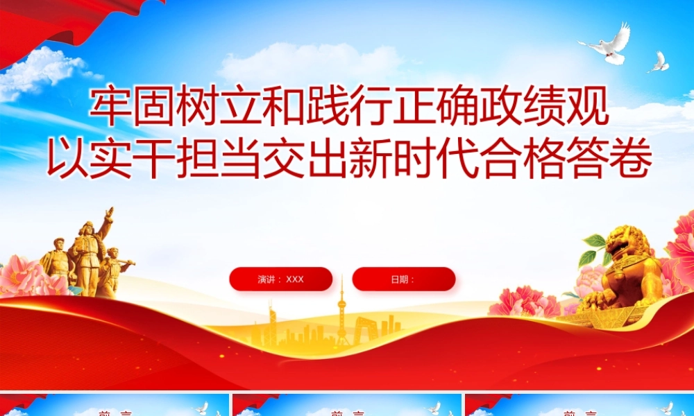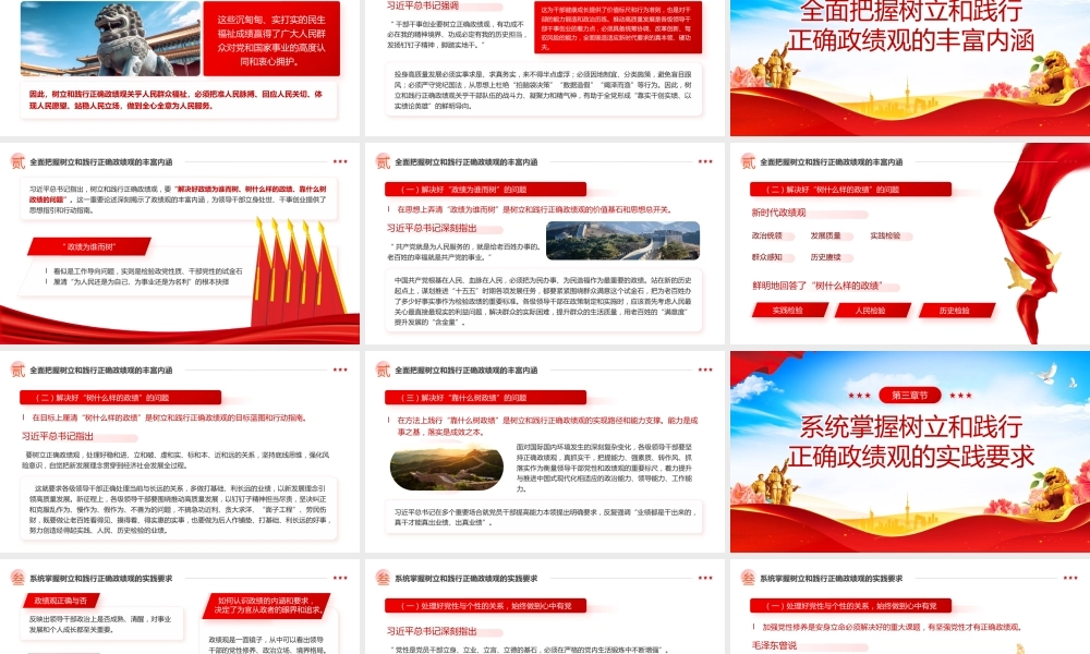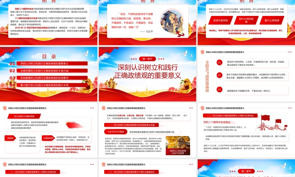 牢固树立和践行正确政绩观以实干担当交出新时代合格答卷日期:演讲: XXX前 言 党的二十届四中全会对推进国家治理体系和治理能力现代化作出全面战略部署,其核心要义在于坚持依法治国、依规治党,完善党和国家监督体系,推动权力在法治轨道上、在阳光下运行。 二十届中央纪委五次全会将推动党员干部树立和践行正确政绩观作为政治监督的重要内容,强调要自觉按规律办事,做到为人民出政绩、以实干出政绩,释放出纠偏政绩偏差、强化实干导向的鲜明信号。 2025 年 12 月召开的中央政治局会议明确要求,围绕实现“十五五”时期目标任务做深做实政治监督,推动党员干部树立和践行正确政绩观,把党中央重大决策部署落到实处。前 言 “ 党员、干部特别是领导干部要树立正确的权力观、政绩观、事业观,不慕虚荣,不务虚功,不图虚名,切实做到为官一任、造福一方”—— 习近平前 言党的十八大以来,习近平总书记围绕“政绩为谁而树、树什么样的政绩、靠什么树政绩”等重大理论和实践问题作出一系列重要论述,体现了对新时代干部队伍建设规律的深刻思考和把握。政绩为谁而树树什么样的政绩靠什么树政绩新征程上,领导干部要深入学习贯彻习近平总书记重要论述,树立和践行正确政绩观,努力创造经得起实践、人民、历史检验的实绩。目 录深刻认识树立和践行正确政绩观的重要意义01全面把握树立和践行正确政绩观的丰富内涵02系统掌握树立和践行正确政绩观的实践要求03着力提升树立和践行正确政绩观的能力本领04深刻认识树立和践行正确政绩观的重要意义第一章节深刻认识树立和践行正确政绩观的重要意义壹01是党员干部世界观、人生观、价值观和权力观、地位观、利益观、事业观等在干事创业中的体现;中国共产党的政绩观02是关于政绩方向和事业道路的看法,决定着党员干部采取什么样的事业态度、遵循着什么样的工作精神、追求着什么样的政绩目标;03是衡量党员干部履职尽责、干事创业的一把标尺。深刻认识树立和践行正确政绩观的重要意义壹树立和践行正确政绩观是体现党的性质和宗旨、推进党和国家事业健康发展的要求是更好地满足人民群众对美好生活向往的要求是推动高质量发展的要求正确政绩观深深植根于党的初心使命、性质宗旨,生动体现在党的一切奋斗、全部实践之中。政绩观对政绩的根本观点和总的看法,是世界观、人生观、价值观在从政行为中的具体体现。l树立和践行正确政绩观,起决定性作用的是党性。只有党性坚强、摒弃私心杂念,才能保证政绩观不出偏差,真正把心思和精力放在为党和人民干事创业上。坚持高质量发展要成为领导干部政绩观的重要内容。深刻认识树立和践行正确政绩观的重要意义壹正确政绩观是为政之德、从政之道、施政之要,不仅事关一地一域发展,更事关“国之大者”、党之大计,对党和国家事业发展、人民群众切身利益、干部队伍健康成长具有重要意义。(一)树立和践行正确政绩观事关党和国家事业发展习近平总书记强调自觉为人民出政绩以实干出政绩实践证明,政绩观与发展观紧密相连,树立什么样的政绩观,就会导向什么样的发展观,进而产生什么样的发展效果。政绩观摆正了,才能紧紧围绕客观实际和群众需求谋划工作,真正把精力放在推动高质量发展上;反之,政绩观跑偏了,就容易急功近利、投机取巧,造成违背客观规律、贻害深远的严重后果。因此,树立和践行正确政绩观关乎党和国家事业发展的政治方向和发展道路,是将“国之大者”内化于心、外化于行的过程,是把高质量发展从宏观要求转化为具体行动的切实举措。深刻认识树立和践行正确政绩观的重要意义壹(二)树立和践行正确政绩观事关人民群众切身利益党的二十届四中全会指出“ 十五五”时期经济社会发展必须坚持人民至上,让现代化建设成果更多更公平惠及全体人民。这就要求各级领导干部在任何时候任何情况下都要尊重人民主体地位,紧紧依靠人民,维护人民根本利益。党的十八大以来,以习近平同志为核心的党中央始终坚持以人民为中心,历史性地解决了绝对贫困问题,建成世界上规模最大的教育体系、社会保障体系、医疗卫生体系,经济实力、科技实力、综合国力跃上新台阶。深刻认识树立和践行正确政绩观...
