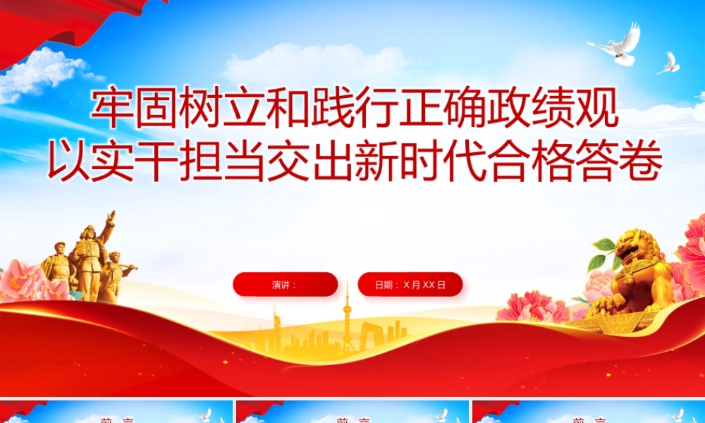 牢固树立和践行正确政绩观以实干担当交出新时代合格答卷日期: X 月 XX 日演讲:前 言 党的二十届四中全会对推进国家治理体系和治理能力现代化作出全面战略部署,其核心要义在于坚持依法治国、依规治党,完善党和国家监督体系,推动权力在法治轨道上、在阳光下运行。 二十届中央纪委五次全会将推动党员干部树立和践行正确政绩观作为政治监督的重要内容,强调要自觉按规律办事,做到为人民出政绩、以实干出政绩,释放出纠偏政绩偏差、强化实干导向的鲜明信号。 2025 年 12 月召开的中央政治局会议明确要求,围绕实现“十五五”时期目标任务做深做实政治监督,推动党员干部树立和践行正确政绩观,把党中央重大决策部署落到实处。前 言 “ 党员、干部特别是领导干部要树立正确的权力观、政绩观、事业观,不慕虚荣,不务虚功,不图虚名,切实做到为官一任、造福一方”—— 习近平前 言党的十八大以来,习近平总书记围绕“政绩为谁而树、树什么样的政绩、靠什么树政绩”等重大理论和实践问题作出一系列重要论述,体现了对新时代干部队伍建设规律的深刻思考和把握。政绩为谁而树树什么样的政绩靠什么树政绩新征程上,领导干部要深入学习贯彻习近平总书记重要论述,树立和践行正确政绩观,努力创造经得起实践、人民、历史检验的实绩。目 录深刻认识树立和践行正确政绩观的重要意义01全面把握树立和践行正确政绩观的丰富内涵02系统掌握树立和践行正确政绩观的实践要求03着力提升树立和践行正确政绩观的能力本领04深刻认识树立和践行正确政绩观的重要意义第一章节深刻认识树立和践行正确政绩观的重要意义壹01是党员干部世界观、人生观、价值观和权力观、地位观、利益观、事业观等在干事创业中的体现;中国共产党的政绩观02是关于政绩方向和事业道路的看法,决定着党员干部采取什么样的事业态度、遵循着什么样的工作精神、追求着什么样的政绩目标;03是衡量党员干部履职尽责、干事创业的一把标尺。深刻认识树立和践行正确政绩观的重要意义壹树立和践行正确政绩观是体现党的性质和宗旨、推进党和国家事业健康发展的要求是更好地满足人民群众对美好生活向往的要求是推动高质量发展的要求正确政绩观深深植根于党的初心使命、性质宗旨,生动体现在党的一切奋斗、全部实践之中。政绩观对政绩的根本观点和总的看法,是世界观、人生观、价值观在从政行为中的具体体现。l树立和践行正确政绩观,起决定性作用的是党性。只有党性坚强、摒弃私心杂念,才能保证政绩观不出偏差,真正把心思和精力放在为党和人民干事创业上。坚持高质量发展要成为领导干部政绩观的重要内容。深刻认识树立和践行正确政绩观的重要意义壹正确政绩观是为政之德、从政之道、施政之要,不仅事关一地一域发展,更事关“国之大者”、党之大计,对党和国家事业发展、人民群众切身利益、干部队伍健康成长具有重要意义。(一)树立和践行正确政绩观事关党和国家事业发展习近平总书记强调自觉为人民出政绩以实干出政绩实践证明,政绩观与发展观紧密相连,树立什么样的政绩观,就会导向什么样的发展观,进而产生什么样的发展效果。政绩观摆正了,才能紧紧围绕客观实际和群众需求谋划工作,真正把精力放在推动高质量发展上;反之,政绩观跑偏了,就容易急功近利、投机取巧,造成违背客观规律、贻害深远的严重后果。因此,树立和践行正确政绩观关乎党和国家事业发展的政治方向和发展道路,是将“国之大者”内化于心、外化于行的过程,是把高质量发展从宏观要求转化为具体行动的切实举措。深刻认识树立和践行正确政绩观的重要意义壹(二)树立和践行正确政绩观事关人民群众切身利益党的二十届四中全会指出“ 十五五”时期经济社会发展必须坚持人民至上,让现代化建设成果更多更公平惠及全体人民。这就要求各级领导干部在任何时候任何情况下都要尊重人民主体地位,紧紧依靠人民,维护人民根本利益。党的十八大以来,以习近平同志为核心的党中央始终坚持以人民为中心,历史性地解决了绝对贫困问题,建成世界上规模最大的教育体系、社会保障体系、医疗卫生体系,经济实力、科技实力、综合国力跃上新台阶。深刻认识树立和践行...