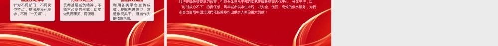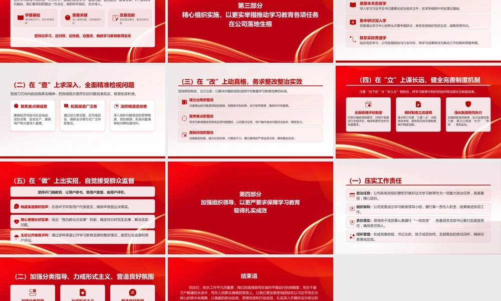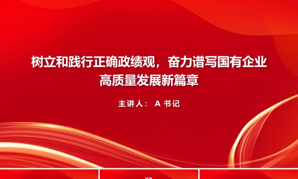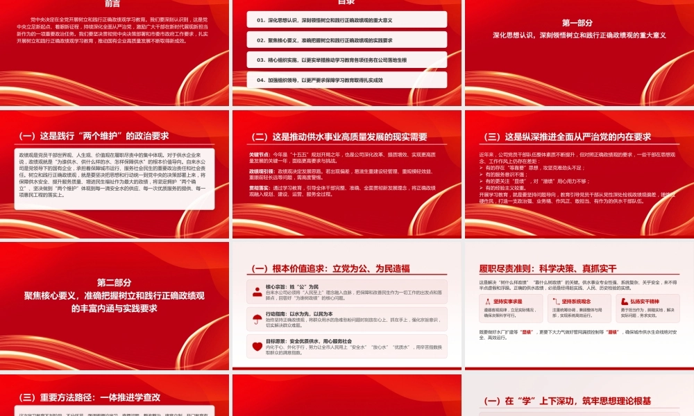 树立和践行正确政绩观,奋力谱写国有企业高质量发展新篇章主 讲 人 : A 书 记前言 党中央决定在全党开展树立和践行正确政绩观学习教育。我们要深刻认识到,这是党中央立足新起点、着眼新征程,持续深化全面从严治党,激励广大干部在新时代展现新担当新作为的一项重要政治任务。我们要坚决贯彻党中央决策部署和市委市政府工作要求,扎实开展树立和践行正确政绩观学习教育,推动国有企业高质量发展不断取得新成效。目录01. 深化思想认识,深刻领悟树立和践行正确政绩观的重大意义02. 聚焦核心要义,准确把握树立和践行正确政绩观的实践要求03. 精心组织实施,以更实举措推动学习教育各项任务在公司落地生根04. 加强组织领导,以更严要求保障学习教育取得扎实成效第一部分深化思想认识,深刻领悟树立和践行正确政绩观的重大意义(一)这是践行“两个维护”的政治要求政绩观是党员干部世界观、人生观、价值观在履职尽责中的集中体现。对于供水企业来说,政绩观就是“为谁供水、供什么样的水、怎样保障供水”的根本价值导向。自来水公司是党领导下的国有企业,承担着保障城市运行、服务社会民生的重要政治责任和社会责任。树立和践行正确政绩观,就是要坚决把思想和行动统一到党中央的决策部署上来,将保障供水安全、提升服务质量、增进民生福祉作为最大的政绩,将坚定拥护“两个确立”、坚决做到“两个维护”体现到每一滴安全水的供应、每一次优质服务的提供、每一项惠民工程的落实上。(二)这是推动供水事业高质量发展的现实需要关键节点:今年是“十五五”规划开局之年,也是公司深化改革、提质增效、实现更高质量发展的关键一年,面临更高要求与挑战。政绩观引领:政绩观决定发展思路。若出现偏差,易滋生重建设轻管理、重规模轻效益、重眼前轻长远等问题,需高度警惕。贯彻落实:通过学习教育,引导全体干部完整、准确、全面贯彻新发展理念,将正确政绩观融入规划、建设、运营、服务全过程。(三)这是纵深推进全面从严治党的内在要求近年来,公司党员干部队伍整体素质不断提升,但对照正确政绩观的要求,一些干部在思想观念、工作作风上仍存在差距: 有的存在“等靠要”思想,攻坚克难劲头不足; 有的服务意识不强; 有的更关注“显绩”,对“潜绩”用心用力不够; 有的经验主义较重。开展学习教育,就是要坚持问题导向,教育引导党员干部从党性深处检视政绩观偏差,锤炼过硬作风,打造一支政治强、业务精、作风正、敢担当、有作为的供水干部队伍。第二部分聚焦核心要义,准确把握树立和践行正确政绩观的丰富内涵与实践要求(一)根本价值追求:立党为公、为民造福核心宗旨:姓“公”为民自来水公司必须将“人民至上”理念融入血脉,把保障和改善民生作为一切工作的出发点和落脚点,回答好“为谁树政绩”的核心问题。行动指南:以水为先,以民为本始终坚持正确政绩观,将群众用水的急难愁盼问题时刻放在心上、抓在手上,强化宗旨意识,切实解决群众难题。目标愿景:安全优质供水,用心服务社会内化于心、外化于行,努力让全市人民用上“安全水”“放心水”“优质水”,用辛苦指数换取群众的满意指数。履职尽责准则:科学决策、真抓实干这是解决“树什么样政绩”“靠什么树政绩”的关键。供水事业专业性强、系统复杂、关乎安全,来不得半点虚假和浮躁。正确的供水政绩,必须是经得起实践、人民、历史检验的实绩。坚持实事求是遵循客观规律,立足实际情况,确保决策科学可行。坚持系统观念注重统筹协调,兼顾整体与局部,实现系统高效运行。弘扬实干精神勇于担当作为,脚踏实地,解决实际问题,务求实效。既要做好水厂扩建等“显绩”,更要下大力气做好管网漏损控制等“潜绩”,确保城市供水生命线绝对安全、高效运行。(三)重要方法路径:一体推进学查改这次学习教育不划阶段、不分环节,强调把理论学习、查摆问题、整改整治、建章立制、开门教育有机融合。我们要深刻把握这一方法论,做到环环相扣、步步深入。学是基础坚持理论学习,筑牢思想根基查是关键深入查摆问题,找准差距不足改是目的狠抓整改整治,解决实际问题坚持边学习、边对照、边检视、边...