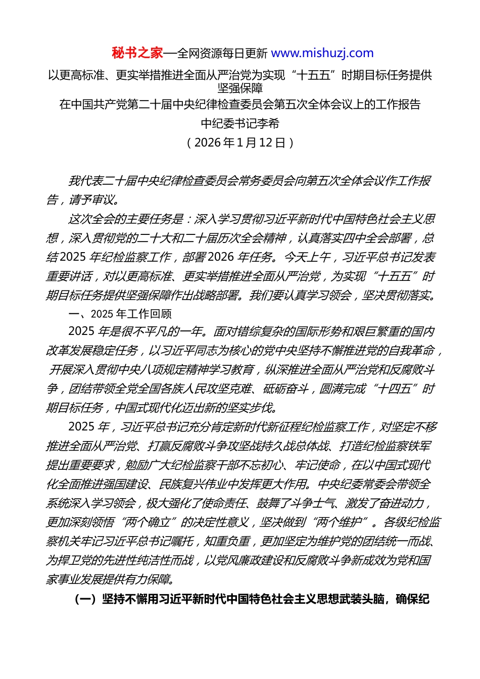 秘书之家—全网资源每日更新 www.mishuzj.com目 录1. 在第二十届中央纪律检查委员会第五次全体会议上的工作报告..........1 2. 在上海市第十二届纪律检查委员会第五次全体会议上的工作报告.......15 3. 在河南省第十一届纪律检查委员会第六次全体会议上的工作报告.......28 4. 在辽宁省第十三届纪律检查委员会第六次全体会议上的工作报告.......42 5. 在四川省第十二届纪律检查委员会第五次全体会议上的工作报告.......56 6. 在福建省第十一届纪律检查委员会第六次全体会议上的工作报告.......68 7. 在山东省第十二届纪律检查委员会第五次全体会议上的工作报告.......79 8. 在郑州市第十二届纪律检查委员会第六次全体会议上的工作报告.......93 9. 在绵阳市第八届纪律检查委员会第六次全体会议上的工作报告........107 10. 在遂宁市第八届纪律检查委员会第六次全体会议上的工作报告.......119 11. 在沁阳市第八届纪律检查委员会第六次全体会议上的工作报告.......130秘书之家—全网资源每日更新 www.mishuzj.com以更高标准、更实举措推进全面从严治党为实现“十五五”时期目标任务提供坚强保障在中国共产党第二十届中央纪律检查委员会第五次全体会议上的工作报告中纪委书记李希(2026 年 1 月 12 日)我代表二十届中央纪律检查委员会常务委员会向第五次全体会议作工作报告,请予审议。这次全会的主要任务是:深入学习贯彻习近平新时代中国特色社会主义思想,深入贯彻党的二十大和二十届历次全会精神,认真落实四中全会部署,总结 2025 年纪检监察工作,部署 2026 年任务。今天上午,习近平总书记发表重要讲话,对以更高标准、更实举措推进全面从严治党,为实现“十五五”时期目标任务提供坚强保障作出战略部署。我们要认真学习领会,坚决贯彻落实。一、2025 年工作回顾2025 年是很不平凡的一年。面对错综复杂的国际形势和艰巨繁重的国内改革发展稳定任务,以习近平同志为核心的党中央坚持不懈推进党的自我革命, 开展深入贯彻中央八项规定精神学习教育,纵深推进全面从严治党和反腐败斗争,团结带领全党全国各族人民攻坚克难、砥砺奋斗,圆满完成“十四五”时期目标任务,中国式现代化迈出新的坚实步伐。2025 年,习近平总书记充分肯定新时代新征程纪检监察工作,对坚定不移推进全面从严治党、打赢反腐败斗争攻坚战持久战总体战、打造纪检监察铁军提出重要要求,勉励广大纪检监察干部不忘初心、牢记使命,在以中国式现代化全面推进强国建设、民族复兴伟业中发挥更大作用。中央纪委常委会带领全系统深入学习领会,极大强化了使命责任、鼓舞了斗争士气、激发了奋进动力, 更加深刻领悟“两个确立”的决定性意义,坚决做到“两个维护”。各级纪检监察机关牢记习近平总书记嘱托,知重负重,更加坚定为维护党的团结统一而战、为捍卫党的先进性纯洁性而战,以党风廉政建设和反腐败斗争新成效为党和国家事业发展提供有力保障。(一)坚持不懈用习近平新时代中国特色社会主义思想武装头脑,确保纪秘书之家—全网资源每日更新 www.mishuzj.com检监察工作始终沿着正确方向前进牢牢把握强化党的创新理论武装这个首要政治任务,深学习、实调研、抓秘书之家—全网资源每日更新 www.mishuzj.com落实,在知行合一中体悟真理力量、实践伟力。深化理论学习。中央纪委常委会发挥领学促学作用,严格执行“第一议题”制度,深入学习《习近平谈治国理政》第五卷,跟进传达学习习近平总书记重要讲话和重要指示批示精神,自觉用党的创新理论统领纪检监察一切工作。深入学习贯彻党的二十届四中全会精神,找准工作着力点,主动服务保障经济社会发展大局。加强宣传阐释。深入学习宣传习近平总书记关于党的建设的重要思想、关于党的自我革命的重要思想,深刻阐释“九个以”实践要求和“五个进一步到位”重要要求。制作播出电视专题片《反腐为了人民》,唱响全面从严治党主旋律;廓清思想迷雾,有力批驳对反腐败斗争的错误认识,凝聚激浊扬清正能量。深入调查研究。中央纪委常委会围绕“加大一体推进不敢腐、不能腐、不想腐力度”等 9 个课题开展调研,带动中央纪委...