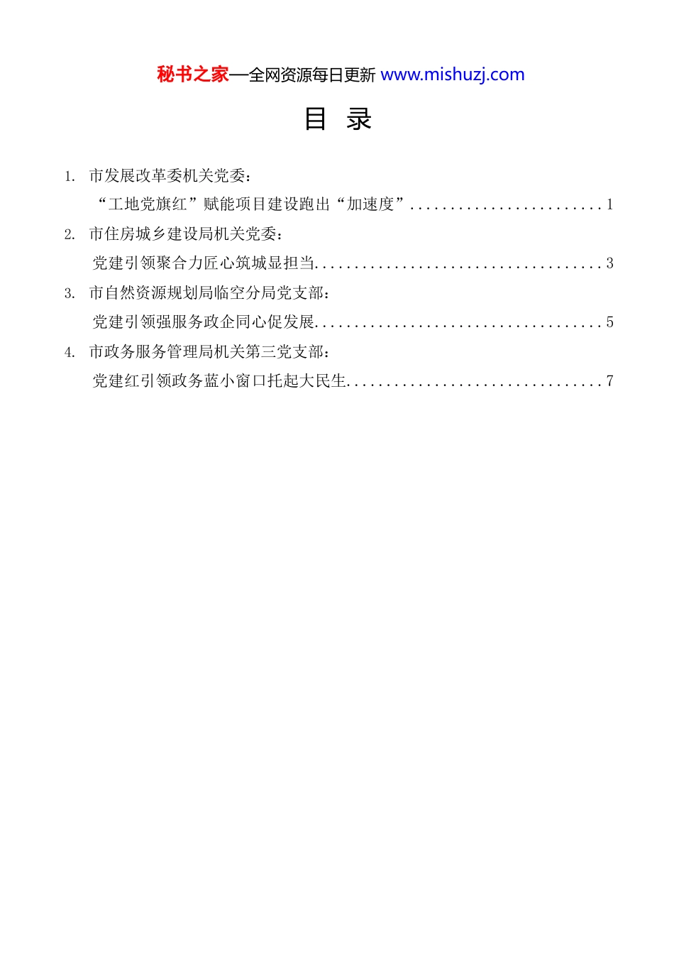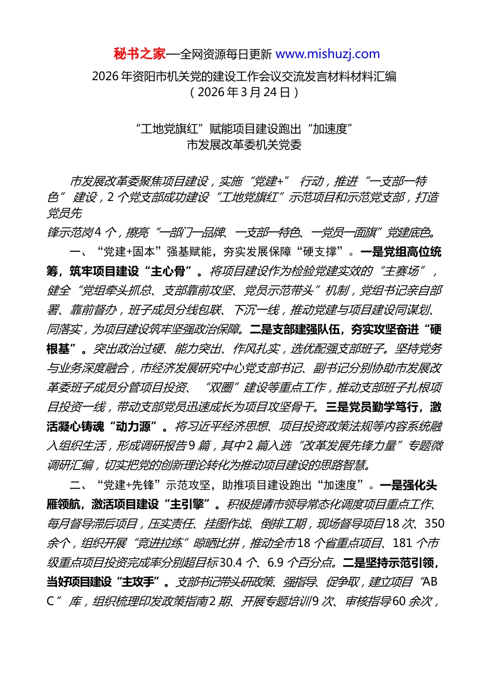 秘书之家—全网资源每日更新 www.mishuzj.com目 录 1. 市发展改革委机关党委: “工地党旗红”赋能项目建设跑出“加速度”........................1 2. 市住房城乡建设局机关党委: 党建引领聚合力匠心筑城显担当....................................3 3. 市自然资源规划局临空分局党支部: 党建引领强服务政企同心促发展....................................5 4. 市政务服务管理局机关第三党支部: 党建红引领政务蓝小窗口托起大民生................................7 秘书之家—全网资源每日更新 www.mishuzj.com2026 年资阳市机关党的建设工作会议交流发言材料材料汇编(2026 年 3 月 24 日)“工地党旗红”赋能项目建设跑出“加速度”市发展改革委机关党委市发展改革委聚焦项目建设,实施“党建+” 行动,推进“一支部一特色” 建设,2 个党支部成功建设“工地党旗红”示范项目和示范党支部,打造党员先锋示范岗 4 个,擦亮“一部门一品牌、一支部一特色、一党员一面旗”党建底色。一、“党建+固本”强基赋能,夯实发展保障“硬支撑”。一是党组高位统筹,筑牢项目建设“主心骨”。将项目建设作为检验党建实效的“主赛场”,健全“党组牵头抓总、支部靠前攻坚、党员示范带头”机制,党组书记亲自部署、靠前督办,班子成员分线包联、下沉一线,推动党建与项目建设同谋划、同落实,为项目建设筑牢坚强政治保障。二是支部建强队伍,夯实攻坚奋进“硬根基”。突出政治过硬、能力突出、作风扎实,选优配强支部班子。坚持党务与业务深度融合,市经济发展研究中心党支部书记、副书记分别协助市发展改革委班子成员分管项目投资、“双圈”建设等重点工作,推动支部班子扎根项目投资一线,带动支部党员迅速成长为项目攻坚骨干。三是党员勤学笃行,激活凝心铸魂“动力源”。将习近平经济思想、项目投资政策法规等内容系统融入组织生活,形成调研报告 9 篇,其中 2 篇入选“改革发展先锋力量”专题微调研汇编,切实把党的创新理论转化为推动项目建设的思路智慧。二、“党建+先锋”示范攻坚,助推项目建设跑出“加速度”。一是强化头雁领航,激活项目建设“主引擎”。积极提请市领导常态化调度项目重点工作、每月督导滞后项目,压实责任、挂图作战、倒排工期,现场督导项目 18 次、350余个,组织开展“竞进拉练”晾晒比拼,推动全市 18 个省重点项目、181 个市级重点项目投资完成率分别超目标 30.4 个、6.9 个百分点。二是坚持示范引领,当好项目建设“主攻手”。支部书记带头研政策、强指导、促争取,建立项目“ABC” 库,组织梳理印发政策指南 2 期、开展专题培训 9 次、审核指导 60 余次,秘书之家—全网资源每日更新 www.mishuzj.com推动全市 2025 年争取到位项目资金较 2024 年增加 17.1 亿元。三是立足先锋表率,争当项目建设“排头兵”。设立党员先锋岗、示范团队,党员在项目一线“亮身份、践承诺、作表率”,紧盯项目审批、要素保障、建设推进等关键环节,冲锋在秘书之家—全网资源每日更新 www.mishuzj.com前、攻坚克难,建立市级重点项目用地保障台账,开辟行政审批“绿色通道”, 推动星河动力二期等 69 个重大项目开工建设,中华优秀传统文化科技创新示范园、水上运动基地等 79 个重大项目竣工。三、“党建+聚力”提质增效,提振奋进担当“精气神”。一是坚持结对共建,吹响融圈“冲锋号”。紧盯“双圈”建设重大项目,市经济发展研究中心党支部与中铁二十一局成渝中线二分部党支部结对共建,常态化跟踪服务、协调解决项目建设存在问题,为项目建设赋能,成渝中线高铁资阳段隧道全线贯通、桥梁建设完成,推动项目正式迈入全面冲刺阶段。二是健全评价机制,激活争优“战斗力”。把支部规范化建设、品牌创建等纳入支部书记述职评议和评先评优重点内容,推动各党支部比学赶超、创先争优,市经济研究中心党支部连续 2 年成功建设为“工地党旗红”示范项目,获评“四强”党支部。三是深化风险防控,注入项目“清廉力”。扎实开展深入贯彻中央八项规定精神学习教育及“学规学纪学法”活动,针对项目投资等重点岗位...