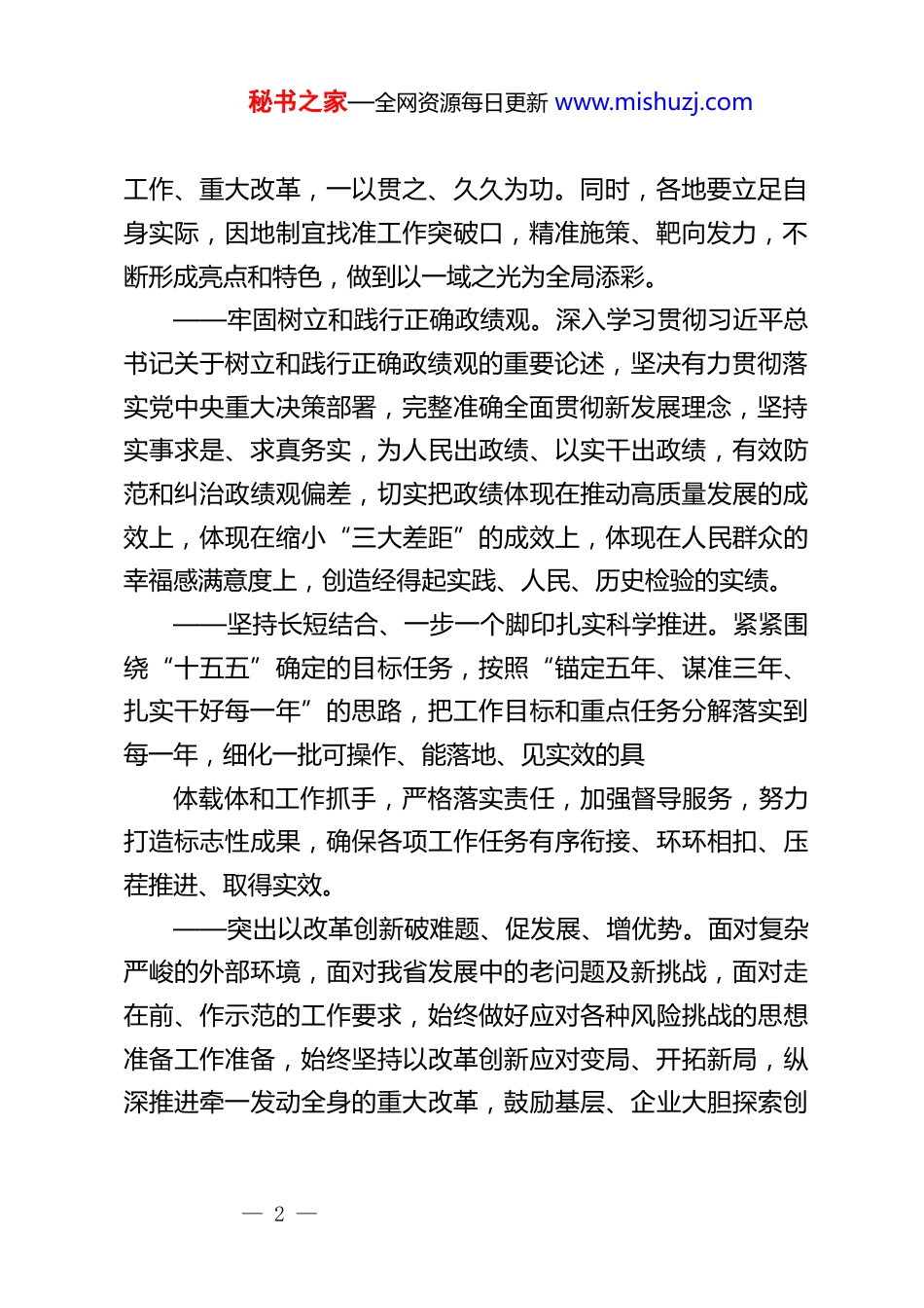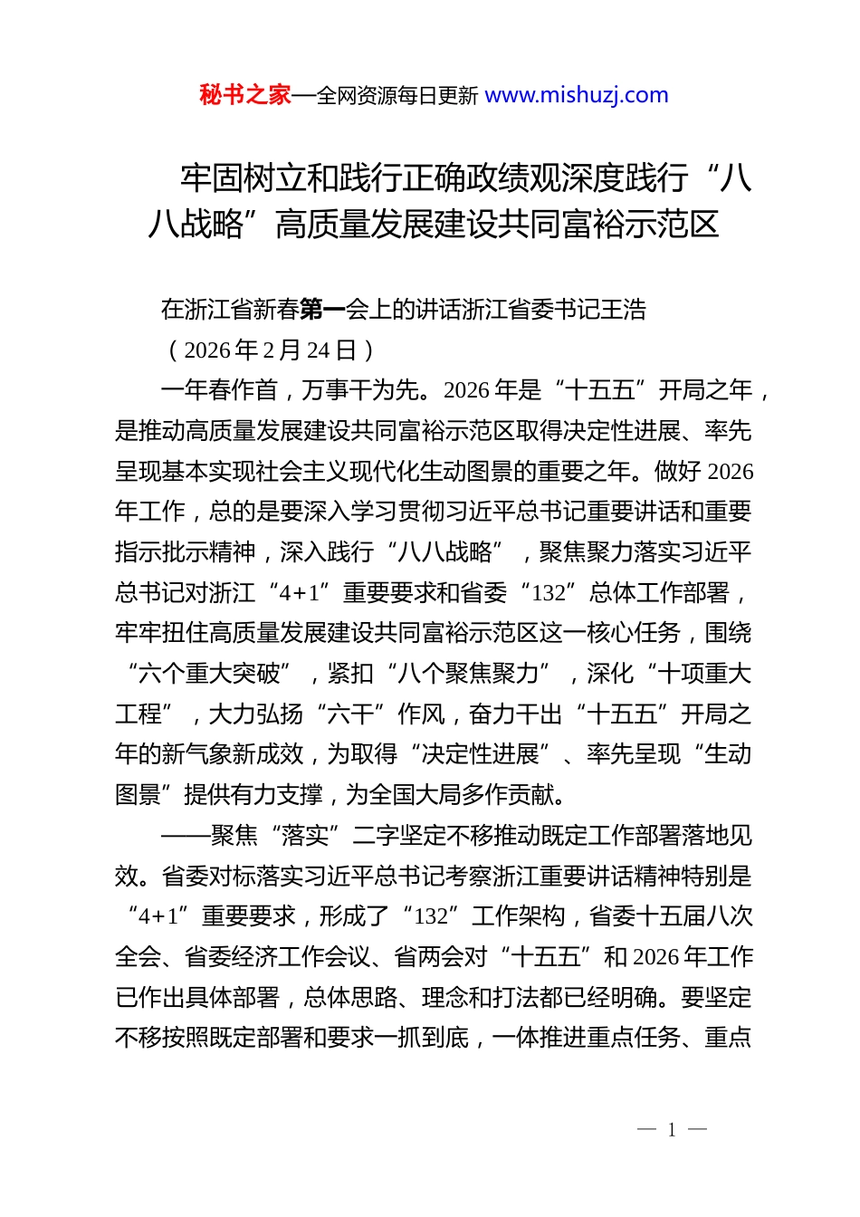 秘书之家—全网资源每日更新 www.mishuzj.com牢固树立和践行正确政绩观深度践行“八八战略”高质量发展建设共同富裕示范区在浙江省新春第一会上的讲话浙江省委书记王浩(2026 年 2 月 24 日)一年春作首,万事干为先。2026 年是“十五五”开局之年,是推动高质量发展建设共同富裕示范区取得决定性进展、率先呈现基本实现社会主义现代化生动图景的重要之年。做好 2026年工作,总的是要深入学习贯彻习近平总书记重要讲话和重要指示批示精神,深入践行“八八战略”,聚焦聚力落实习近平总书记对浙江“4+1”重要要求和省委“132”总体工作部署,牢牢扭住高质量发展建设共同富裕示范区这一核心任务,围绕“六个重大突破”,紧扣“八个聚焦聚力”,深化“十项重大工程”,大力弘扬“六干”作风,奋力干出“十五五”开局之年的新气象新成效,为取得“决定性进展”、率先呈现“生动图景”提供有力支撑,为全国大局多作贡献。——聚焦“落实”二字坚定不移推动既定工作部署落地见效。省委对标落实习近平总书记考察浙江重要讲话精神特别是“4+1”重要要求,形成了“132”工作架构,省委十五届八次全会、省委经济工作会议、省两会对“十五五”和 2026 年工作已作出具体部署,总体思路、理念和打法都已经明确。要坚定不移按照既定部署和要求一抓到底,一体推进重点任务、重点— 1 —秘书之家—全网资源每日更新 www.mishuzj.com工作、重大改革,一以贯之、久久为功。同时,各地要立足自身实际,因地制宜找准工作突破口,精准施策、靶向发力,不断形成亮点和特色,做到以一域之光为全局添彩。——牢固树立和践行正确政绩观。深入学习贯彻习近平总书记关于树立和践行正确政绩观的重要论述,坚决有力贯彻落实党中央重大决策部署,完整准确全面贯彻新发展理念,坚持实事求是、求真务实,为人民出政绩、以实干出政绩,有效防范和纠治政绩观偏差,切实把政绩体现在推动高质量发展的成效上,体现在缩小“三大差距”的成效上,体现在人民群众的幸福感满意度上,创造经得起实践、人民、历史检验的实绩。——坚持长短结合、一步一个脚印扎实科学推进。紧紧围绕“十五五”确定的目标任务,按照“锚定五年、谋准三年、扎实干好每一年”的思路,把工作目标和重点任务分解落实到每一年,细化一批可操作、能落地、见实效的具体载体和工作抓手,严格落实责任,加强督导服务,努力打造标志性成果,确保各项工作任务有序衔接、环环相扣、压茬推进、取得实效。——突出以改革创新破难题、促发展、增优势。面对复杂严峻的外部环境,面对我省发展中的老问题及新挑战,面对走在前、作示范的工作要求,始终做好应对各种风险挑战的思想准备工作准备,始终坚持以改革创新应对变局、开拓新局,纵深推进牵一发动全身的重大改革,鼓励基层、企业大胆探索创— 2 —秘书之家—全网资源每日更新 www.mishuzj.com新,深入推进以科技创新为引领的全面创新,充分激发各类经营主体活力和社会创造力,不断塑造发展新动能新优势。——促进高质量发展和高水平安全良性互动。坚持以高质量发展为首要任务,在发展中固安全、在安全中谋发展,以“时时放心不下”的责任感,始终把防范化解重大风险隐患、建设更高水平平安浙江牢牢抓在手上,进一步织密织牢“安全网”,加快推进治理体系和治理能力现代化,切实增强经济和社会韧性,以高水平安全保障高质量发展。开局之年当干出开局之势,起步之时需展现奋进之姿。今天的新春第一会,就是吹响实干争先的冲锋号,打响拼搏奋进的发令枪,动员全省上下一门心思抓落实、全力以赴抓攻坚,确保交出“十五五”开局之年的精彩答卷。一、在坚定扛起经济大省挑大梁的责任担当、持续推动经济稳进向好上交出精彩答卷既扛起政治责任,又用好政策机遇,推动经济发展不仅在“量的合理增长”上走在前列,更在“质的有效提升”上示范引领,更好发挥带动和支柱作用。全力推动创新浙江建设全面成势。进一步加大工作力度,持续做深做透“两篇大文章”,加快打造人工智能创新发展高地,加快培育一流创新生态,加快构建浙江特色现代化产业体系,推动创新浙江由“点上出彩”迈向“面上开花”,由“局...
