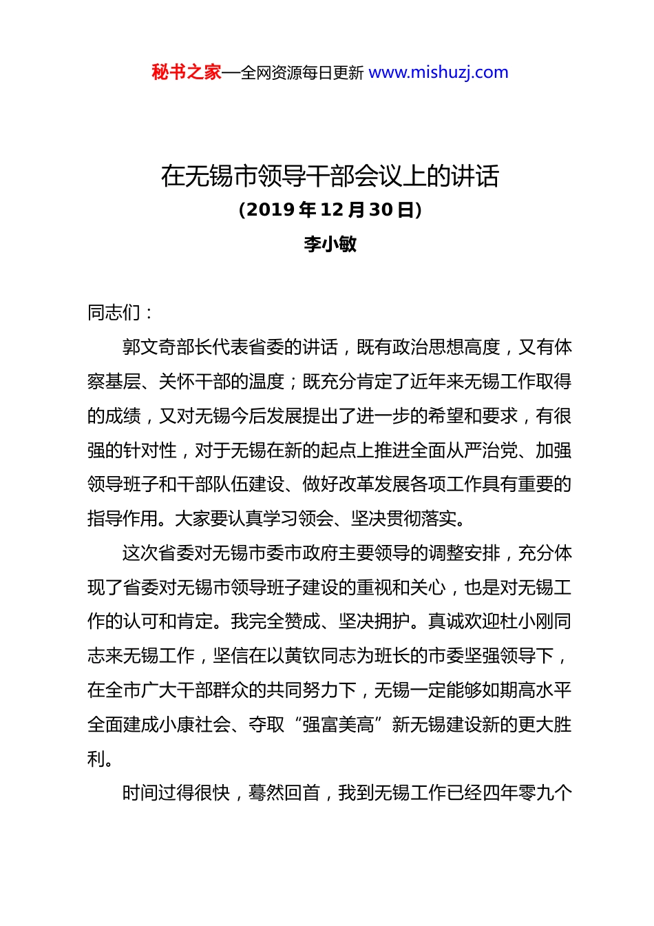 秘书之家—全网资源每日更新 www.mishuzj.com在无锡市领导干部会议上的讲话(2019 年 12 月 30 日)李小敏同志们:郭文奇部长代表省委的讲话,既有政治思想高度,又有体察基层、关怀干部的温度;既充分肯定了近年来无锡工作取得的成绩,又对无锡今后发展提出了进一步的希望和要求,有很强的针对性,对于无锡在新的起点上推进全面从严治党、加强领导班子和干部队伍建设、做好改革发展各项工作具有重要的指导作用。大家要认真学习领会、坚决贯彻落实。这次省委对无锡市委市政府主要领导的调整安排,充分体现了省委对无锡市领导班子建设的重视和关心,也是对无锡工作的认可和肯定。我完全赞成、坚决拥护。真诚欢迎杜小刚同志来无锡工作,坚信在以黄钦同志为班长的市委坚强领导下,在全市广大干部群众的共同努力下,无锡一定能够如期高水平全面建成小康社会、夺取“强富美高”新无锡建设新的更大胜利。时间过得很快,蓦然回首,我到无锡工作已经四年零九个秘书之家—全网资源每日更新 www.mishuzj.com月,现在到了告别的时候了。告别的时候,我最想说的两个字是“感谢”。我要感谢无锡这座城市,雍容而自信、开放而包容,使我有幸在最后的党政生涯于这里度过一段充实而难忘的时光;我要感谢无锡人民,聪慧而勤勉、进取而笃实,让我在履职过程中不断受到激励鞭策,得到信任支持,有了坚实依靠;我要感谢无锡老领导老同志,情深而义重、秉公而守正,对市委的工作给予真诚无私的关心和帮助,从中我获得满满的正能量;我要感谢一起共事的同志们,同心而协力、担责而有为,你们和全市各级干部用实际行动印证了“世上无难事,只要肯登攀”的道理,我为成为大家中的一员而感到自豪和荣光。告别的时候,心情总是复杂的。此时,我既平静又不平静平静的是离任顺乎其然,不平静的是熟悉的人和城市不再朝夕相伴;既放下又放不下,放下的是岗位工作,放不下的是对无锡发展事业和人民福祉的牵挂;既遗憾又不遗憾,遗憾的是不少工作没有做到或没有做好,不遗憾的是自己已经尽力了,现在可以无愧地说:我兑现了与无锡干部群众“同心干、一起拼”的承诺。明年,无锡将高水平全面建成小康社会,并将开启基本实现现代化的新征程。新时代,是新思想指引的时代,是属于奋秘书之家—全网资源每日更新 www.mishuzj.com斗者的时代,是无锡人民不断圆梦的时代。在此,我真诚地祝愿:无锡事业兴旺发达!无锡人民幸福安康!无锡明天更加美好!
