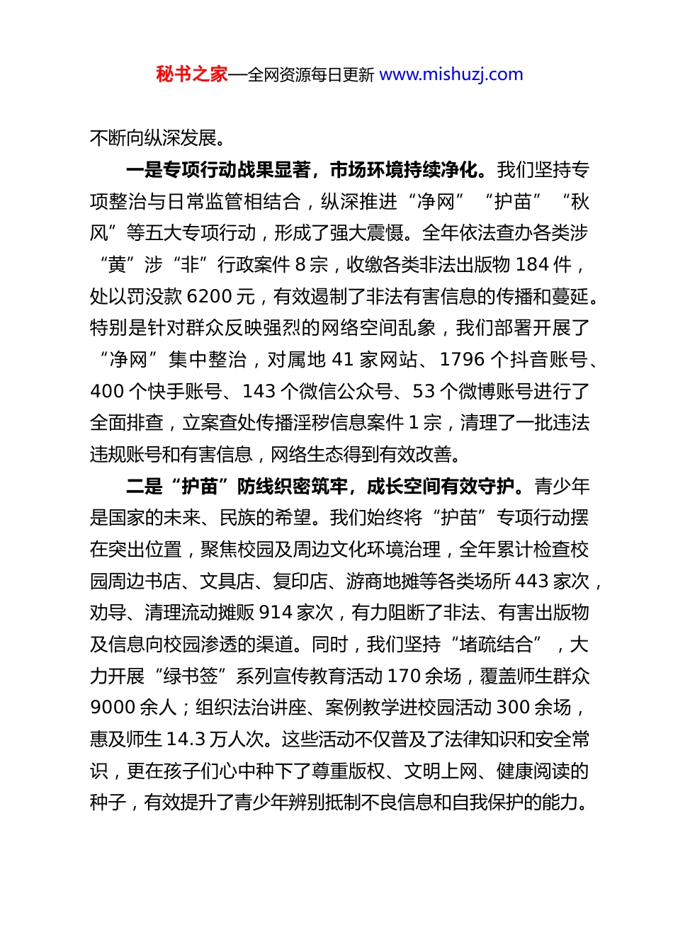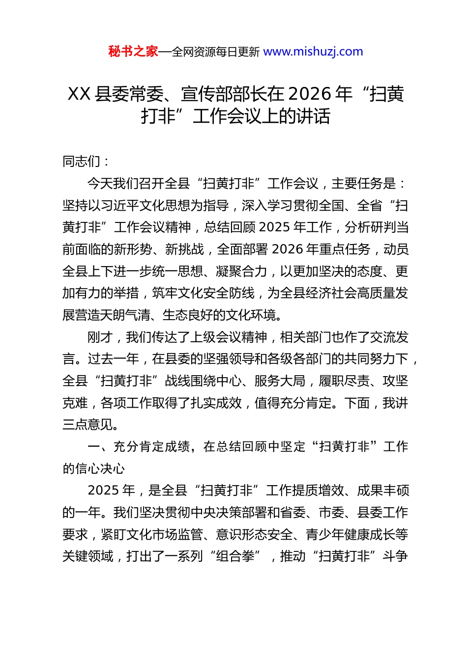 秘书之家—全网资源每日更新 www.mishuzj.comXX 县委常委、宣传部部长在 2026 年“扫黄打非”工作会议上的讲话同志们:今天我们召开全县“扫黄打非”工作会议,主要任务是:坚持以习近平文化思想为指导,深入学习贯彻全国、全省“扫黄打非”工作会议精神,总结回顾 2025 年工作,分析研判当前面临的新形势、新挑战,全面部署 2026 年重点任务,动员全县上下进一步统一思想、凝聚合力,以更加坚决的态度、更加有力的举措,筑牢文化安全防线,为全县经济社会高质量发展营造天朗气清、生态良好的文化环境。刚才,我们传达了上级会议精神,相关部门也作了交流发言。过去一年,在县委的坚强领导和各级各部门的共同努力下,全县“扫黄打非”战线围绕中心、服务大局,履职尽责、攻坚克难,各项工作取得了扎实成效,值得充分肯定。下面,我讲三点意见。一、充分肯定成绩,在总结回顾中坚定“扫黄打非”工作的信心决心2025 年,是全县“扫黄打非”工作提质增效、成果丰硕的一年。我们坚决贯彻中央决策部署和省委、市委、县委工作要求,紧盯文化市场监管、意识形态安全、青少年健康成长等关键领域,打出了一系列“组合拳”,推动“扫黄打非”斗争秘书之家—全网资源每日更新 www.mishuzj.com不断向纵深发展。一是专项行动战果显著,市场环境持续净化。我们坚持专项整治与日常监管相结合,纵深推进“净网”“护苗”“秋风”等五大专项行动,形成了强大震慑。全年依法查办各类涉“黄”涉“非”行政案件 8 宗,收缴各类非法出版物 184 件,处以罚没款 6200 元,有效遏制了非法有害信息的传播和蔓延。特别是针对群众反映强烈的网络空间乱象,我们部署开展了“净网”集中整治,对属地 41 家网站、1796 个抖音账号、400 个快手账号、143 个微信公众号、53 个微博账号进行了全面排查,立案查处传播淫秽信息案件 1 宗,清理了一批违法违规账号和有害信息,网络生态得到有效改善。二是“护苗”防线织密筑牢,成长空间有效守护。青少年是国家的未来、民族的希望。我们始终将“护苗”专项行动摆在突出位置,聚焦校园及周边文化环境治理,全年累计检查校园周边书店、文具店、复印店、游商地摊等各类场所 443 家次,劝导、清理流动摊贩 914 家次,有力阻断了非法、有害出版物及信息向校园渗透的渠道。同时,我们坚持“堵疏结合”,大力开展“绿书签”系列宣传教育活动 170 余场,覆盖师生群众9000 余人;组织法治讲座、案例教学进校园活动 300 余场,惠及师生 14.3 万人次。这些活动不仅普及了法律知识和安全常识,更在孩子们心中种下了尊重版权、文明上网、健康阅读的种子,有效提升了青少年辨别抵制不良信息和自我保护的能力。秘书之家—全网资源每日更新 www.mishuzj.com三是源头治理不断深化,寄递渠道严密管控。非法出版物通过寄递渠道流通,隐蔽性强、危害性大。我们紧盯这一关键环节,加强了对邮政快递业的监管。全年随机抽查了 9 家快递企业的 28 个收寄场所,检查“三项制度”落实情况。同时,专门举办了全县邮政快递业“扫黄打非”工作培训班,对快递企业负责人、一线收寄人员进行法律法规和辨识技能培训,压实了企业主体责任,提升了从业人员对非法出版物的敏感性和查堵能力,构筑了“扫黄打非”的物流寄递防线,严防非法出版物“乔装打扮”、流通扩散。四是宣传声势全面壮大,共治氛围日益浓厚。我们坚持将宣传引导作为深入推进“扫黄打非”工作的重要抓手。全年围绕版权保护、网络安全、抵制有害信息等主题,组织开展各类线上线下宣传活动 600 余场,发放宣传折页、海报等资料4000 余张,利用户外大屏、楼宇电视、公共交通载体滚动播放公益宣传片、科普短视频 1037 次。在宣传报道方面,我们在国家和省级主流媒体、工作平台刊发相关信息 72 篇,在县级融媒体平台发布各类报道、动态 100 余篇,全方位、多角度展示了工作成效,普及了法律法规,揭露了非法有害出版物的危害,有效提升了“扫黄打非”工作的社会知晓率、参与率和支持率,初步形成了“人人参与、人人受益”的良好社会氛围。这些成绩的取得,是县委、县政府高度重视、坚强领导的...