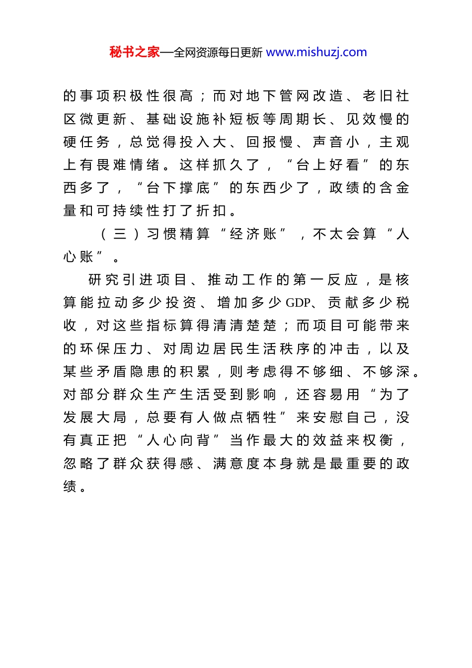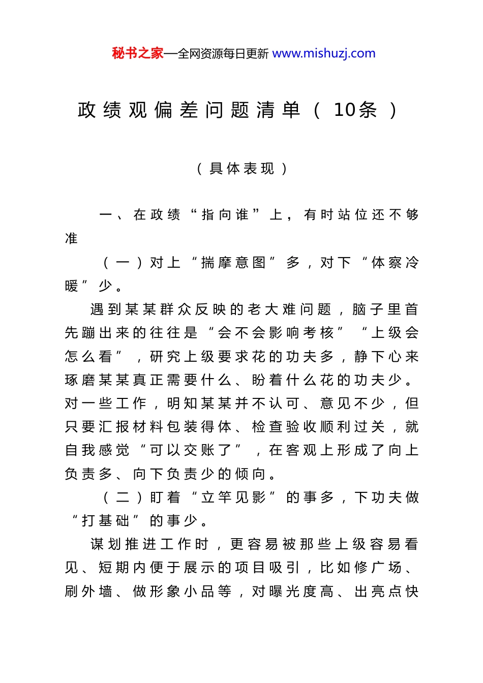 秘书之家—全网资源每日更新 www.mishuzj.com政 绩 观 偏 差 问 题 清 单 ( 10 条 )( 具 体 表 现 )一 、 在 政 绩 “ 指 向 谁 ” 上 , 有 时 站 位 还 不 够准( 一 ) 对 上 “ 揣 摩 意 图 ” 多 , 对 下 “ 体 察 冷暖 ” 少 。遇 到 某 某 群 众 反 映 的 老 大 难 问 题 , 脑 子 里 首先 蹦 出 来 的 往 往 是 “ 会 不 会 影 响 考 核 ” “ 上 级 会怎 么 看 ” , 研 究 上 级 要 求 花 的 功 夫 多 , 静 下 心 来琢 磨 某 某 真 正 需 要 什 么 、 盼 着 什 么 花 的 功 夫 少 。对 一 些 工 作 , 明 知 某 某 并 不 认 可 、 意 见 不 少 , 但只 要 汇 报 材 料 包 装 得 体 、 检 查 验 收 顺 利 过 关 , 就自 我 感 觉 “ 可 以 交 账 了 ” , 在 客 观 上 形 成 了 向 上负 责 多 、 向 下 负 责 少 的 倾 向 。( 二 ) 盯 着 “ 立 竿 见 影 ” 的 事 多 , 下 功 夫 做“ 打 基 础 ” 的 事 少 。谋 划 推 进 工 作 时 , 更 容 易 被 那 些 上 级 容 易 看见 、 短 期 内 便 于 展 示 的 项 目 吸 引 , 比 如 修 广 场 、刷 外 墙 、 做 形 象 小 品 等 , 对 曝 光 度 高 、 出 亮 点 快秘书之家—全网资源每日更新 www.mishuzj.com的 事 项 积 极 性 很 高 ; 而 对 地 下 管 网 改 造 、 老 旧 社区 微 更 新 、 基 础 设 施 补 短 板 等 周 期 长 、 见 效 慢 的硬 任 务 , 总 觉 得 投 入 大 、 回 报 慢 、 声 音 小 , 主 观上 有 畏 难 情 绪 。 这 样 抓 久 了 , “ 台 上 好 看 ” 的 东西 多 了 , “ 台 下 撑 底 ” 的 东 西 少 了 , 政 绩 的 含 金量 和 可 持 续 性 打 了 折 扣 。( 三 ) 习 惯 精 算 “ 经 济 账 ” , 不 太 会 算 “ 人心 账 ” 。研 究 引 进 项 目 、 推 动 工 作 的 第 一 反 应 , 是 核算 能 拉 动 多 少 投 资 、 增 加 多 少 GDP、 贡 献 多 少 税收 , 对 这 些 指 标 算 得 清 清 楚 楚 ; 而 项 目 可 能 带 来的 环 保 压 力 、 对 周 边 居 民 生 活 秩 序 的 冲 击 , 以 及某 些 矛 盾 隐 患 的 积 累 , 则 考 虑 得 不 够 细 、 不 够 深 。对 部 分 群 众 生 产 生 活 受 到 影 响 , 还 容 易 用 “ 为 了发 展 大 局 , 总 要 有 人 做 点 牺 牲 ” 来 安 慰 自 己 , 没有 真 正 把 “ 人 心 向 背 ” 当 作 最 大 的 效 益 来 权 衡 ,忽 略 了 群 众 获 得 感 、 满 意 度 本 身 就 是 最 重 要 的 政绩 。秘书之家—全网资源每日更新 www.mishuzj.com二 、 在 政 绩 “ 抓 什 么 ” 上 , 有 时 偏 离 了 实 绩导 向( 一 ) 更 在 意 “ 声 势 如 何 ” , 不 够 关 注 “ 成效 几 何 ” 。有 的 工 作 刚 起 步 , 就 忙 着 开 大 会 、 上 头 条 、发 简 报 , 宣 传 报 道 、 典 型 经 验 一 股 脑 推 上 去 ,“ 部 署 多 、 亮 相 多 、 总 结 多 ” , 真 正 沉 到 一 线 盯落 实 、 解 难 题 的 时 间 却 被 不 断 挤 压 。 文 件 发 出 了 、会 议 开 过 了 、 新 闻 播 出 了 , 看 起 来 “ 动 作 一 套 一套 ” , 但 基 层 反 映 的 问 题 依 旧 存 在 , 某 某 的 获 得感 并 没 有 同 步 提 升 , 把 “ 说 在 前 头 ” 当 成 ...