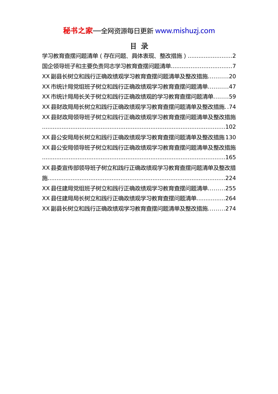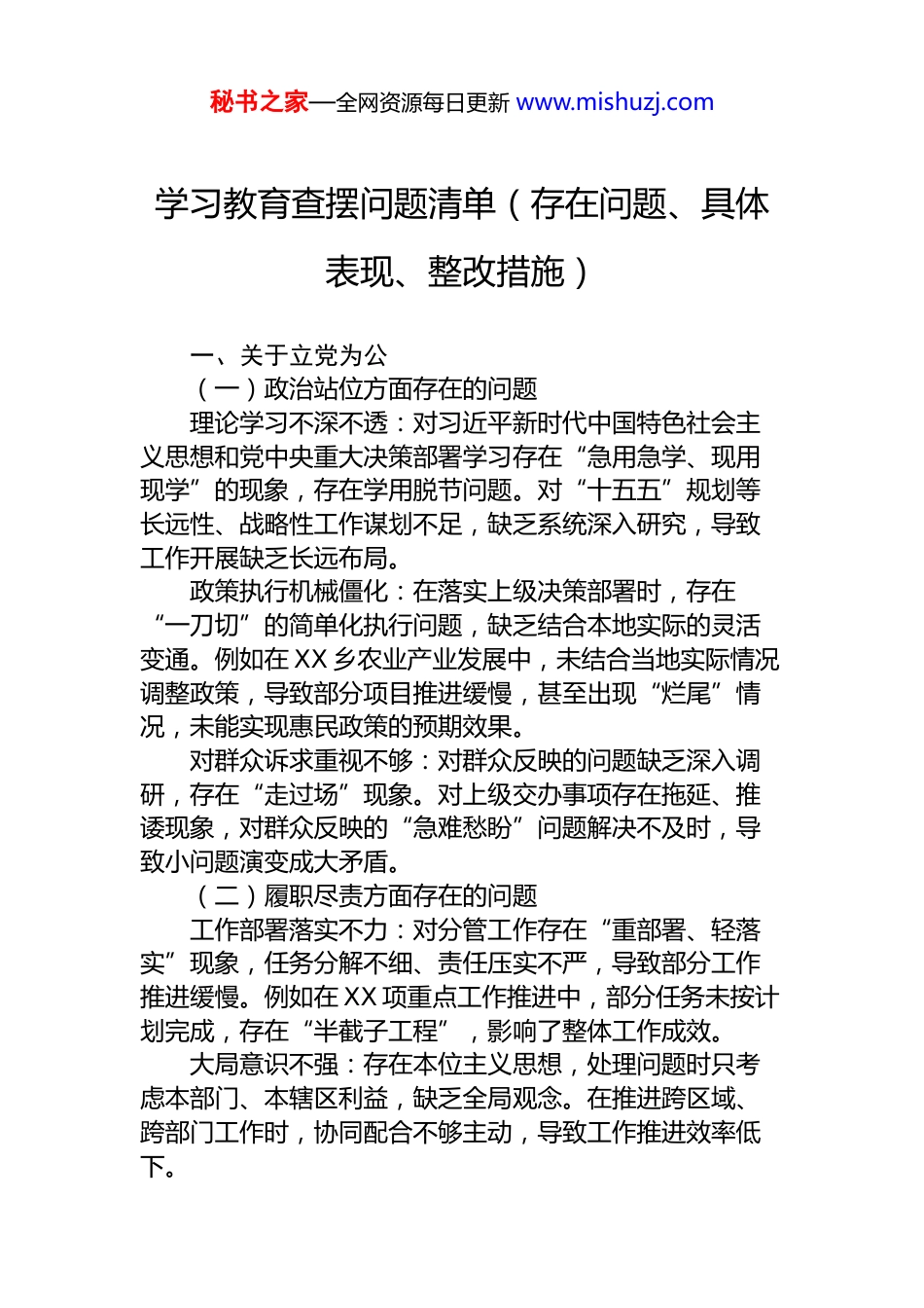 秘书之家—全网资源每日更新 www.mishuzj.com目 录学习教育查摆问题清单(存在问题、具体表现、整改措施).........................2国企领导班子和主要负责同志学习教育查摆问题清单..................................7XX 副县长树立和践行正确政绩观学习教育查摆问题清单及整改措施...........20XX 市统计局党组班子树立和践行正确政绩观学习教育查摆问题清单...........47XX 市统计局局长关于树立和践行正确政绩观的学习教育查摆问题清单........59XX 县财政局局长树立和践行正确政绩观学习教育查摆问题清单及整改措施..74XX 县财政局领导班子树立和践行正确政绩观学习教育查摆问题清单及整改措施.......................................................................................................102XX 县公安局局长树立和践行正确政绩观学习教育查摆问题清单及整改措施130XX 县公安局领导班子树立和践行正确政绩观学习教育查摆问题清单及整改措施.......................................................................................................165XX 县委宣传部领导班子树立和践行正确政绩观学习教育查摆问题清单及整改措施....................................................................................................224XX 县住建局党组班子树立和践行正确政绩观学习教育查摆问题清单.........255XX 县住建局局长树立和践行正确政绩观学习教育查摆问题清单................264XX 副县长树立和践行正确政绩观学习教育查摆问题清单及整改措施.........274秘书之家—全网资源每日更新 www.mishuzj.com学习教育查摆问题清单(存在问题、具体表现、整改措施)一、关于立党为公(一)政治站位方面存在的问题理论学习不深不透:对习近平新时代中国特色社会主义思想和党中央重大决策部署学习存在“急用急学、现用现学”的现象,存在学用脱节问题。对“十五五”规划等长远性、战略性工作谋划不足,缺乏系统深入研究,导致工作开展缺乏长远布局。政策执行机械僵化:在落实上级决策部署时,存在“一刀切”的简单化执行问题,缺乏结合本地实际的灵活变通。例如在 XX 乡农业产业发展中,未结合当地实际情况调整政策,导致部分项目推进缓慢,甚至出现“烂尾”情况,未能实现惠民政策的预期效果。对群众诉求重视不够:对群众反映的问题缺乏深入调研,存在“走过场”现象。对上级交办事项存在拖延、推诿现象,对群众反映的“急难愁盼”问题解决不及时,导致小问题演变成大矛盾。(二)履职尽责方面存在的问题工作部署落实不力:对分管工作存在“重部署、轻落实”现象,任务分解不细、责任压实不严,导致部分工作推进缓慢。例如在 XX 项重点工作推进中,部分任务未按计划完成,存在“半截子工程”,影响了整体工作成效。大局意识不强:存在本位主义思想,处理问题时只考虑本部门、本辖区利益,缺乏全局观念。在推进跨区域、跨部门工作时,协同配合不够主动,导致工作推进效率低下。秘书之家—全网资源每日更新 www.mishuzj.com基层调研不深入:下基层调研存在“走马观花”现象,未能真正深入了解基层实际和群众需求。对群众反映的共性问题、个性问题掌握不全面,导致制定的政策缺乏针对性和可操作性。二、关于为民造福(一)宗旨意识方面存在的问题群众观念淡薄:对“以人民为中心”的发展思想践行不到位,存在“官僚主义”倾向。在推进民生项目时,过于追求工程进度和形象,忽视了群众的实际感受和长远利益。工作作风不扎实:在处理群众诉求时,存在“冷硬横推”现象,对群众反映的问题推诿扯皮、敷衍塞责。对群众反映强烈的突出问题,如 XX 小区物业管理混乱、XX 村道路积水等问题,解决不及时、不彻底。服务意识不强:对群众的“急难愁盼”问题排查不全面,对群众的合理诉求回应不及时。在推进民生工程时,存在“重形式、轻内容”的问题,工程质量不达标,未能真正惠及群众。(二)具体工作方面存在的问题惠民政策落实不到位:对上级惠民政策宣传解读不深入,部分政策在执行过程中存在“中梗阻”。例如在 XX 项惠民补贴发放中...