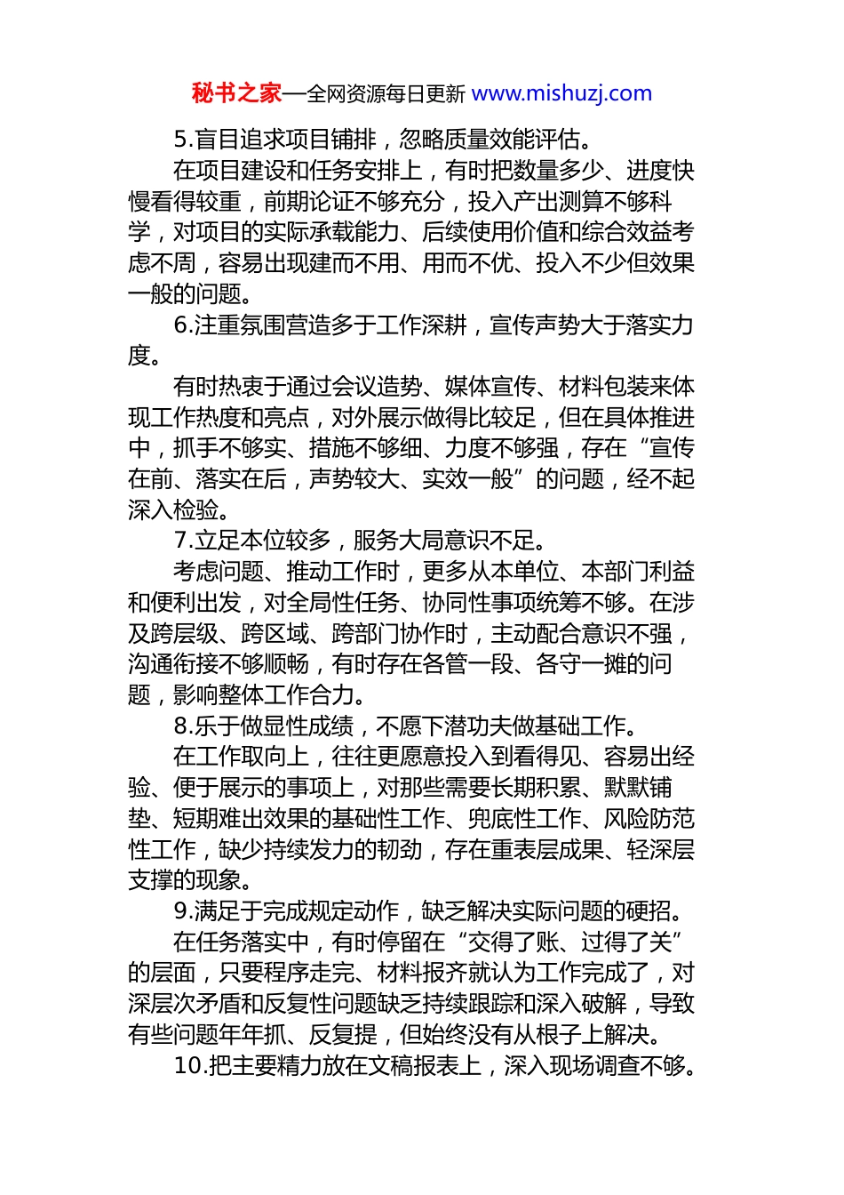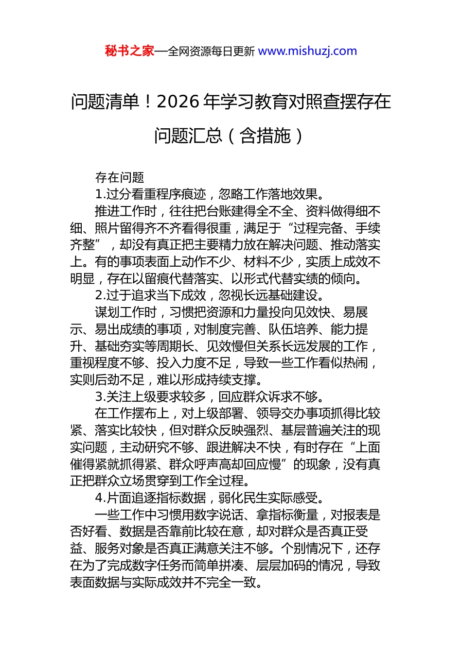 秘书之家—全网资源每日更新 www.mishuzj.com问题清单!2026 年学习教育对照查摆存在问题汇总(含措施)存在问题1.过分看重程序痕迹,忽略工作落地效果。推进工作时,往往把台账建得全不全、资料做得细不细、照片留得齐不齐看得很重,满足于“过程完备、手续齐整”,却没有真正把主要精力放在解决问题、推动落实上。有的事项表面上动作不少、材料不少,实质上成效不明显,存在以留痕代替落实、以形式代替实绩的倾向。2.过于追求当下成效,忽视长远基础建设。谋划工作时,习惯把资源和力量投向见效快、易展示、易出成绩的事项,对制度完善、队伍培养、能力提升、基础夯实等周期长、见效慢但关系长远发展的工作,重视程度不够、投入力度不足,导致一些工作看似热闹,实则后劲不足,难以形成持续支撑。3.关注上级要求较多,回应群众诉求不够。在工作摆布上,对上级部署、领导交办事项抓得比较紧、落实比较快,但对群众反映强烈、基层普遍关注的现实问题,主动研究不够、跟进解决不快,有时存在“上面催得紧就抓得紧、群众呼声高却回应慢”的现象,没有真正把群众立场贯穿到工作全过程。4.片面追逐指标数据,弱化民生实际感受。一些工作中习惯用数字说话、拿指标衡量,对报表是否好看、数据是否靠前比较在意,却对群众是否真正受益、服务对象是否真正满意关注不够。个别情况下,还存在为了完成数字任务而简单拼凑、层层加码的情况,导致表面数据与实际成效并不完全一致。秘书之家—全网资源每日更新 www.mishuzj.com5.盲目追求项目铺排,忽略质量效能评估。在项目建设和任务安排上,有时把数量多少、进度快慢看得较重,前期论证不够充分,投入产出测算不够科学,对项目的实际承载能力、后续使用价值和综合效益考虑不周,容易出现建而不用、用而不优、投入不少但效果一般的问题。6.注重氛围营造多于工作深耕,宣传声势大于落实力度。有时热衷于通过会议造势、媒体宣传、材料包装来体现工作热度和亮点,对外展示做得比较足,但在具体推进中,抓手不够实、措施不够细、力度不够强,存在“宣传在前、落实在后,声势较大、实效一般”的问题,经不起深入检验。7.立足本位较多,服务大局意识不足。考虑问题、推动工作时,更多从本单位、本部门利益和便利出发,对全局性任务、协同性事项统筹不够。在涉及跨层级、跨区域、跨部门协作时,主动配合意识不强,沟通衔接不够顺畅,有时存在各管一段、各守一摊的问题,影响整体工作合力。8.乐于做显性成绩,不愿下潜功夫做基础工作。在工作取向上,往往更愿意投入到看得见、容易出经验、便于展示的事项上,对那些需要长期积累、默默铺垫、短期难出效果的基础性工作、兜底性工作、风险防范性工作,缺少持续发力的韧劲,存在重表层成果、轻深层支撑的现象。9.满足于完成规定动作,缺乏解决实际问题的硬招。在任务落实中,有时停留在“交得了账、过得了关”的层面,只要程序走完、材料报齐就认为工作完成了,对深层次矛盾和反复性问题缺乏持续跟踪和深入破解,导致有些问题年年抓、反复提,但始终没有从根子上解决。10.把主要精力放在文稿报表上,深入现场调查不够。秘书之家—全网资源每日更新 www.mishuzj.com工作推进过程中,习惯在总结材料、报表台账、书面汇报上下功夫,对实地查看、现场督办、一线调研投入不足,对基层真实情况掌握不够全面,对实际运行中的堵点难点了解不够深入,容易导致工作判断与现实情况存在偏差。11.被动落实多、主动思考少,工作前瞻性不足。有时习惯于等安排、听通知、接任务,上面部署一步、下面跟进一步,缺少结合本地本部门实际主动谋划、提前布局的意识。面对一些趋势性问题、苗头性风险,研究不深、预判不够,工作中更多是应对处置,缺少主动作为和前置准备。12.重视示范点打造,忽略整体面上均衡推进。抓工作时,往往倾向于集中资源打造少数亮点、样板和典型,以点上精彩来体现整体成效,但对面上工作的系统推进、普遍提升用力不够,容易造成少数点位成效明显、整体推进参差不齐,形成“局部出彩、全局不强”的问题。13.围着考核指挥棒转,偏离工作本身目标。有的工作不是从实际需要出发,而是更多从考核怎么设...