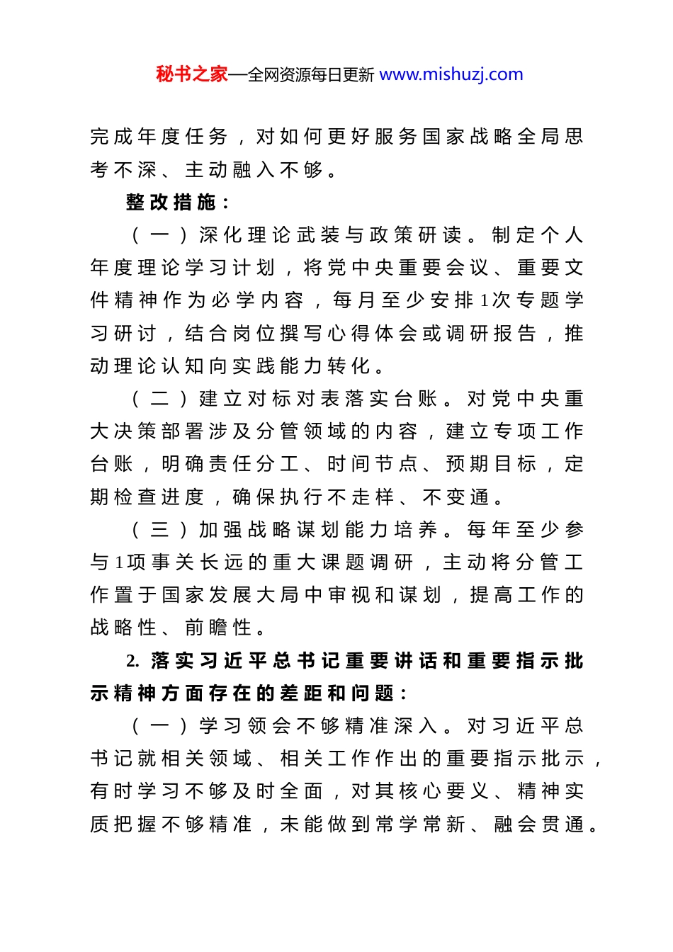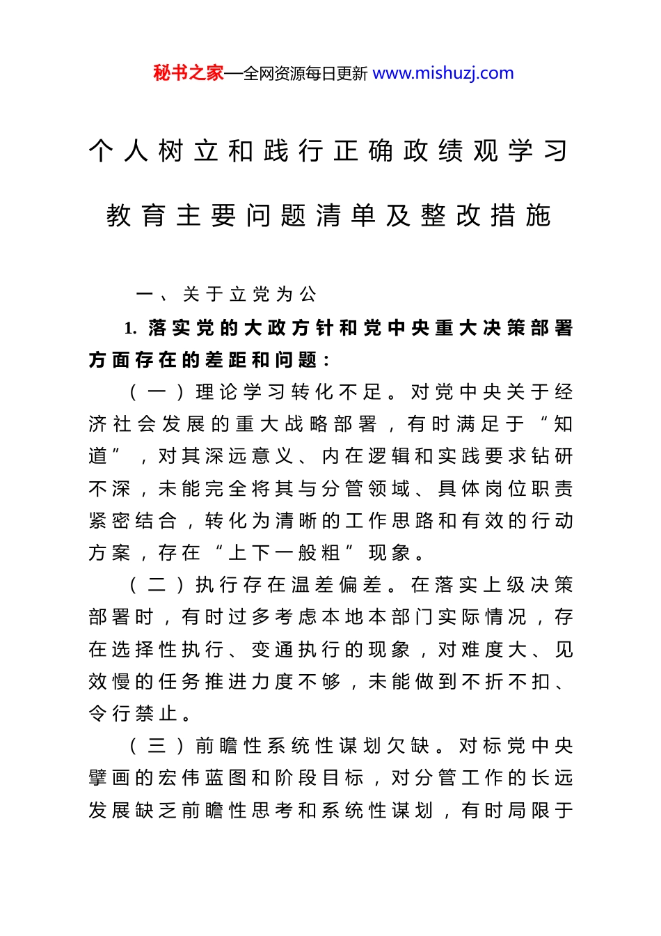 秘书之家—全网资源每日更新 www.mishuzj.com个 人 树 立 和 践 行 正 确 政 绩 观 学 习教 育 主 要 问 题 清 单 及 整 改 措 施一 、 关 于 立 党 为 公1. 落 实 党 的 大 政 方 针 和 党 中 央 重 大 决 策 部 署方 面 存 在 的 差 距 和 问 题 :( 一 ) 理 论 学 习 转 化 不 足 。 对 党 中 央 关 于 经济 社 会 发 展 的 重 大 战 略 部 署 , 有 时 满 足 于 “ 知道 ” , 对 其 深 远 意 义 、 内 在 逻 辑 和 实 践 要 求 钻 研不 深 , 未 能 完 全 将 其 与 分 管 领 域 、 具 体 岗 位 职 责紧 密 结 合 , 转 化 为 清 晰 的 工 作 思 路 和 有 效 的 行 动方 案 , 存 在 “ 上 下 一 般 粗 ” 现 象 。( 二 ) 执 行 存 在 温 差 偏 差 。 在 落 实 上 级 决 策部 署 时 , 有 时 过 多 考 虑 本 地 本 部 门 实 际 情 况 , 存在 选 择 性 执 行 、 变 通 执 行 的 现 象 , 对 难 度 大 、 见效 慢 的 任 务 推 进 力 度 不 够 , 未 能 做 到 不 折 不 扣 、令 行 禁 止 。( 三 ) 前 瞻 性 系 统 性 谋 划 欠 缺 。 对 标 党 中 央擘 画 的 宏 伟 蓝 图 和 阶 段 目 标 , 对 分 管 工 作 的 长 远发 展 缺 乏 前 瞻 性 思 考 和 系 统 性 谋 划 , 有 时 局 限 于秘书之家—全网资源每日更新 www.mishuzj.com完 成 年 度 任 务 , 对 如 何 更 好 服 务 国 家 战 略 全 局 思考 不 深 、 主 动 融 入 不 够 。整 改 措 施 :( 一 ) 深 化 理 论 武 装 与 政 策 研 读 。 制 定 个 人年 度 理 论 学 习 计 划 , 将 党 中 央 重 要 会 议 、 重 要 文件 精 神 作 为 必 学 内 容 , 每 月 至 少 安 排 1 次 专 题 学习 研 讨 , 结 合 岗 位 撰 写 心 得 体 会 或 调 研 报 告 , 推动 理 论 认 知 向 实 践 能 力 转 化 。( 二 ) 建 立 对 标 对 表 落 实 台 账 。 对 党 中 央 重大 决 策 部 署 涉 及 分 管 领 域 的 内 容 , 建 立 专 项 工 作台 账 , 明 确 责 任 分 工 、 时 间 节 点 、 预 期 目 标 , 定期 检 查 进 度 , 确 保 执 行 不 走 样 、 不 变 通 。( 三 ) 加 强 战 略 谋 划 能 力 培 养 。 每 年 至 少 参与 1 项 事 关 长 远 的 重 大 课 题 调 研 , 主 动 将 分 管 工作 置 于 国 家 发 展 大 局 中 审 视 和 谋 划 , 提 高 工 作 的战 略 性 、 前 瞻 性 。2. 落 实 习 近 平 总 书 记 重 要 讲 话 和 重 要 指 示 批示 精 神 方 面 存 在 的 差 距 和 问 题 :( 一 ) 学 习 领 会 不 够 精 准 深 入 。 对 习 近 平 总书 记 就 相 关 领 域 、 相 关 工 作 作 出 的 重 要 指 示 批 示 ,有 时 学 习 不 够 及 时 全 面 , 对 其 核 心 要 义 、 精 神 实质 把 握 不 够 精 准 , 未 能 做 到 常 学 常 新 、 融 会 贯 通 。秘书之家—全网资源每日更新 www.mishuzj.com( 二 ) 贯 彻 落 实 缺 乏 一 抓 到 底 的 韧 劲 。 对 上级 交 办 的 、 涉 及 习 近 平 总 书 记 重 要 指 示 批 示 精 神落 实 的 具 体 任 务 , 有 时 存 在 “ 开 头 紧 、 后 面 松 ”的 情 况 , 持 续 跟 踪 问 效 不 够 , 未 能 确 保 事 事 有 回音 、 件 件 有 着 落 。( 三 ) 结 合 实 际...