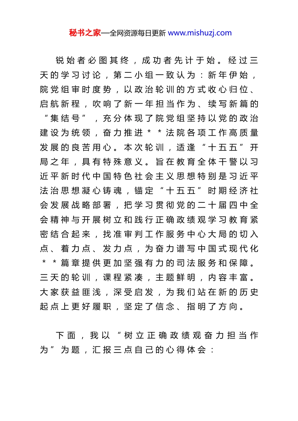 秘书之家—全网资源每日更新 www.mishuzj.com锐 始 者 必 图 其 终 , 成 功 者 先 计 于 始 。 经 过 三天 的 学 习 讨 论 , 第 二 小 组 一 致 认 为 : 新 年 伊 始 ,院 党 组 审 时 度 势 , 以 政 治 轮 训 的 方 式 收 心 归 位 、启 航 新 程 , 吹 响 了 新 一 年 担 当 作 为 、 续 写 新 篇 的“ 集 结 号 ” , 充 分 体 现 了 院 党 组 坚 持 以 党 的 政 治建 设 为 统 领 , 奋 力 推 进 * * 法 院 各 项 工 作 高 质 量发 展 的 良 苦 用 心 。 本 次 轮 训 , 适 逢 “ 十 五 五 ” 开局 之 年 , 具 有 特 殊 意 义 。 旨 在 教 育 全 体 干 警 以 习近 平 新 时 代 中 国 特 色 社 会 主 义 思 想 特 别 是 习 近 平法 治 思 想 凝 心 铸 魂 , 锚 定 “ 十 五 五 ” 时 期 经 济 社会 发 展 战 略 部 署 , 把 学 习 贯 彻 党 的 二 十 届 四 中 全会 精 神 与 开 展 树 立 和 践 行 正 确 政 绩 观 学 习 教 育 紧密 结 合 起 来 , 找 准 审 判 工 作 服 务 中 心 大 局 的 切 入点 、 着 力 点 、 发 力 点 , 为 奋 力 谱 写 中 国 式 现 代 化* * 篇 章 提 供 更 加 坚 强 有 力 的 司 法 服 务 和 保 障 。三 天 的 轮 训 , 课 程 紧 凑 , 主 题 鲜 明 , 内 容 丰 富 。大 家 获 益 匪 浅 , 深 受 启 发 , 为 我 们 站 在 新 的 历 史起 点 上 更 好 履 职 , 坚 定 了 信 念 、 指 明 了 方 向 。下 面 , 我 以 “ 树 立 正 确 政 绩 观 奋 力 担 当 作为 ” 为 题 , 汇 报 三 点 自 己 的 心 得 体 会 :秘书之家—全网资源每日更新 www.mishuzj.com一 、 坚 定 理 想 信 念 , 铸 牢 对 党 忠 诚 。作 为 一 名 党 员 法 官 , 自 觉 主 动 加 强 政 治 理 论学 习 , 坚 持 不 懈 提 升 党 性 修 养 , 不 断 提 高 自 身 政治 判 断 力 、 政 治 领 悟 力 、 政 治 执 行 力 , 是 确 保 刑事 审 判 工 作 正 确 政 治 方 向 的 根 本 前 提 。 我 们 要 坚决 扛 起 肩 负 的 政 治 责 任 , 切 实 把 党 的 事 业 、 人 民利 益 、 宪 法 和 法 律 的 要 求 , 更 加 自 觉 主 动 地 融 入司 法 审 判 的 具 体 工 作 当 中 , 努 力 践 行 “ 善 于 从 政治 上 看 , 精 于 从 法 治 上 办 ” , 以 优 质 高 效 的 司 法成 果 厚 植 党 的 执 政 根 基 。二 、 挺 膺 担 当 , 做 好 党 和 人 民 的 “ 刀 把 子 ” 。刑 事 审 判 工 作 是 政 法 工 作 中 重 要 的 组 成 部 分 ,是 我 们 党 治 国 理 政 的 重 要 抓 手 , 也 是 党 和 人 民 手中 的 “ 刀 把 子 ” 。 作 为 刑 事 法 官 , 既 是 法 治 工 作的 参 与 者 、 践 行 者 , 同 时 也 是 良 法 善 治 的 受 益 者 、传 播 者 。 我 们 要 坚 定 不 移 贯 彻 总 体 国 家 安 全 观 ,依 法 严 厉 打 击 颠 覆 分 裂 、 渗 透 破 坏 、 间 谍 窃 密 等犯 罪 , 确 保 国 家 政 权 安 全 、 制 度 安 全 、 意 识 形 态安 全 。 依 法 严 惩 群 众 反 映 强 烈 的 黄 赌 毒 、 食 药 环 、盗 抢 骗 、 危 害 生 产 安 全 等 突 出 违 法 犯 罪 , 切 实 保障 人 民 安 居 乐 业 。 准 确 理 解 和 严 格 把 握 宽 ...